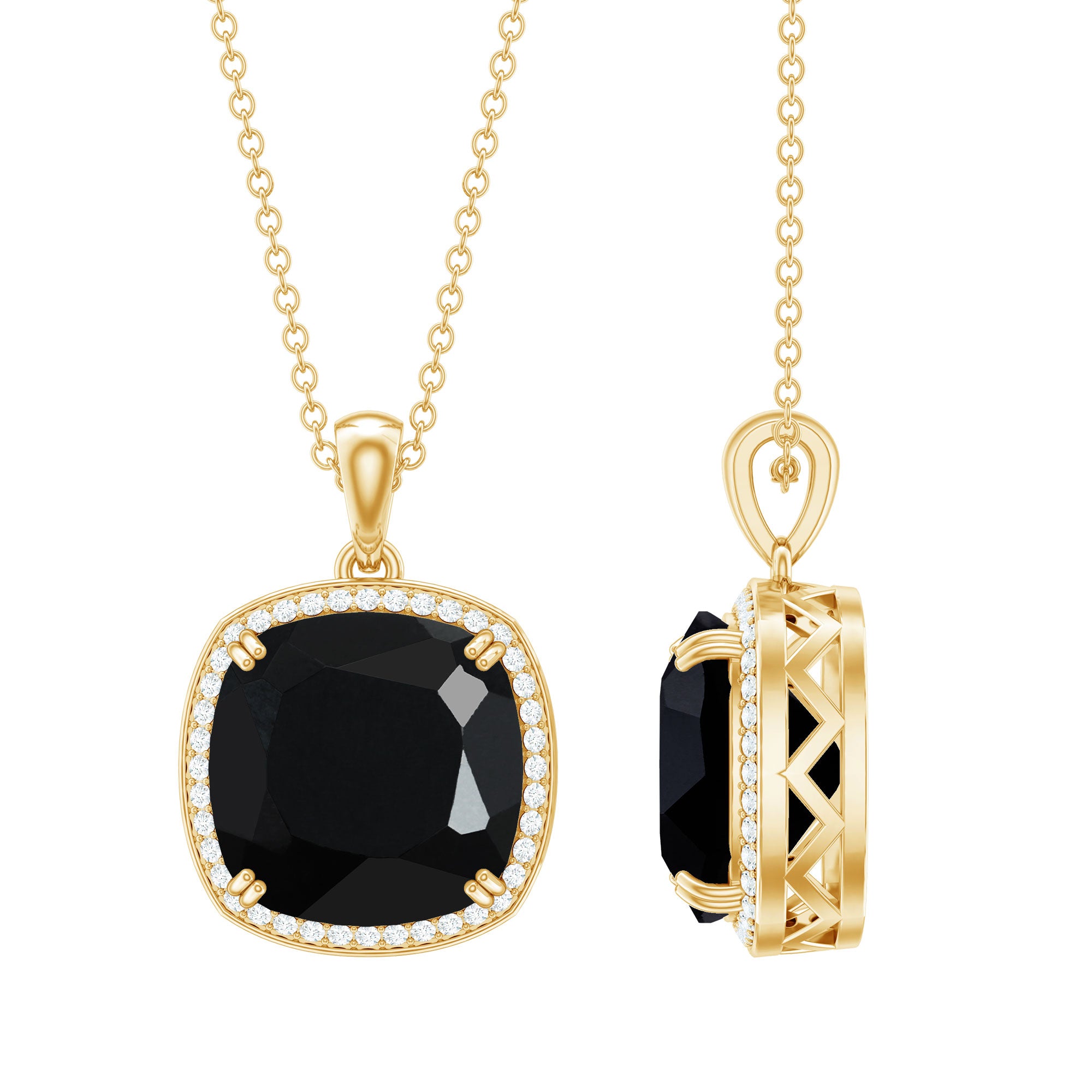 This exquisite Lab Grown Black Diamond Necklace adds a touch of grace to every look. It features a 12 MM Cushion Cut Lab Created Black Diamond beautifully secured in Prong setting encircled by a halo frame of Moissanite, which is a perfect blend of sophistication and style. This Halo Pendant exudes an unmatchable shine of AAAA Quality Lab Cultured Black Diamond and D-VS1 quality moissanite stones. The Cocktail Necklace will make everyone awestruck with its magical allure. Create your style when you adorn it and get ready to hear a lot of compliments. Its huge center stone is ideal for cocktail parties, evening gatherings, and any event where you want your jewelry to shine. While it is striking, the design stays classy, allowing you to match it with both formal attire and trendy everyday looks. Delivered in a beautiful jewelry box, this Black and White Necklace is perfect for gifting or for indulging yourself with a piece that adds confidence, allure, and remarkable brilliance every time you wear it.
