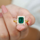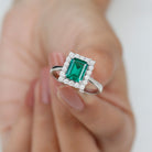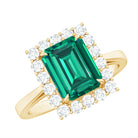 Lab Grown 7X9 mm Emerald Cut Emerald Vintage Engagement Ring with Diamond Halo