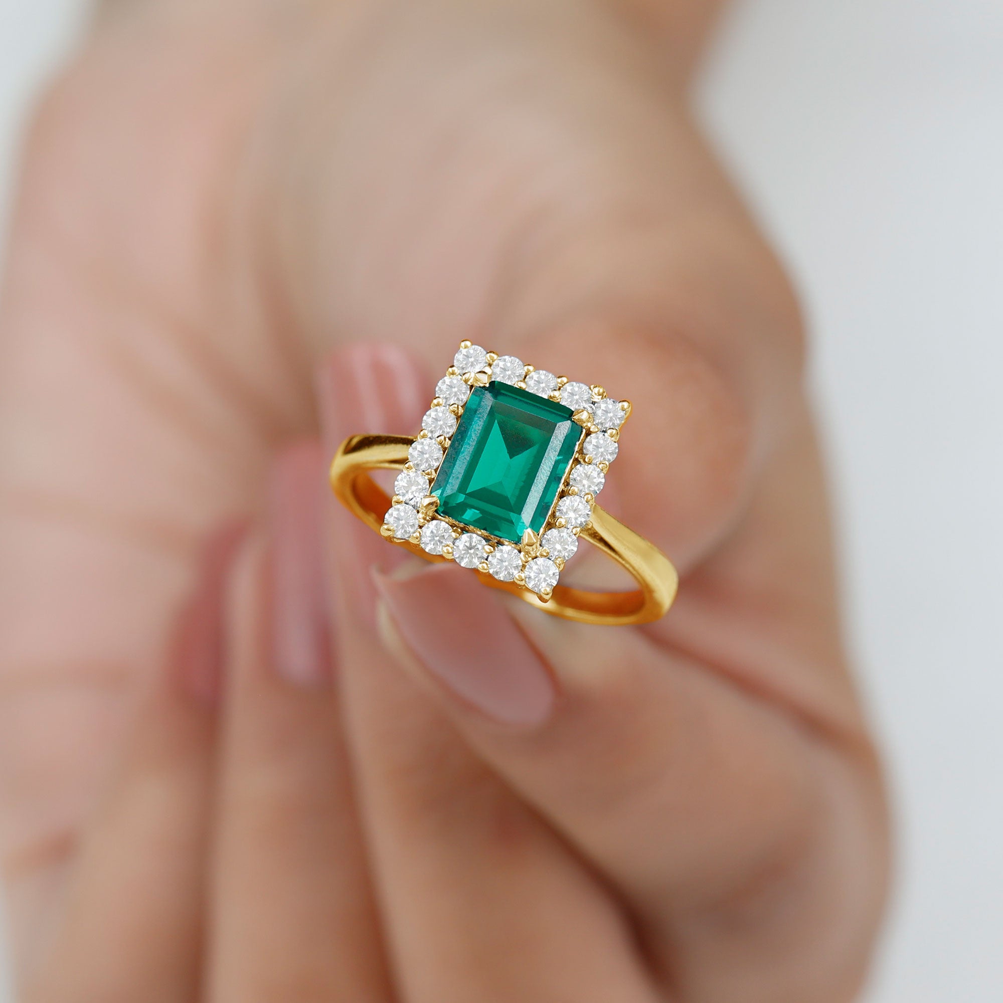 Make a lasting impression with this stunning Vintage Inspired Engagement Ring. The striking 7X9 mm Emerald Cut Lab Created Emerald sits at the center in Claw Setting, showcasing a deep green hue that radiates sophistication and timeless charm. Surrounding the center stone is a sparkling Diamond Halo, carefully crafted to enhance the brilliance of the Lab Emerald while adding a touch of vintage elegance. Every detail is thoughtfully designed to create a sense of nostalgia and refined beauty. The Lab Grown Emerald is known for its lush green hue, while the Diamond Halo represents eternal love and unbreakable commitment. Perfect for those who appreciate unique and meaningful designs, this Emerald Cut Engagement Ring blends vintage charm with sustainable luxury. Whether chosen for a proposal or as a special gift, this Emerald Diamond Engagement Ring is sure to be a treasured piece for generations. Available in various ring sizes and presented in a Signature Jewelry Box, this Lab Grown Emerald Ring is a timeless expression of your love.