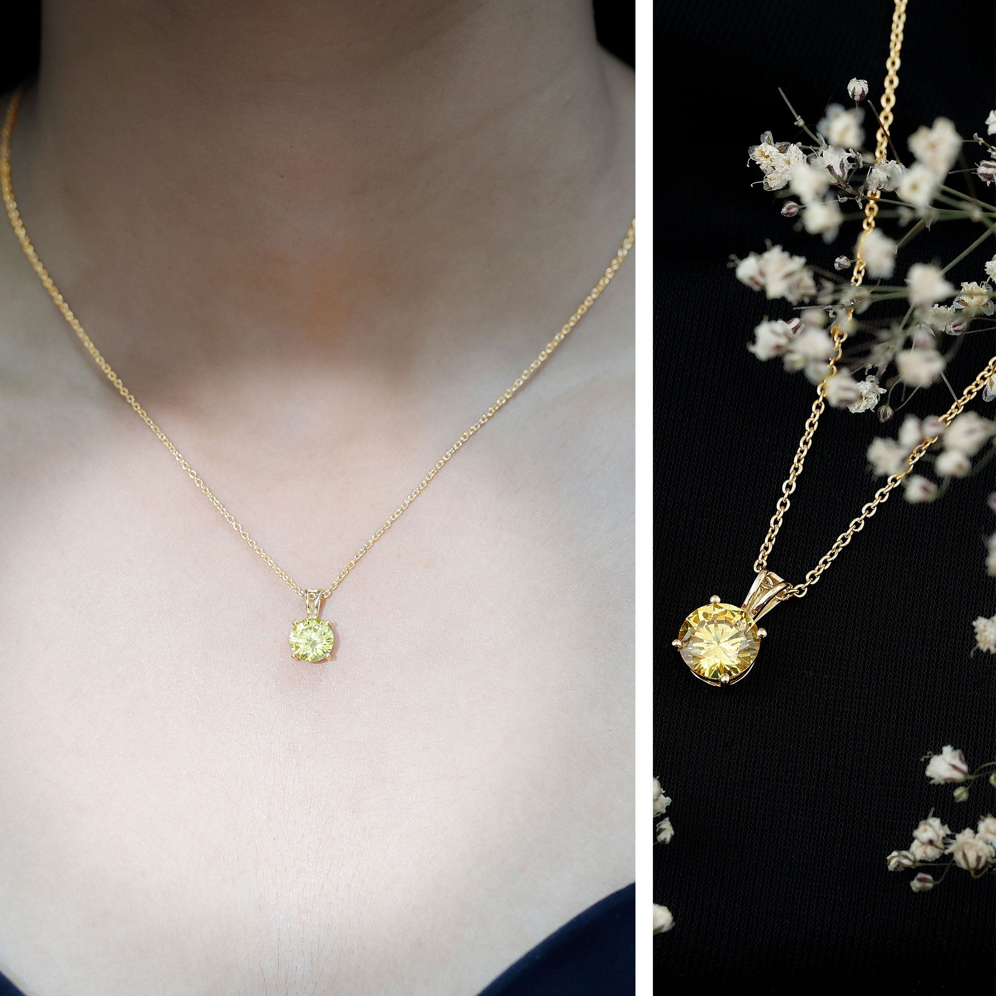 Adorn your neck with the mesmerizing beauty of this classic Solitaire Pendant Necklace, embellished with a sparkling 8 MM round shaped lab created yellow sapphire of AAAA Quality, set in secure prong setting. This stunning Yellow Sapphire Necklace features a sleek bail and hangs from a cable chain, secured with a lobster clasp for easy length adjustment. If you are looking for a jewelry piece that you can wear every single day and never get tired of, this is it. Classic, effortless, and stunning, this Simple Pendant is handcrafted in high quality metal and comes with a certificate of gemstone authentication.