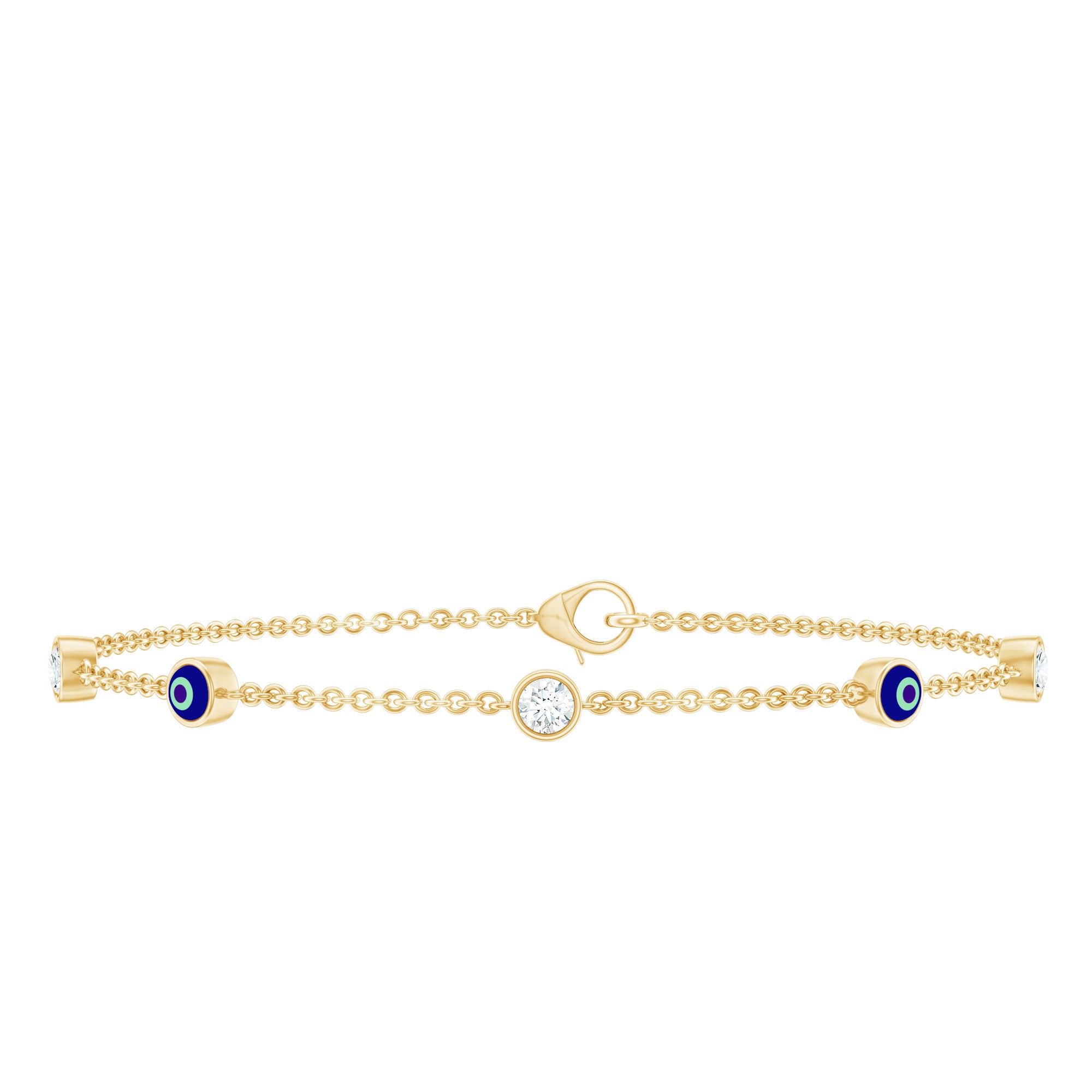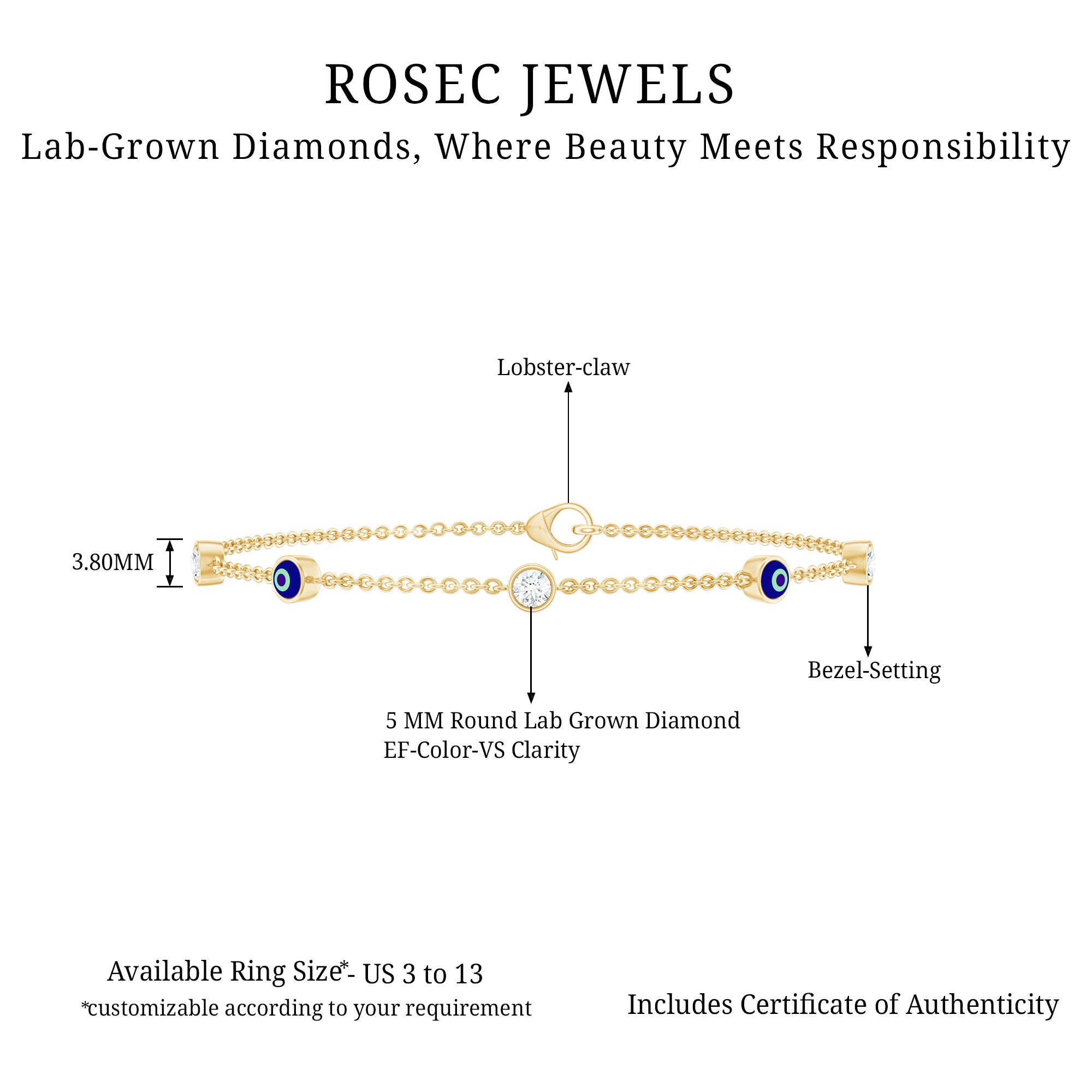 Defend yourself from negativity with this captivating Diamond Evil Eye Bracelet, representing both protection and timeless elegance. This bracelet features 5 MM round cut lab-grown diamonds set in bezel setting, alternating with evil eye designs on a metal chain, secured with a lobster clasp for a reliable fit. Made with meticulous care and attention to detail, this Womens Evil Eye Bracelet also serves as a wonderful gift for someone special, offering a barrier against negative energies. As a universal symbol of protection, this Bezel Set Diamond Bracelet complements your outfit beautifully. The protective power of an Evil Eye bracelet signifies spiritual safeguarding. As a representation of protection and good fortune, this Turkish Eye Bracelet carries profound cultural importance and is a stunning, meaningful accessory that invites positivity into your life.