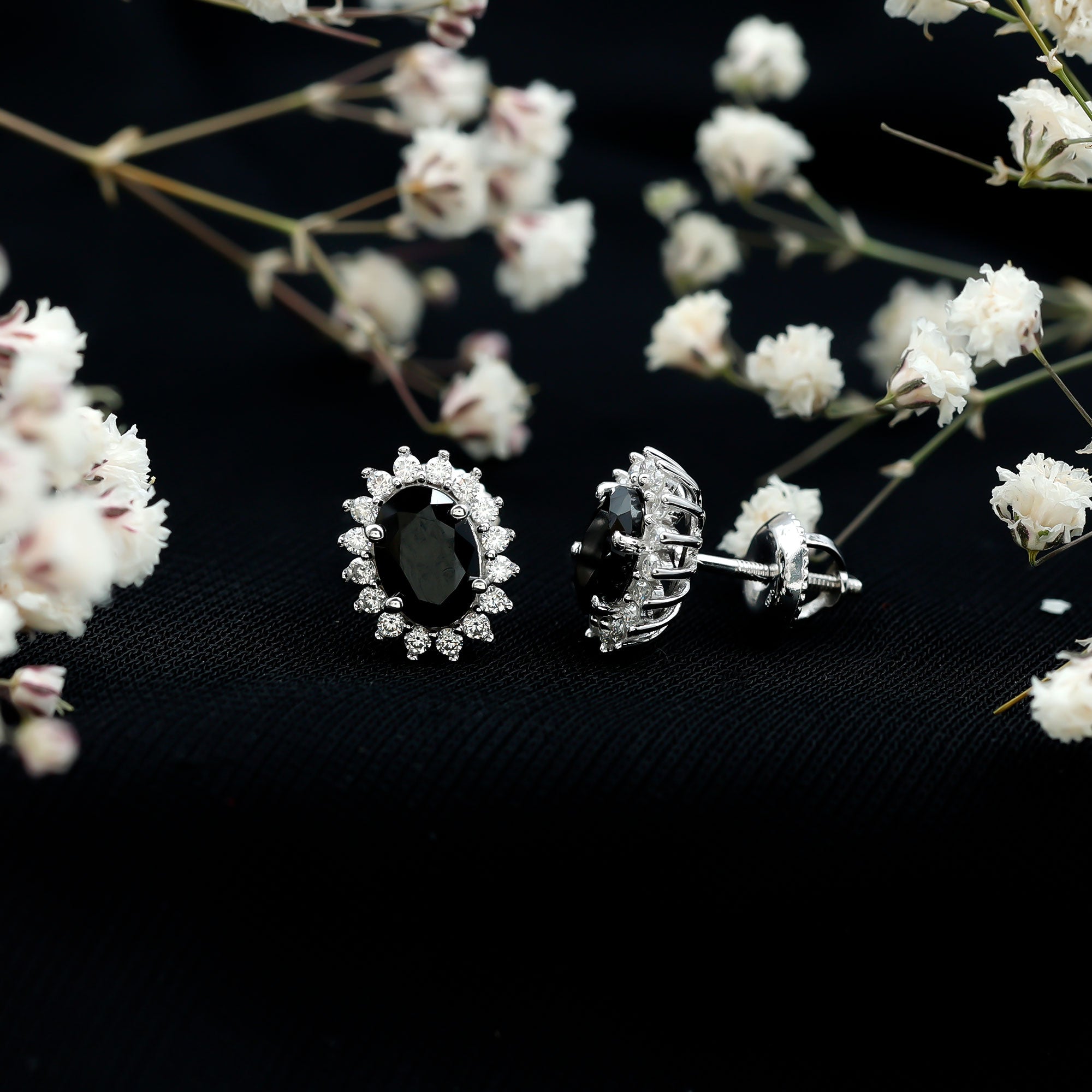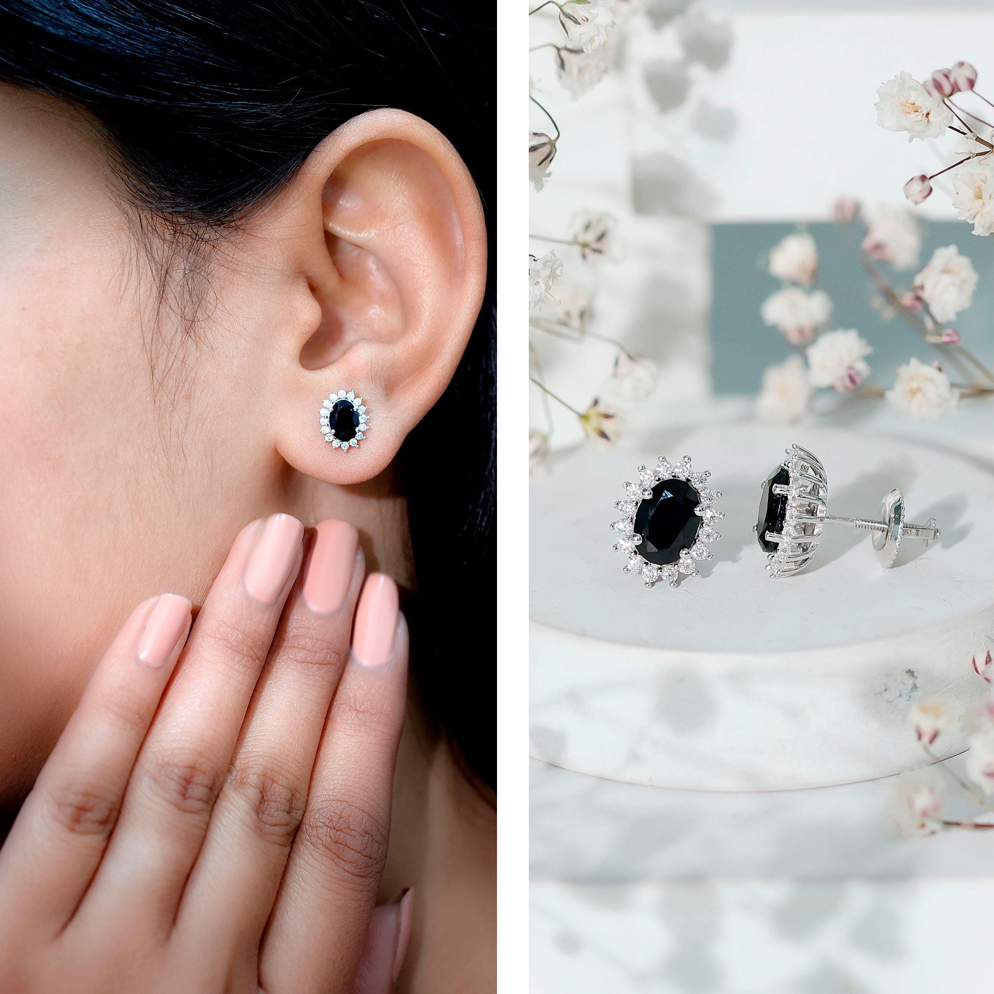 These stunning Black and White Earrings are a temptation you will find hard to resist, these statement makers are sure to steal the spotlight. Feel like royalty with this gemstone-encrusted piece featuring approximately 3 carats of total stone weight. The 5X7 MM Oval Cut Black Diamonds (lab-created) offer a striking contrast to the certified round brilliant moissanite stones that encircle them. With a unique and edgy design, these Oval Studs serve as a fantastic alternative to everyday diamond earrings. Made from 14K White Gold Plated Silver, these Stud Earrings embody a timeless style and beauty. Their classic elegance makes them a cherished everyday accessory for years to come. Experience the enchanting allure of these remarkable Earrings with Screw on Backs that command attention with their captivating presence. Elevate your look with this timeless piece, showcasing AAAA Quality Black Diamond and D-Vs1 Quality Moissanite, radiating brilliance. These Lab Grown Black Diamond Earrings, with their stately yet alluring design, will add sophistication to your look.