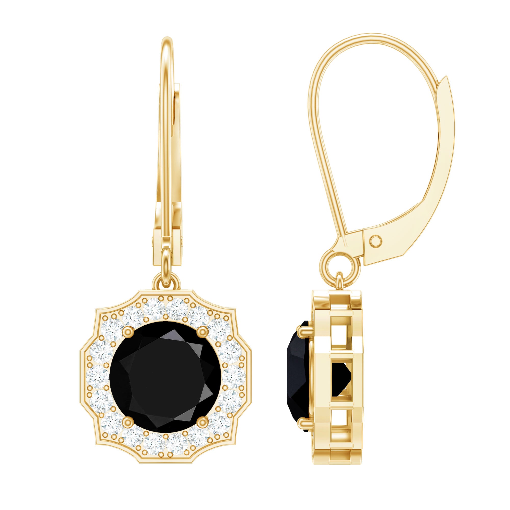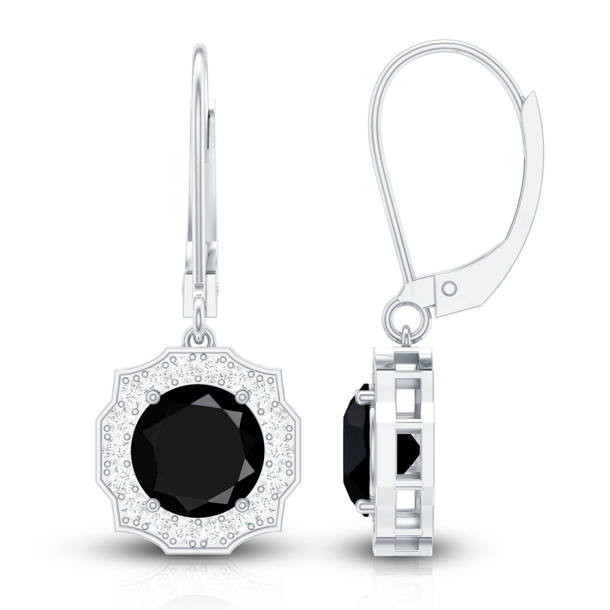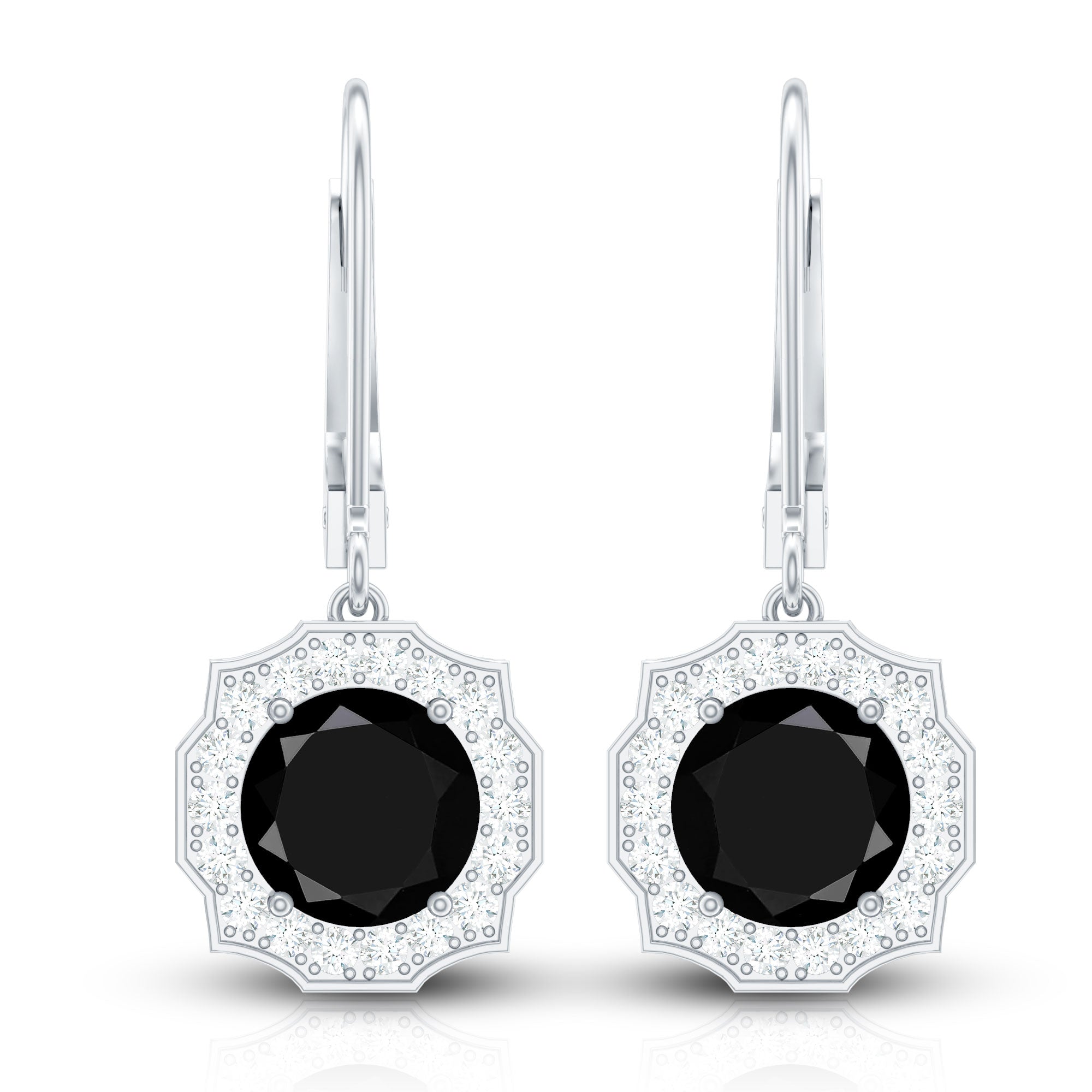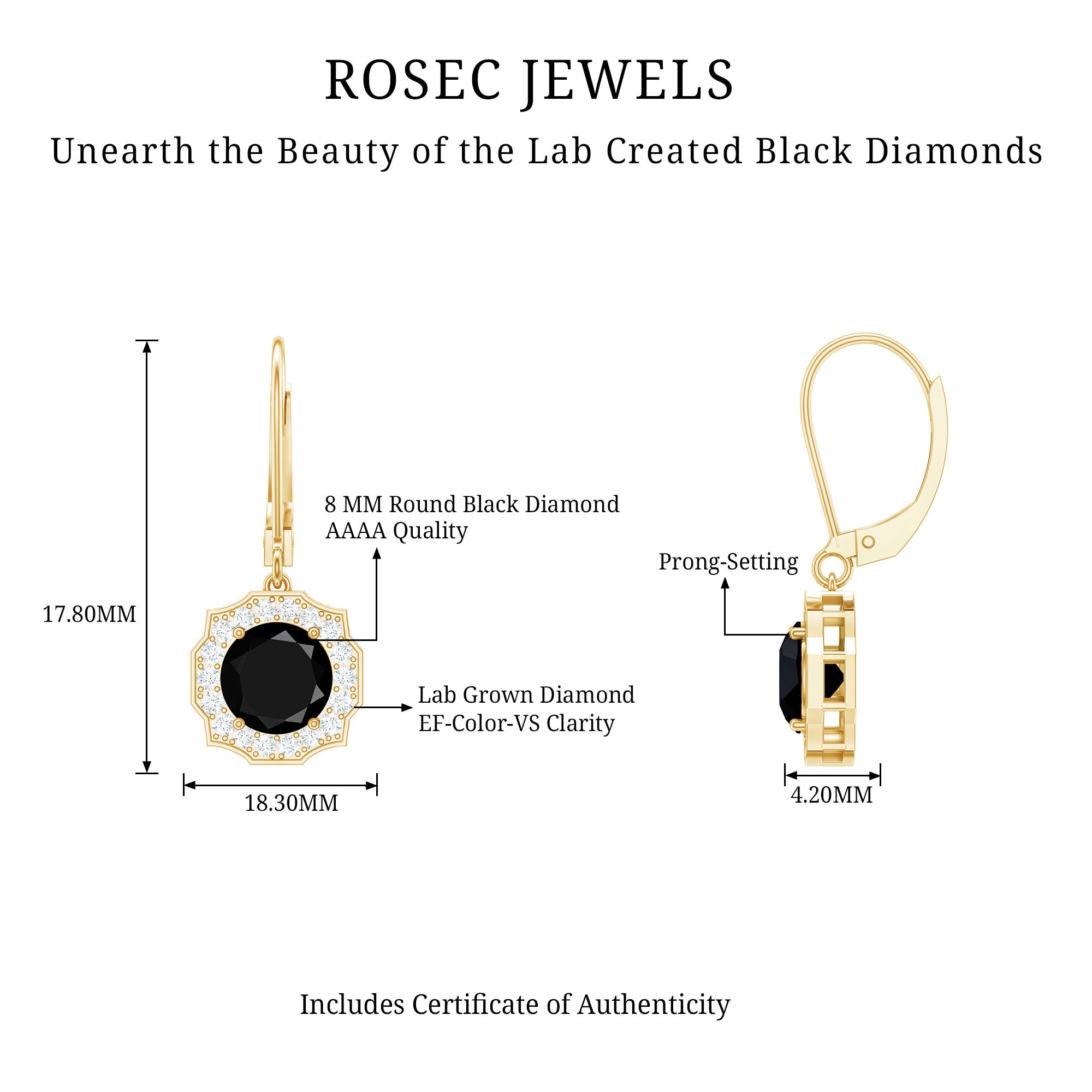 Highlight your elegance with these lab created Black and White Diamond Earrings. Crafted with perfection and attention to detail, these Halo Earrings showcase the mesmerizing allure of 8 mm Round Shape Black Diamond of Aaaa quality, surrounded by a shimmering halo of White Diamond gemstones of Ef-Vs quality, capturing the essence of timeless beauty. The Lever Back Closure ensures a secure and comfortable fit, allowing you to shine with confidence. The gemstones in these Diamond Drop Earrings carry a total weight of 5 carats, whether as a gift for bride to be or a Valentines Day gift for your lady love these Black Diamond Earrings will sure to capture their heart. Elevate your style with these stunning April Birthstone Earrings from Rosec Jewels, where craftsmanship meets luxury.