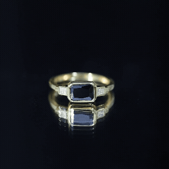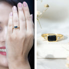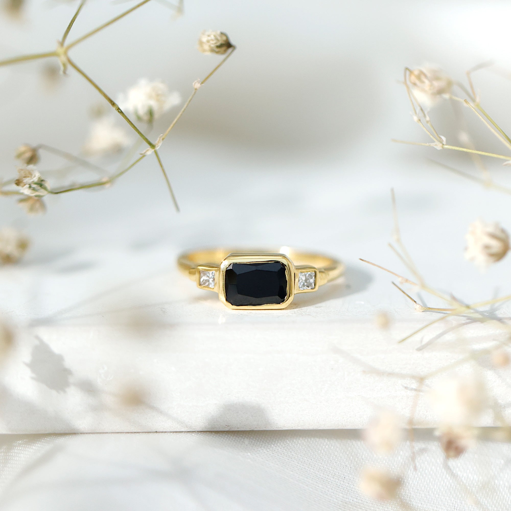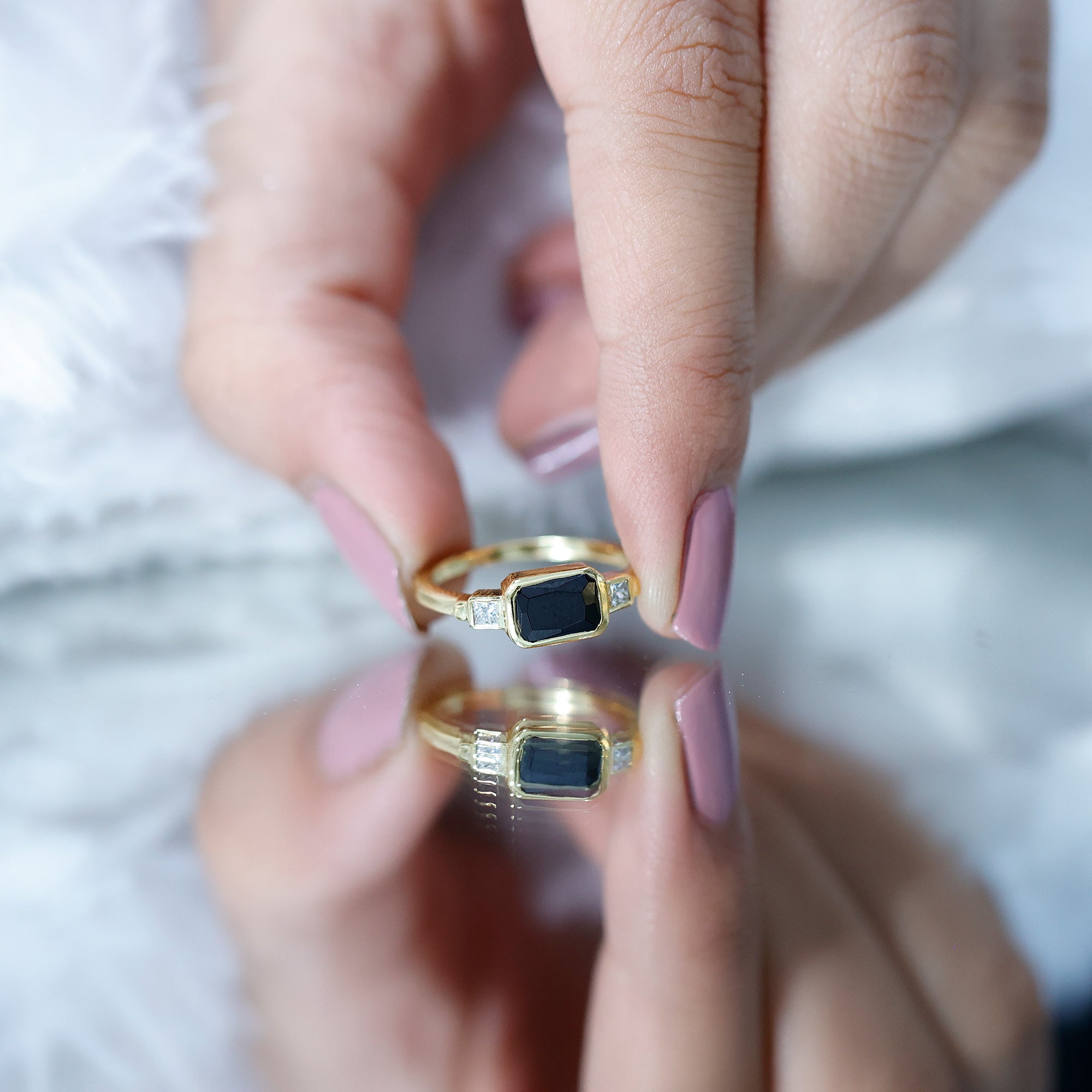Break away from the ordinary with this bold and modern Emerald Cut Black Diamond Ring, thoughtfully designed for the women who appreciates sleek style, and meaningful details. Crafted in durable 14k yellow gold plated silver, this East West Ring features a striking 5X7 MM emerald cut lab created black diamond, set horizontally for a contemporary twist on a classic look. On either side of the center stone, princess cut lab grown white diamonds add subtle brilliance, enhancing the richness of the black diamond. All stones are securely held in a smooth bezel setting, offering both comfort and durability for everyday wear. Whether you are marking a new chapter in your love story, celebrating an anniversary, or making a promise that matters, this Black and White Diamond Engagement Ring is a modern symbol of loyalty and strength. Ethical and sustainable, with AAAA quality lab created black diamond and EF-VS quality lab grown white diamonds, this East West Emerald Cut Ring also reflects mindful choices without compromising on elegance. Comes packaged in a signature gift box, our Womens Black Diamond Engagement Ring is ready for the moment that means everything.