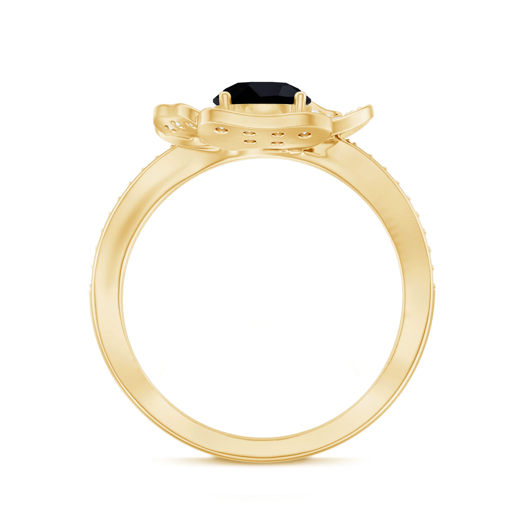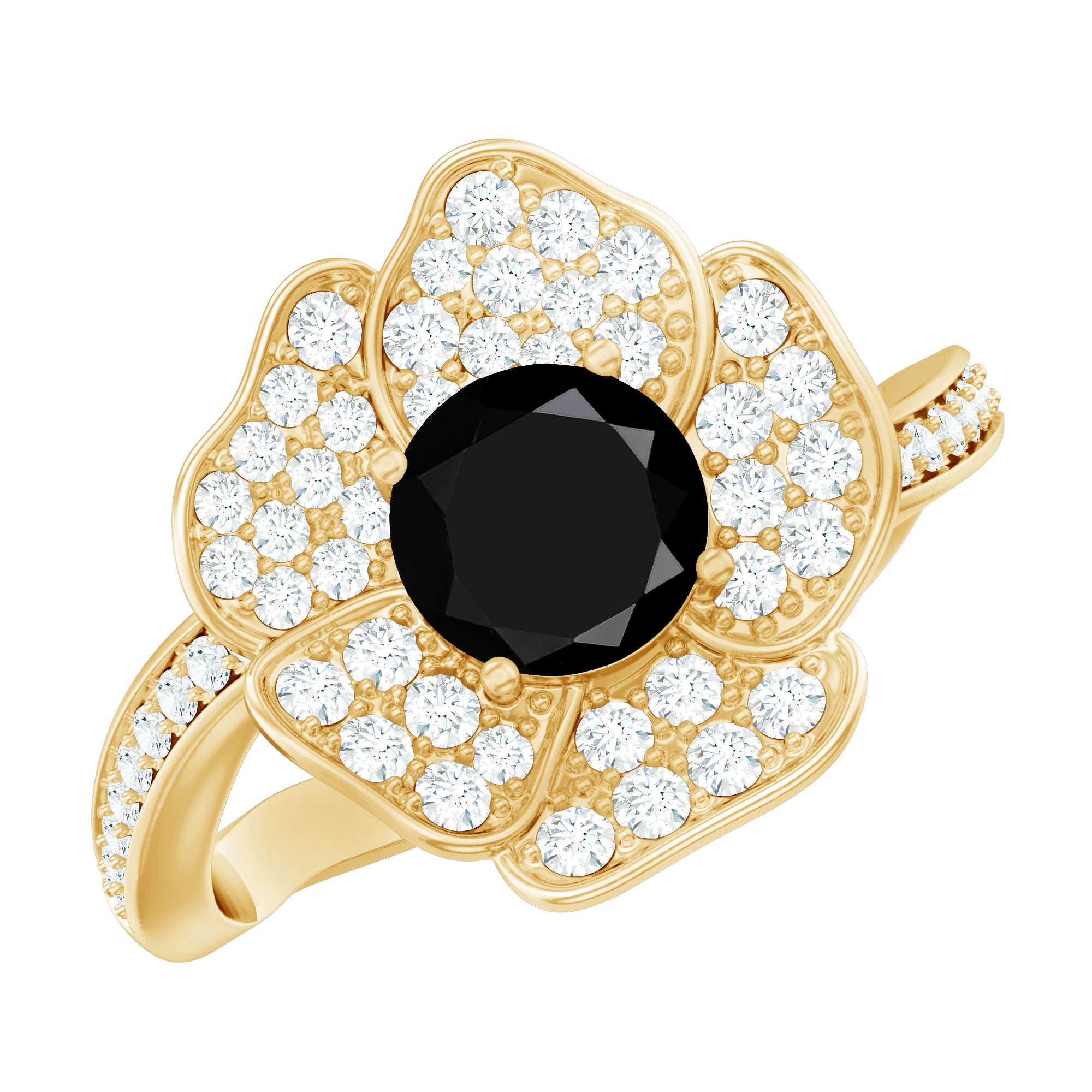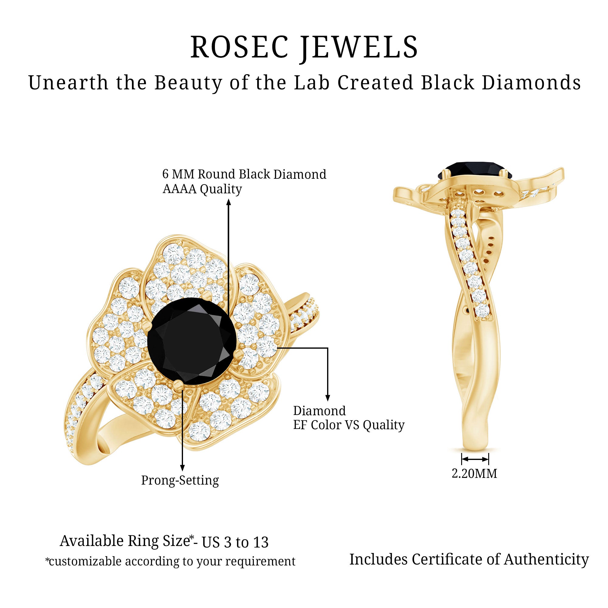 Embark on a journey of everlasting love with this Floral Engagement Ring. This exquisite piece seamlessly marries natures elegance with modern sophistication. The 6 mm Round Shape Black Diamond (Lab Created) is surrounded by delicately crafted floral petals adorned with White Lab Grown Diamond gemstones also, graces the band with their sparkle, symbolizing the timeless beauty of your commitment. Designed with elegance, this lab grown Black Diamond Engagement Ring is perfect for celebrating a bond that will last forever. Whether you are starting a new chapter together or looking for the way to express your commitment, this Black and White Diamond ring will forever remind you of the love you share.