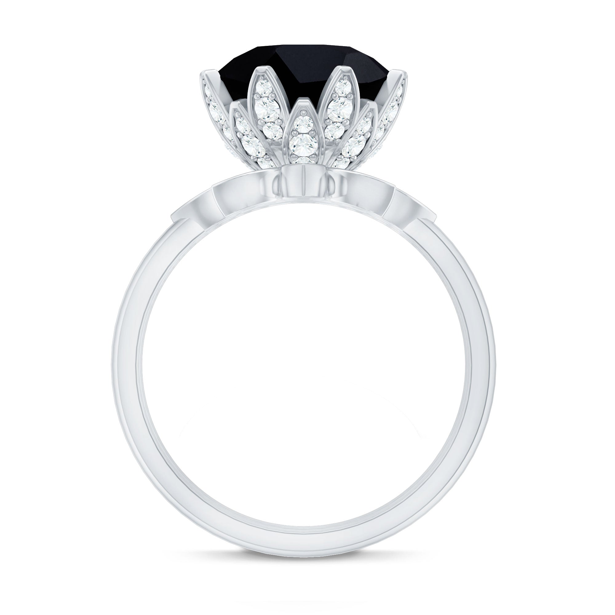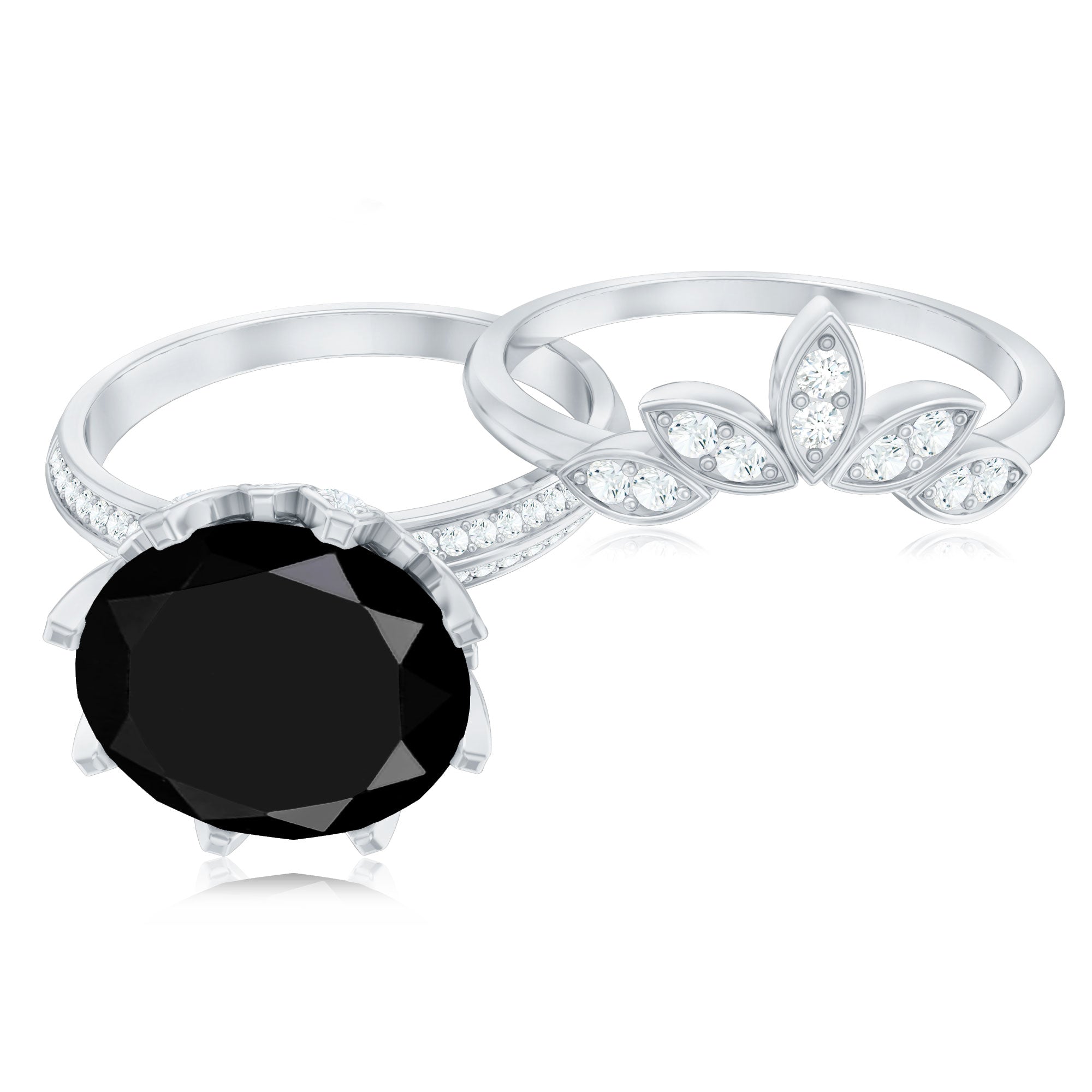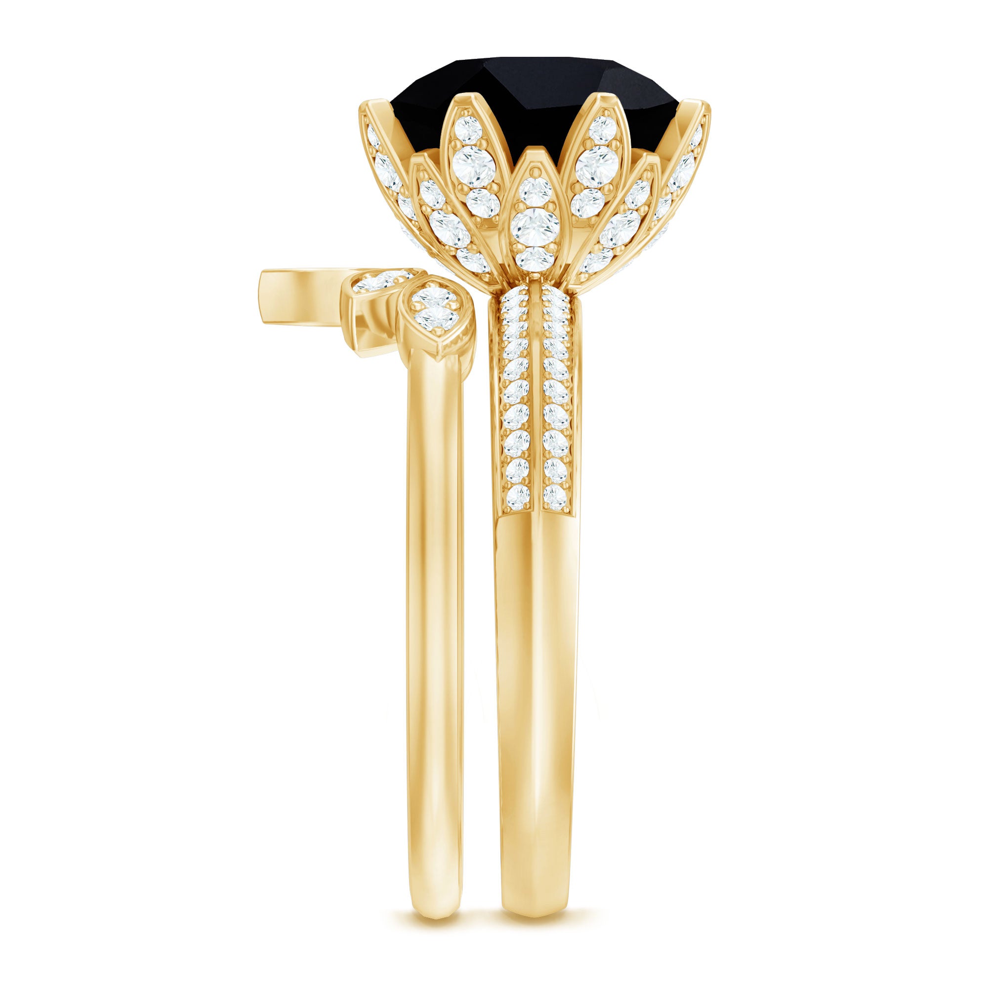 Be captivated by the allure of this exquisite Lab Created Black Diamond Wedding Ring Set, designed to leave her spellbound. The striking black stone is a truly magnificent choice to commemorate your special day, just like the enchanting Flower Wedding Ring Set. This delightful Stacking Floral Bridal Ring Set features 10mm Round Shape Lab Black Diamond nestled within a floral design, complete with intricate petal details adorned with Moissanite. The shank of the ring is embellished with Round brilliant cut Moissanite, accompanied by a matching chevron leaf-shaped band also adorned with Moissanite.