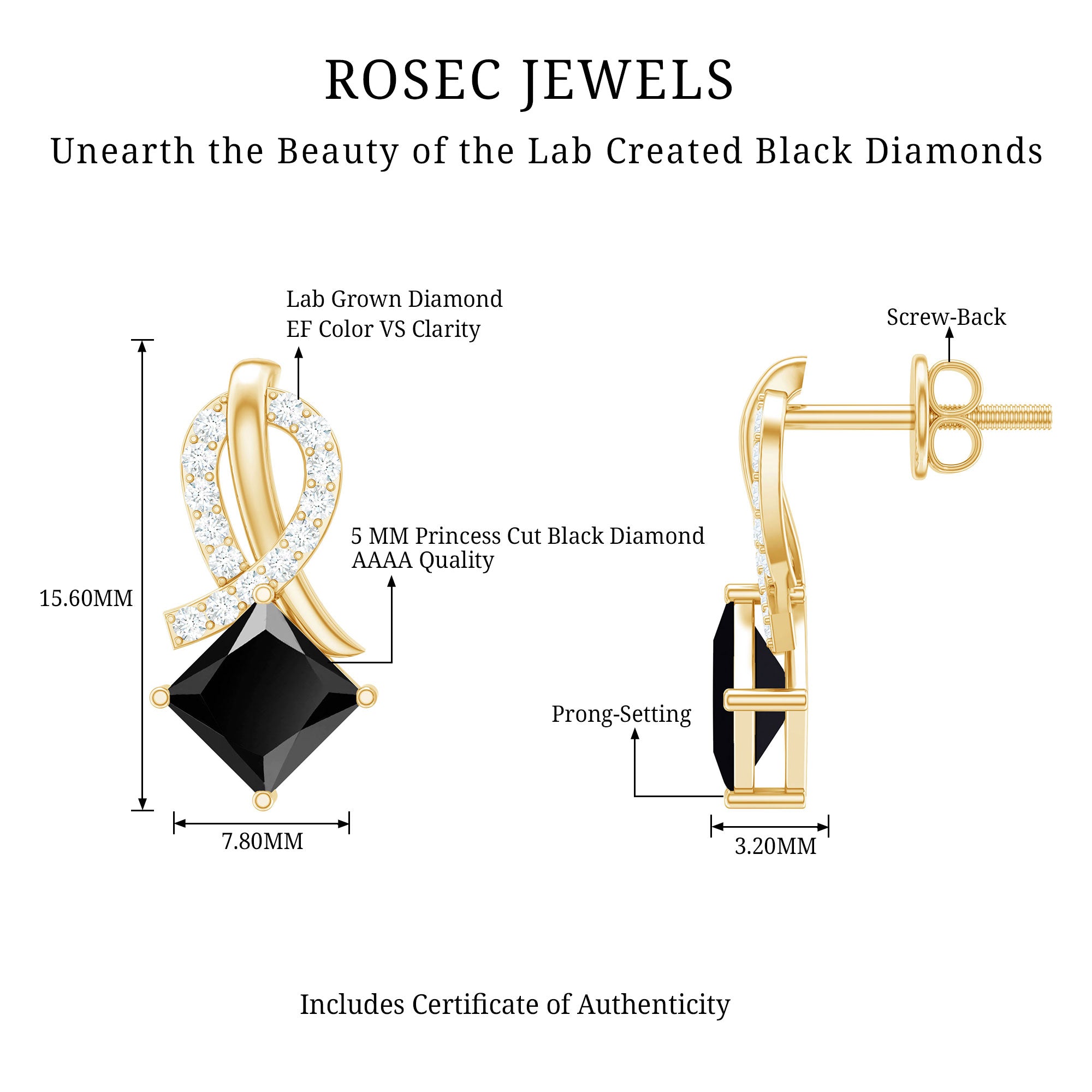 You arent meant to settle for ordinary; you were born to shine extraordinarily! Try our Lab Created Black Diamond Stud Earrings, the perfect blend of sophistication and style. This exquisite monochrome piece showcases a 6x6 mm Princess Cut Lab Created Black Diamond shimmering at the bottom, while the top of these Diamond Studs is meticulously crafted to dazzle with Round Lab Grown Diamond adorning the metal. Embrace your uniqueness and radiate confidence with astonishing sparkle of Aaaa Quality Black Diamond and Ef-Vs Quality Diamond, and let your exceptional light illuminate every moment with these minimal Black Diamond Studs.
