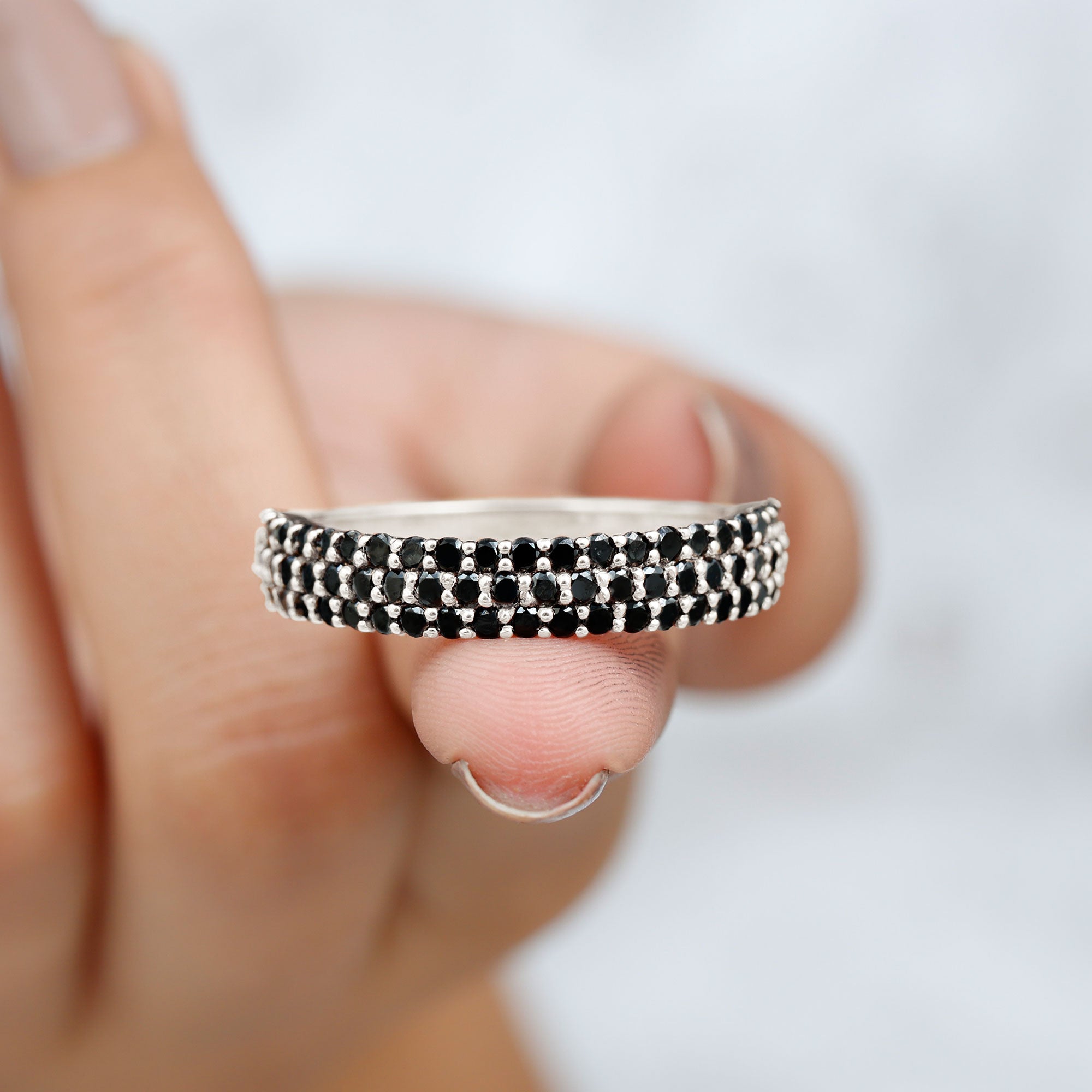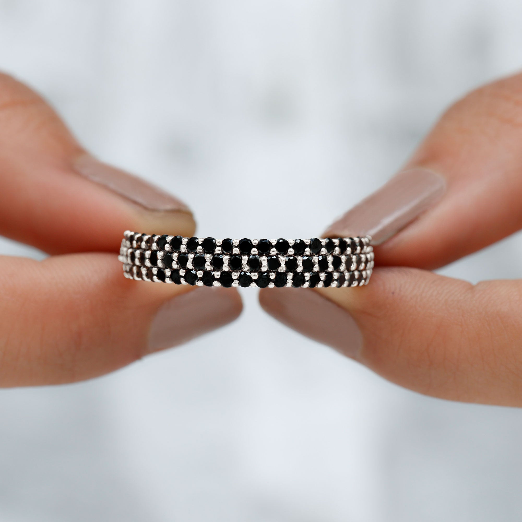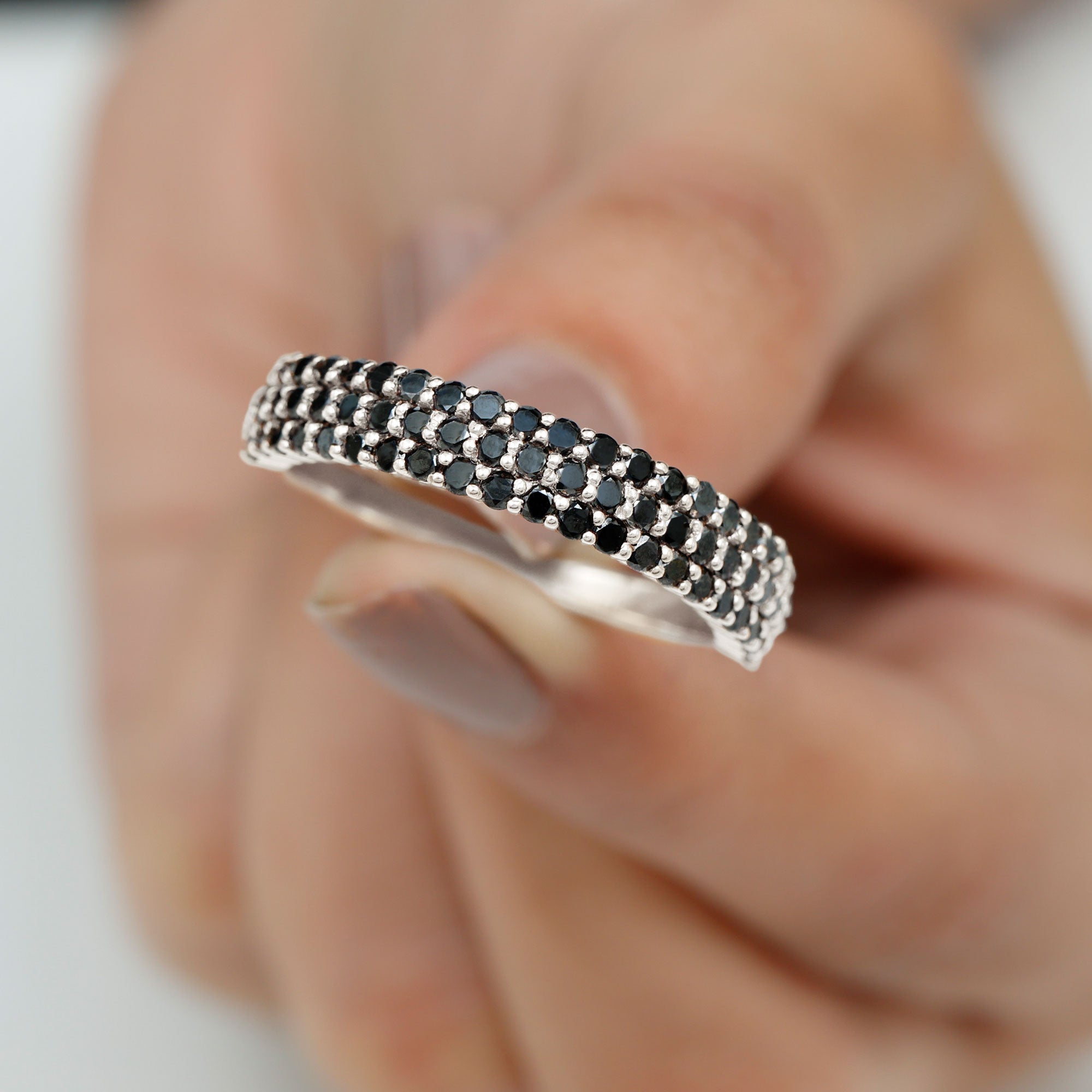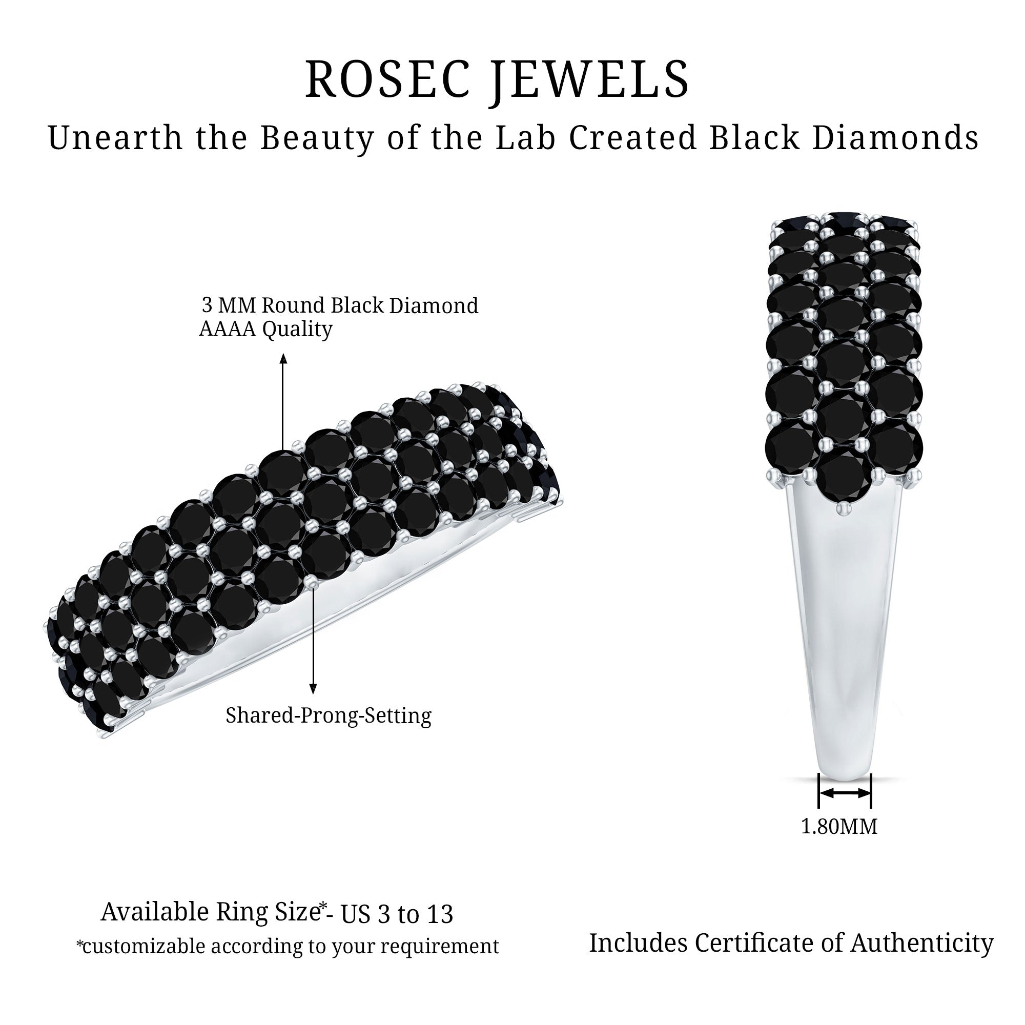 Elegantly adorned with Round Cut Lab Grown Black Diamonds in a Shared Prong Setting, this dazzling created Black Diamond Wedding Band Ring is a cherished piece of jewelry that shell adore for a lifetime.