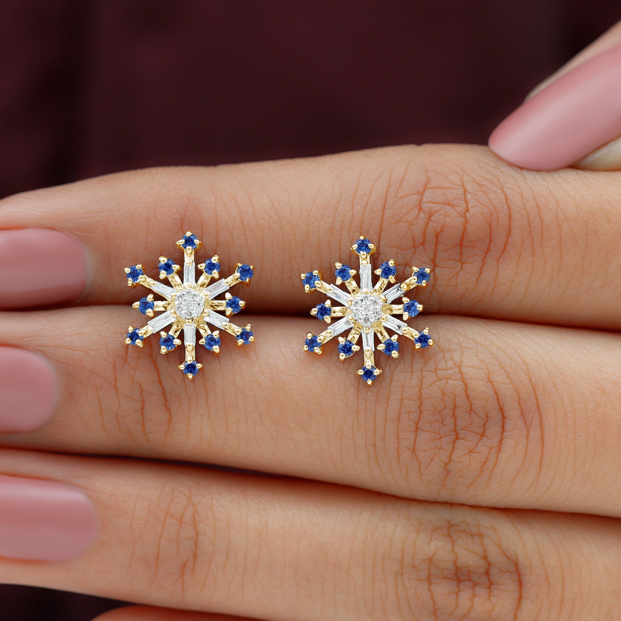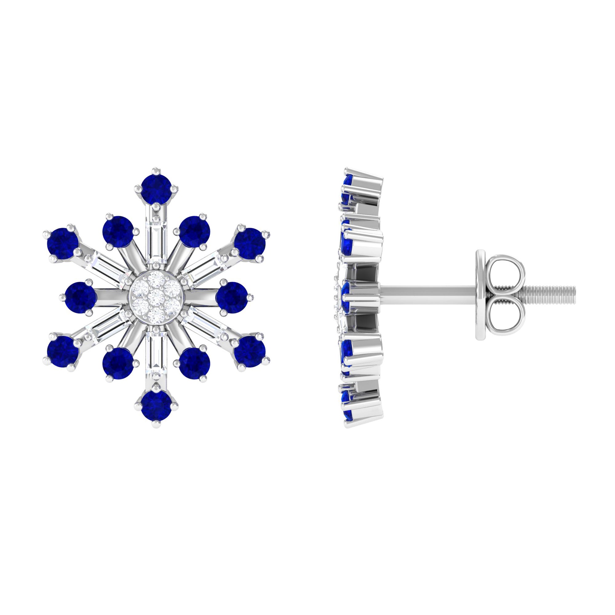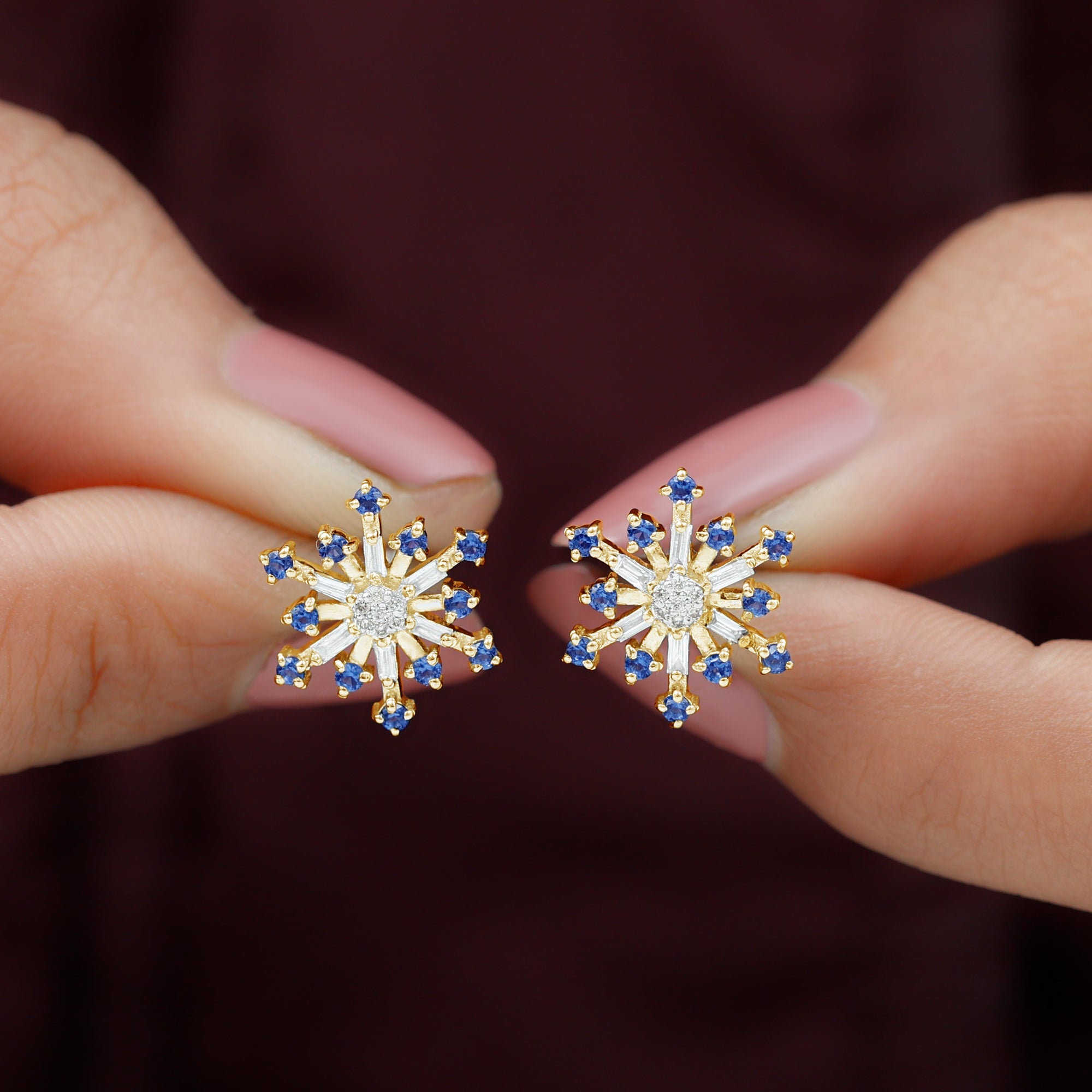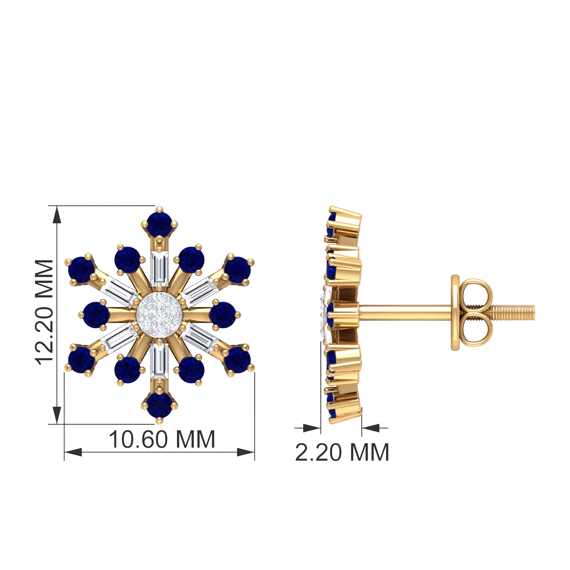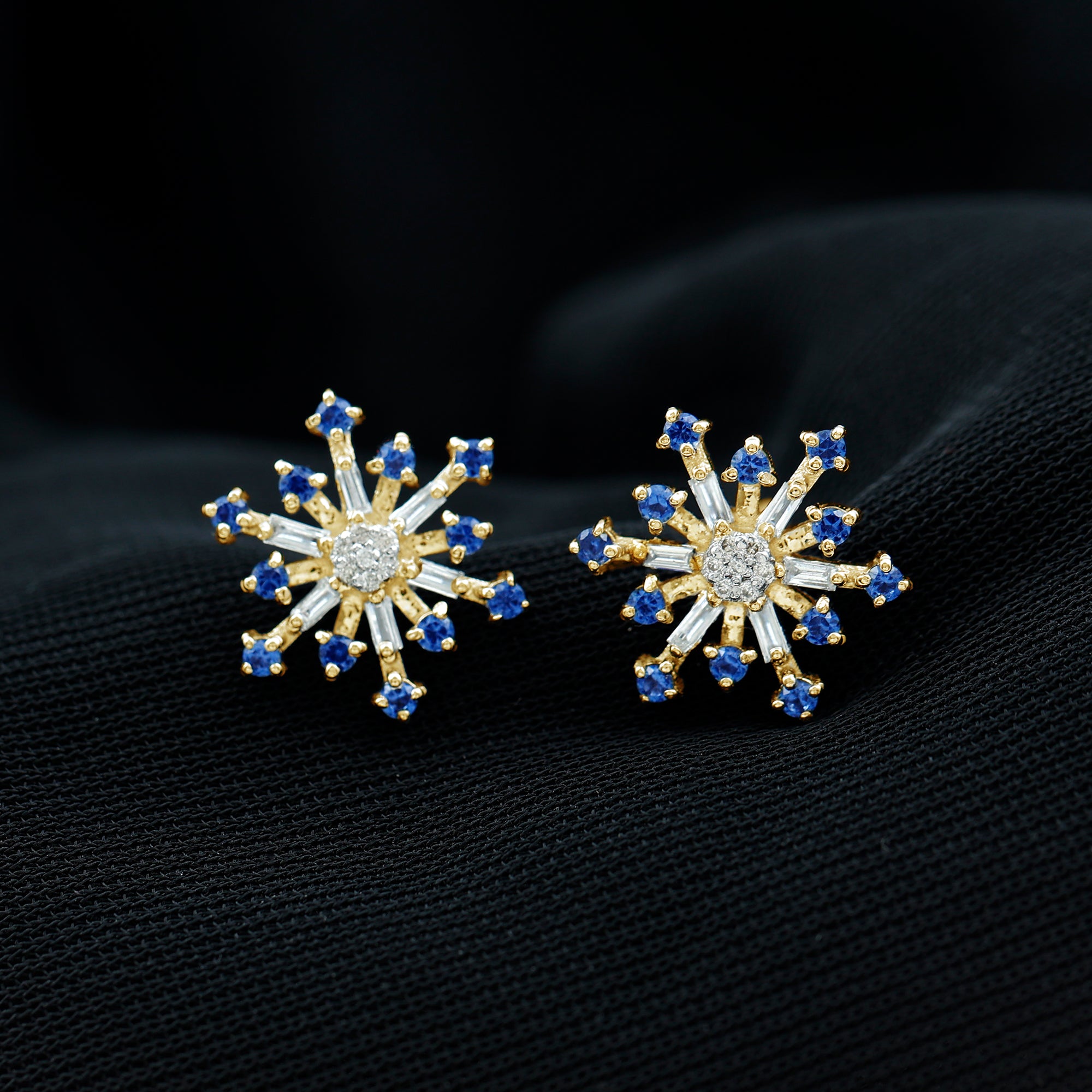 These Snowflake Stud Earrings is embellished with Round Shaped Lab Created Blue Sapphire with Round and Baguette Shape Diamond in Prong Setting.