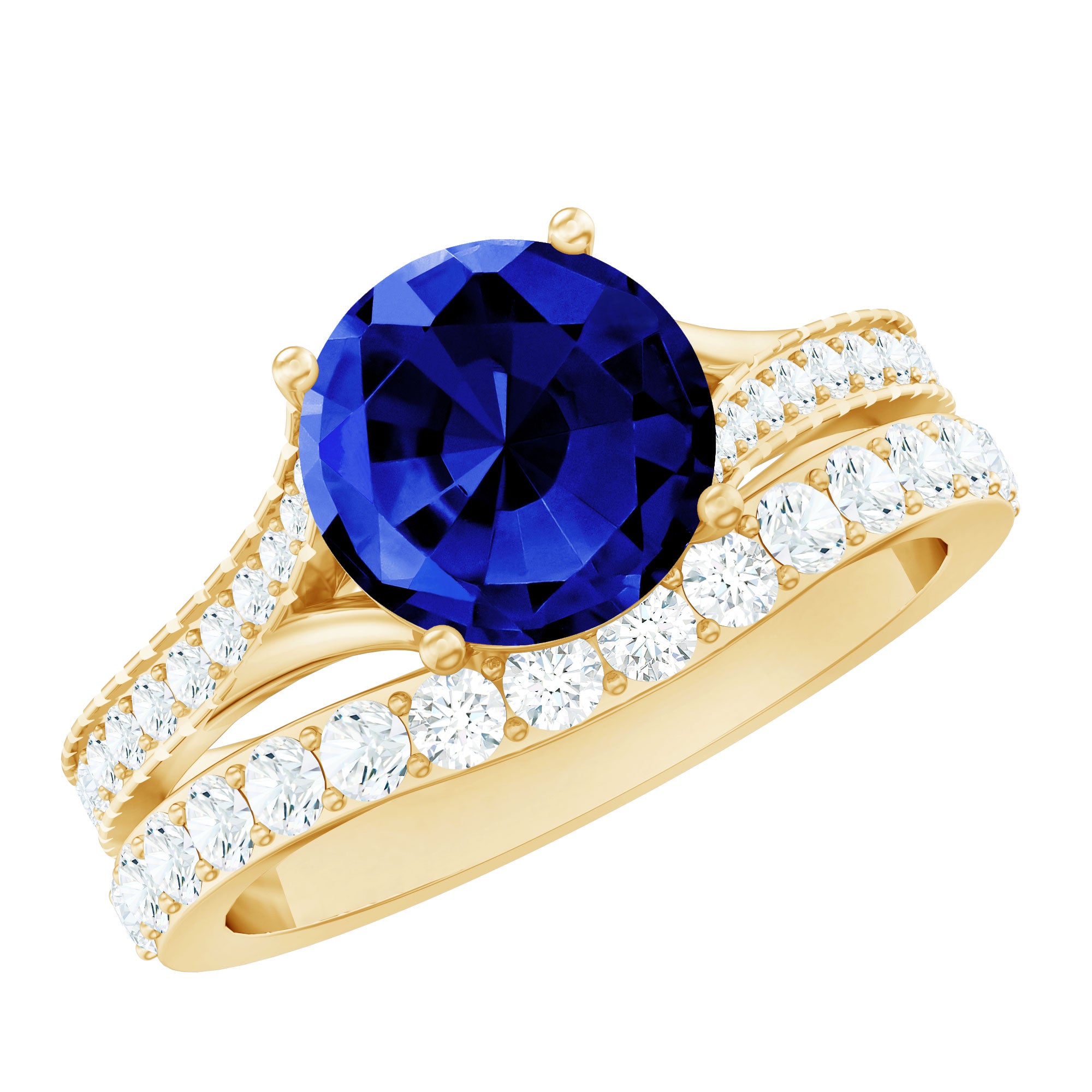 The set showcases a Round Cut Lab Created Blue Sapphire, beautifully embellished in a prong setting. Surrounding the center stone, shimmering Round Moissanite are intricately adorned in a pave setting, adding a touch of brilliance and allure. This set is a symbol of commitment and everlasting love, exuding elegance and grace. Let it be a testament to your unique journey together, radiating beauty and enchantment for all to see.