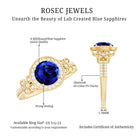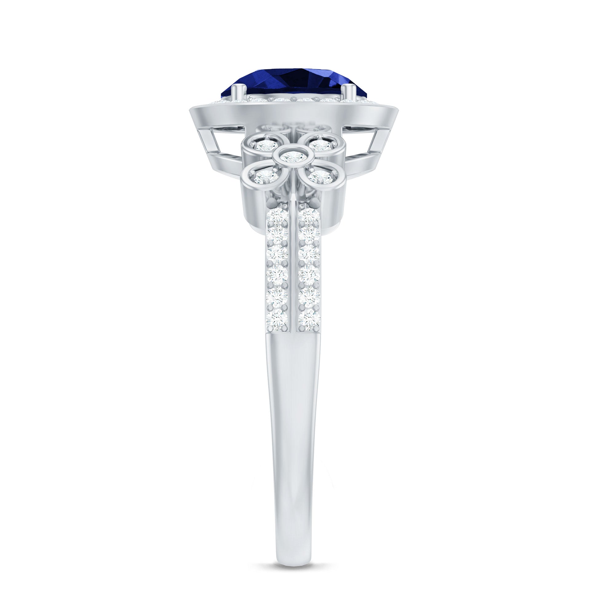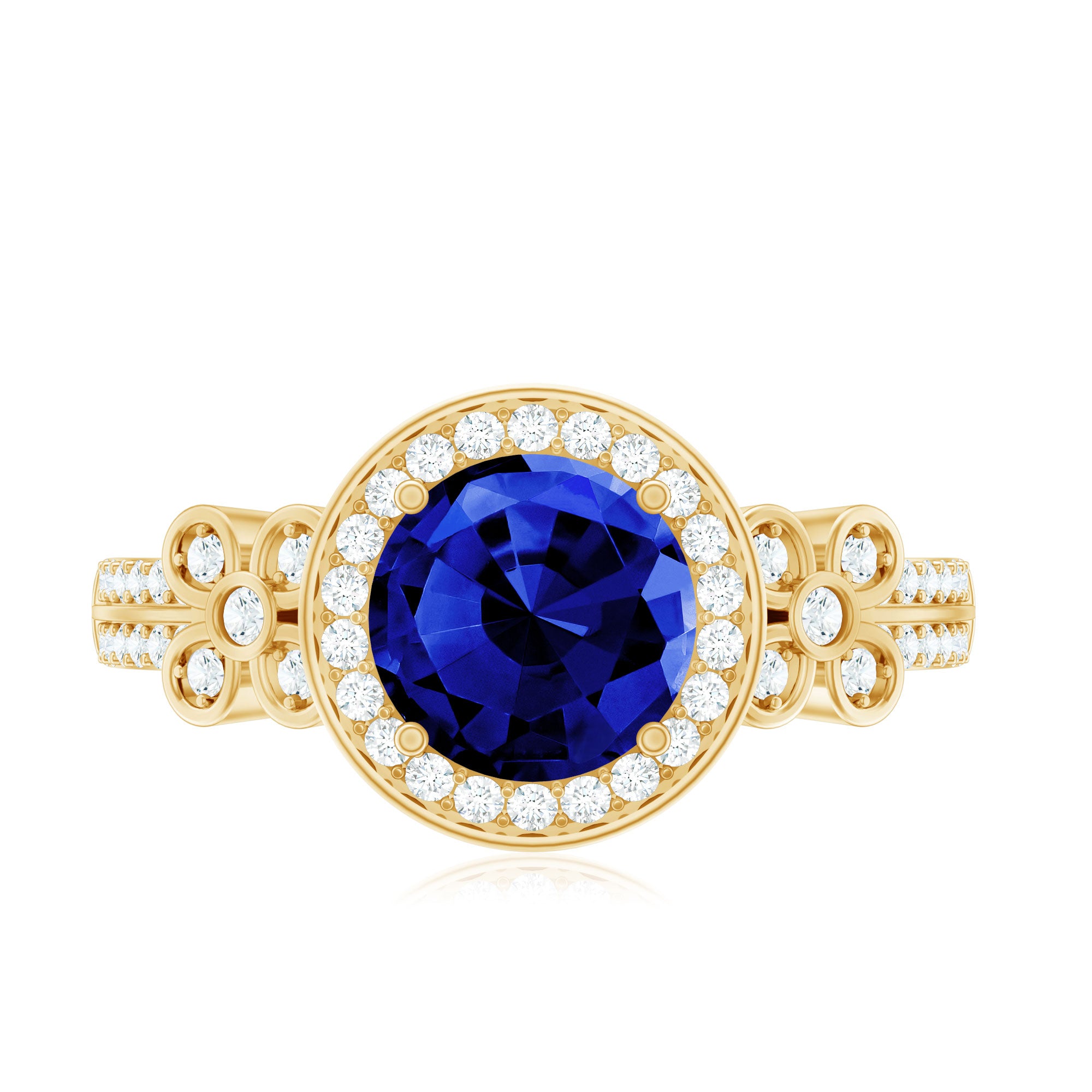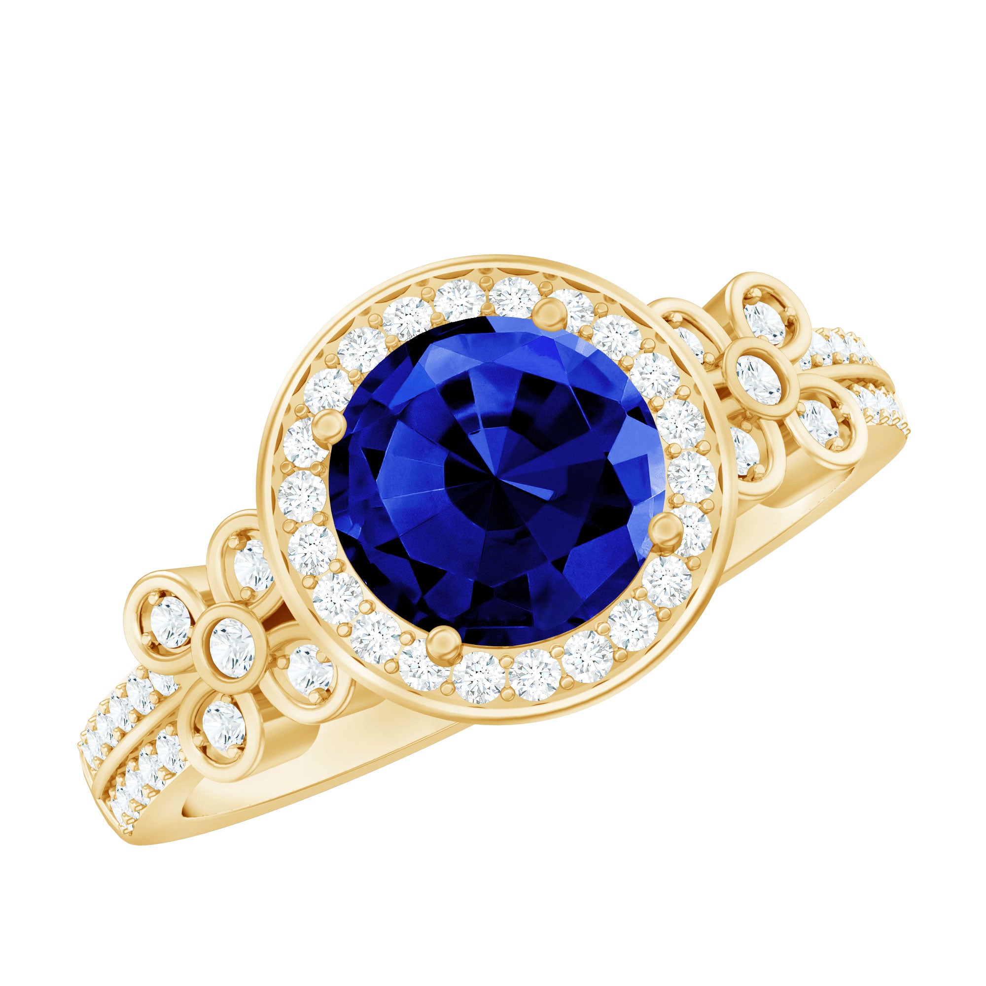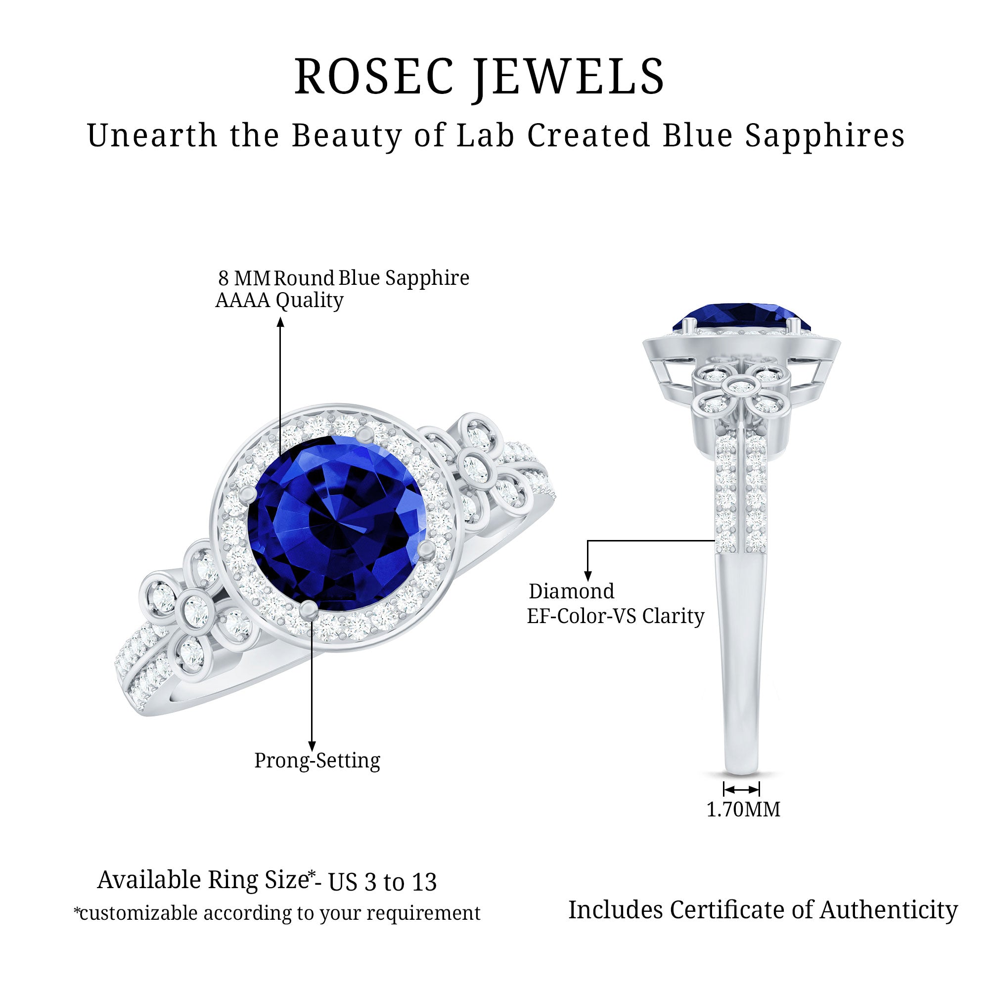 Elevate your style with this exquisite Classic Engagement Ring, featuring a 8 mm Round Shape Lab Grown Blue Sapphire encircled by dazzling round Lab Grown Diamond gemstones. Meticulously crafted for elegance, the delicate band is adorned with Aaaa Quality Sapphire and Ef-Vs Quality Diamonds and features a Floral Design on either side of the center stone. Trust in Rosec Jewels dedication to quality and sustainability, making your engagement ring not only a symbol of love but also a statement of conscious choices.