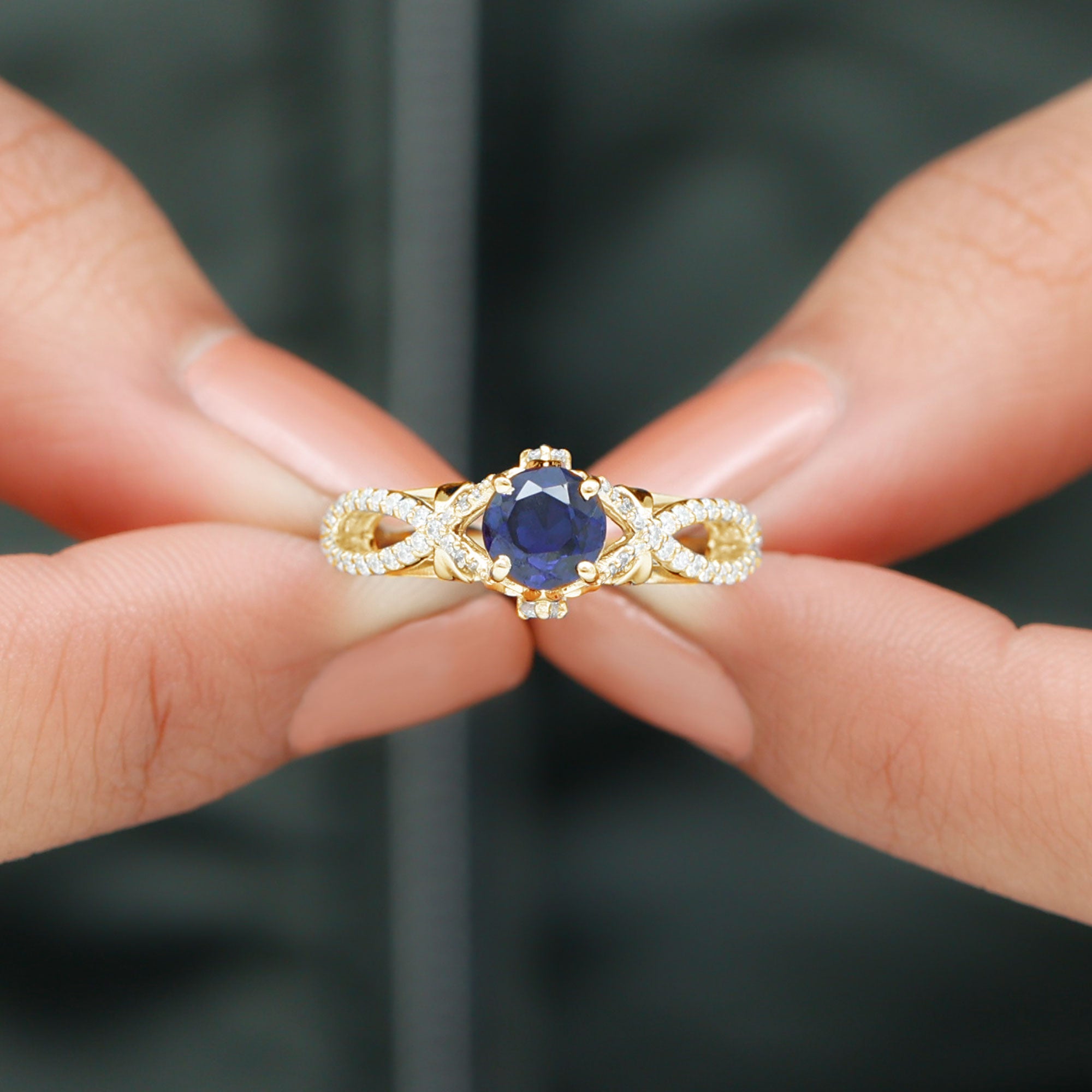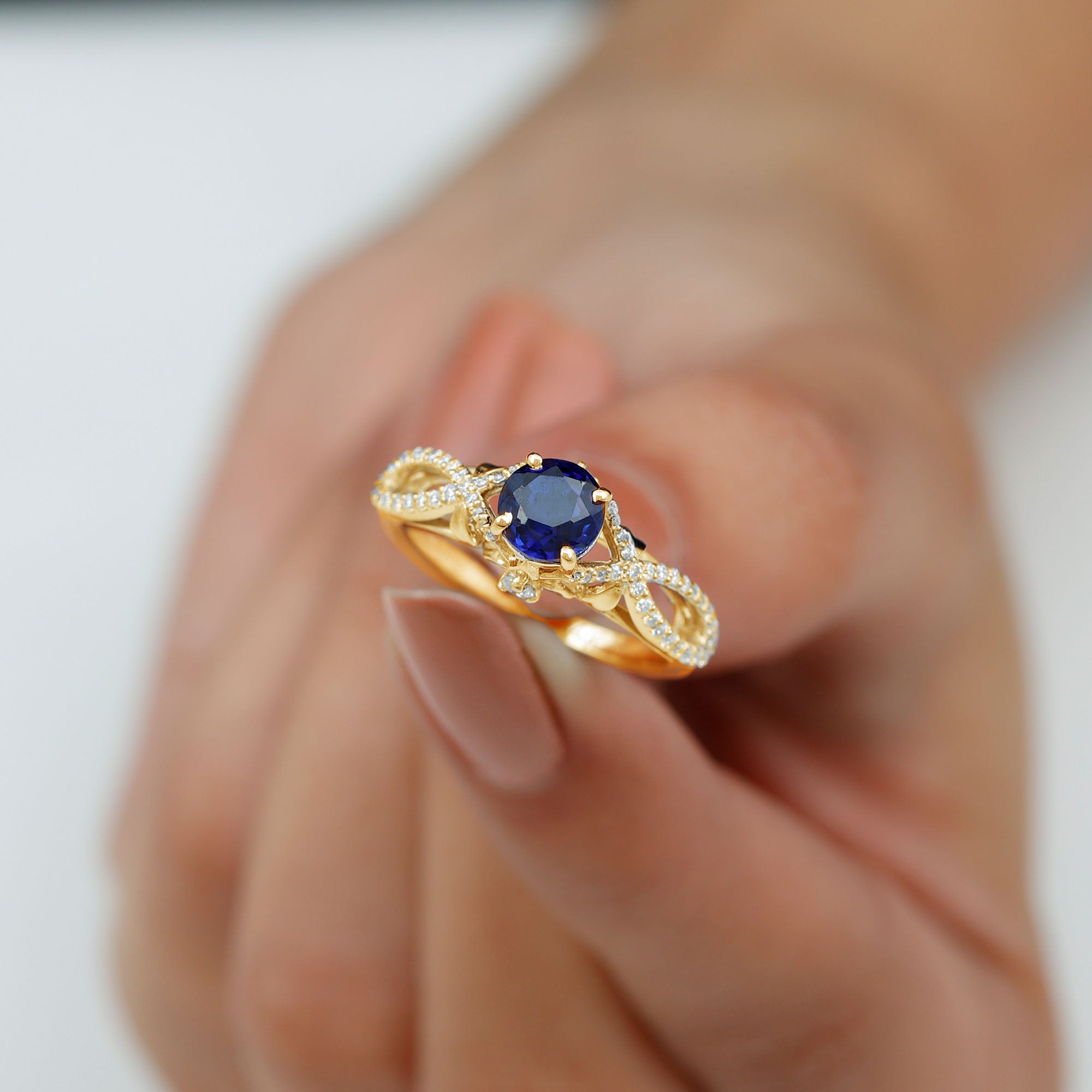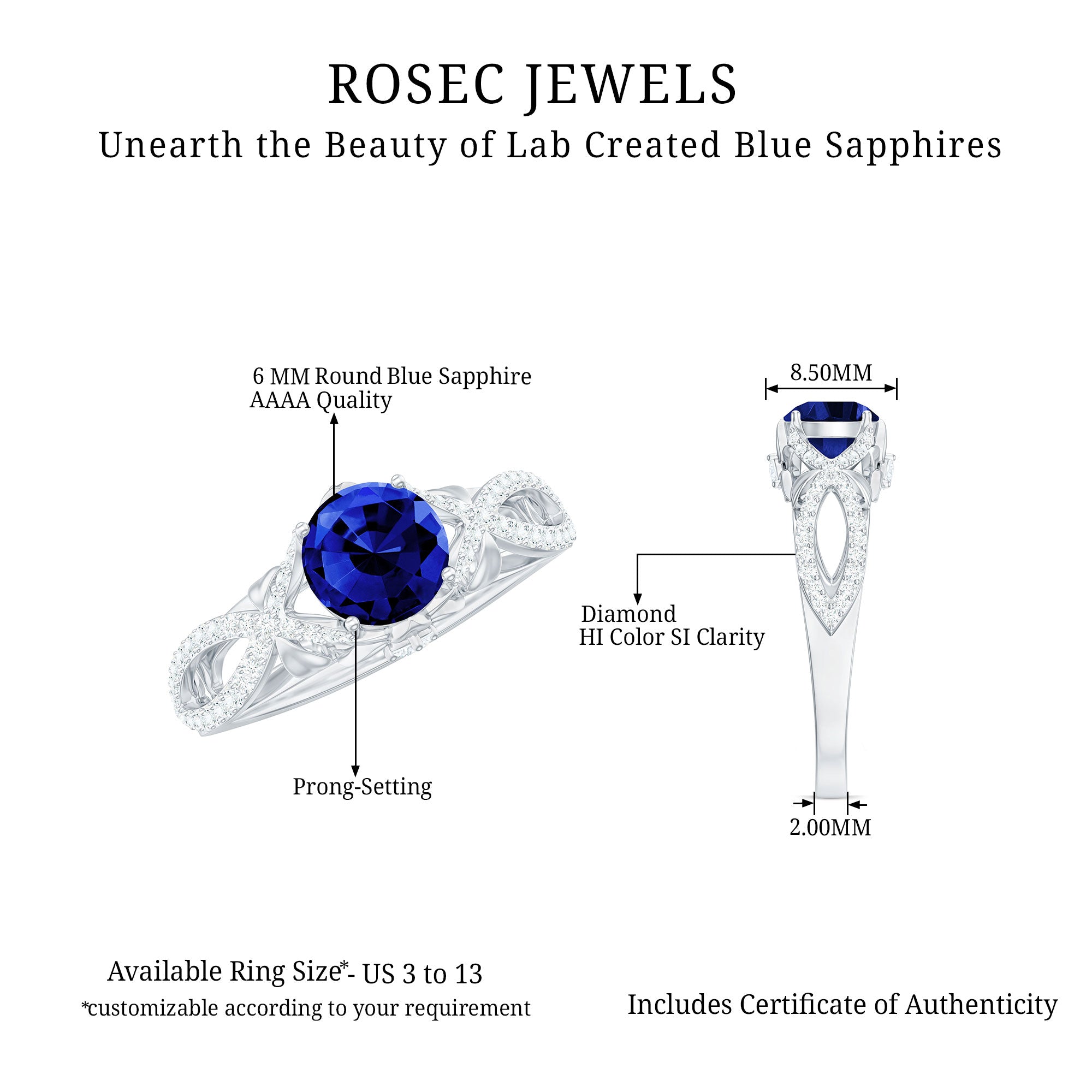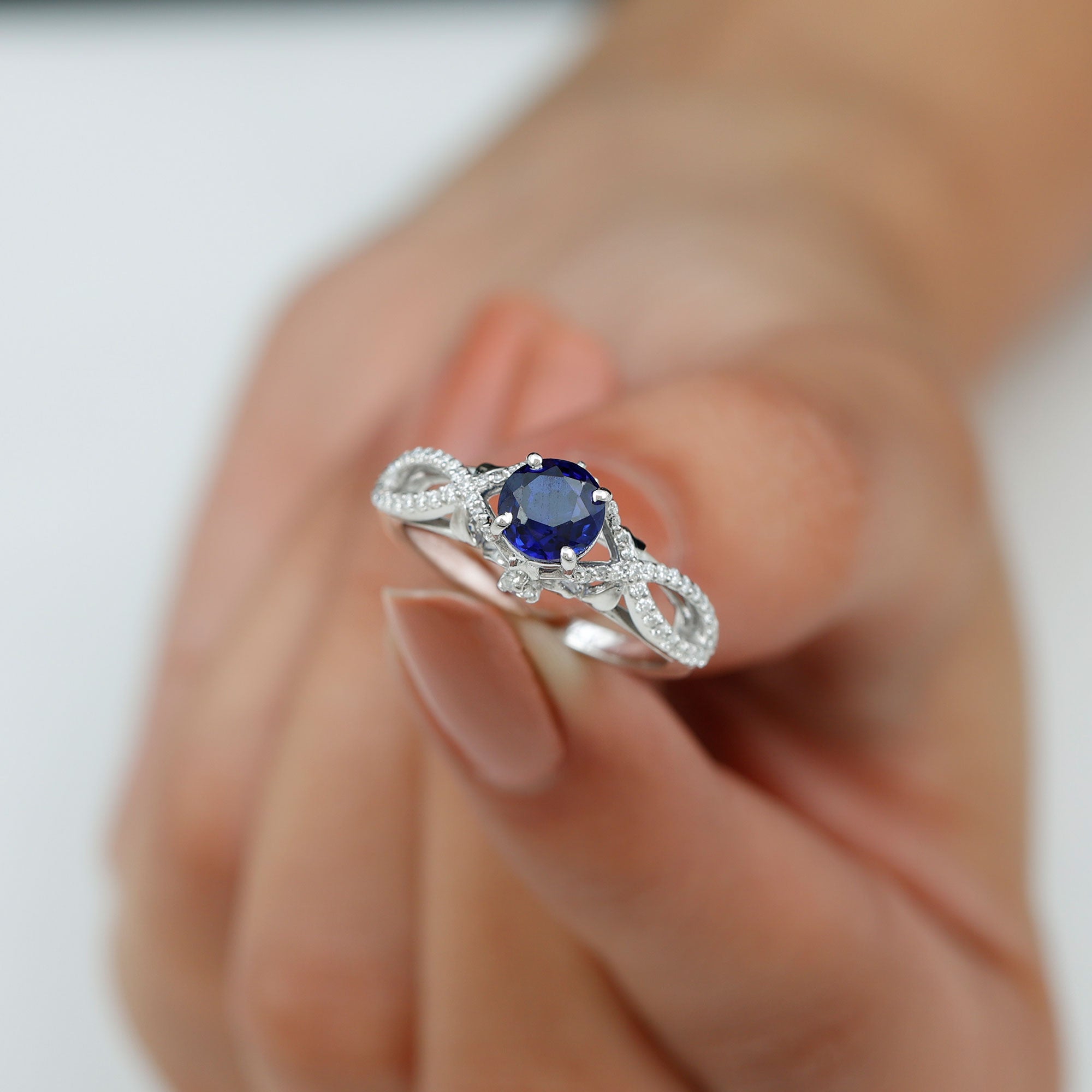 Elevate your style with a hint of enlightenment through this exquisite Lab Created Blue Sapphire Ring. This engagement ring is bound to set you apart in any setting. Showcasing a round shape lab created blue sapphire nestled in an elegant crossover shank decorated with Diamond stones, this ring becomes a perfect manifestation of your love and admiration for that exceptional woman in your life.