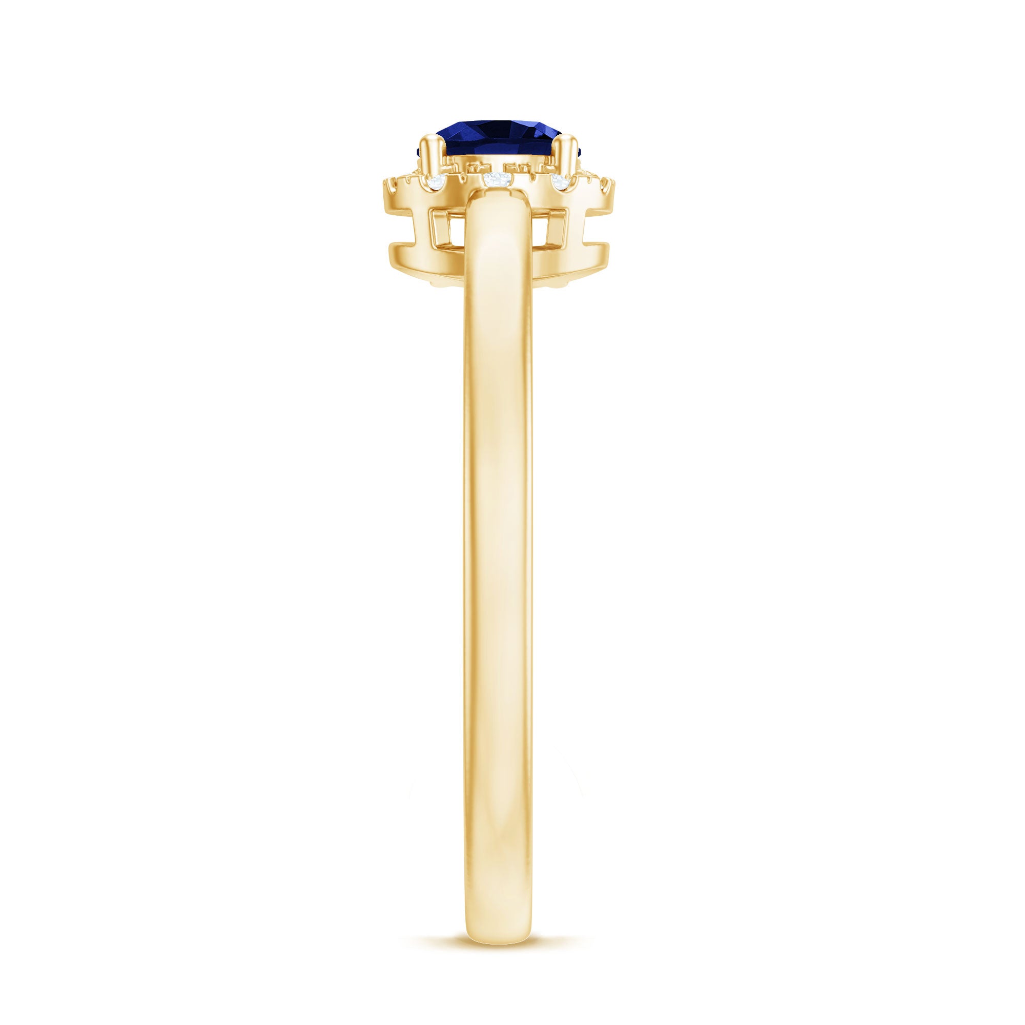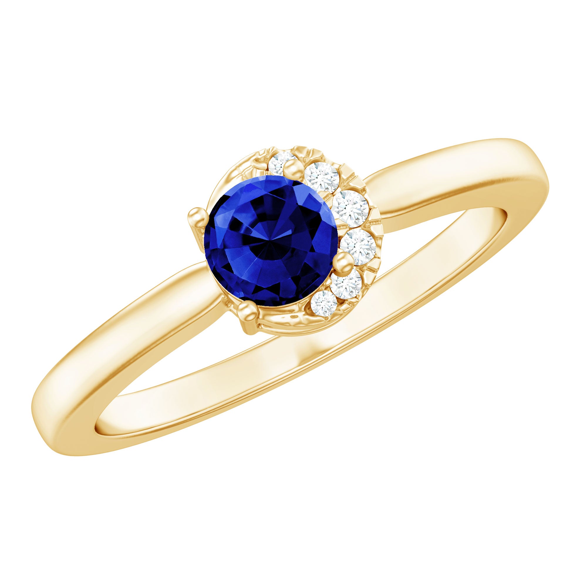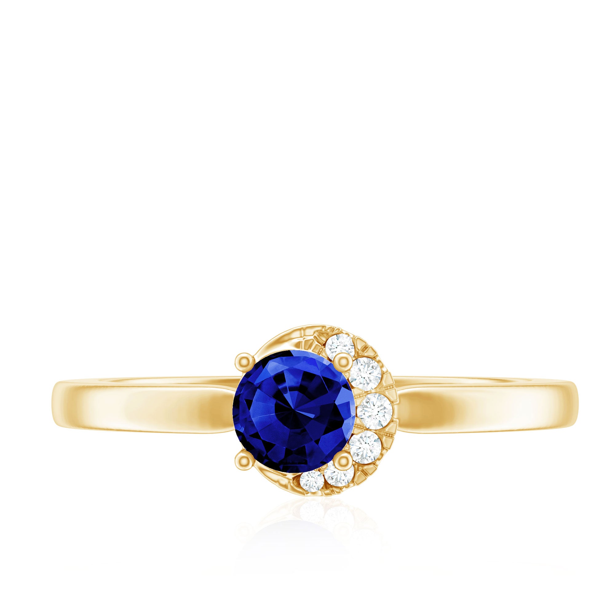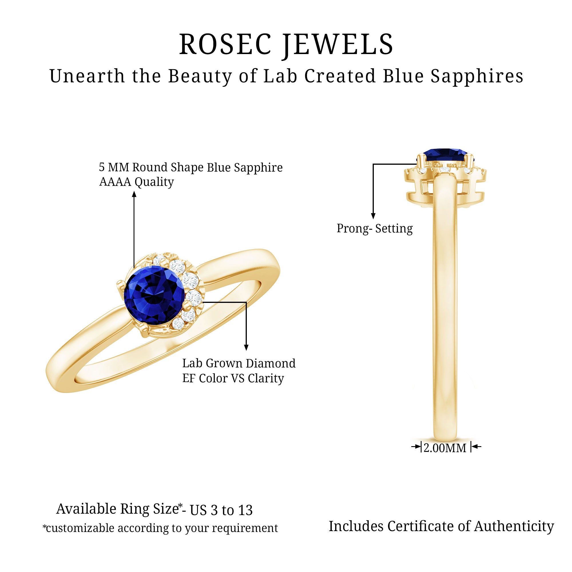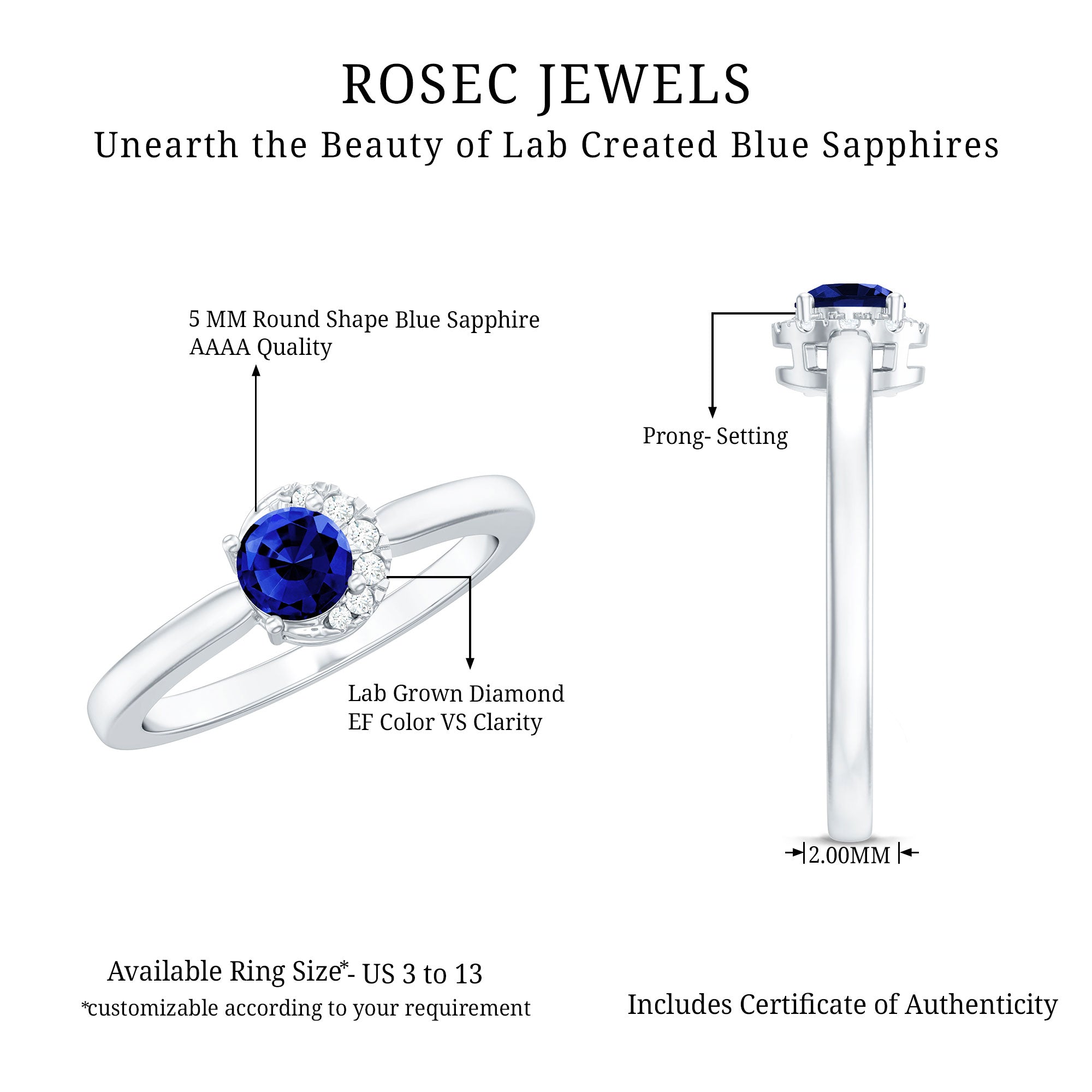 Something blue to imbue love hue. If you are looking for that type of ring for your promise day or big day, then our Minimal Lab Created Blue Sapphire Ring is really for you. The shimmering center stone of 5 mm Round Shape Blue sapphire takes center stage, while Round Shape Diamonds gracefully dance around it, magnifying its radiance. With its minimalistic design, this Sapphire Promise ring sets itself apart and becomes an irresistible treasure in your collection with Aaaa Quality Sapphire and Ef-Vs Quality Diamonds. At Rosec Jewels, we craft the Sapphire Diamond Ring with Lab Created Gemstones. Elevate your love with elegance and style with this beautiful promise ring.