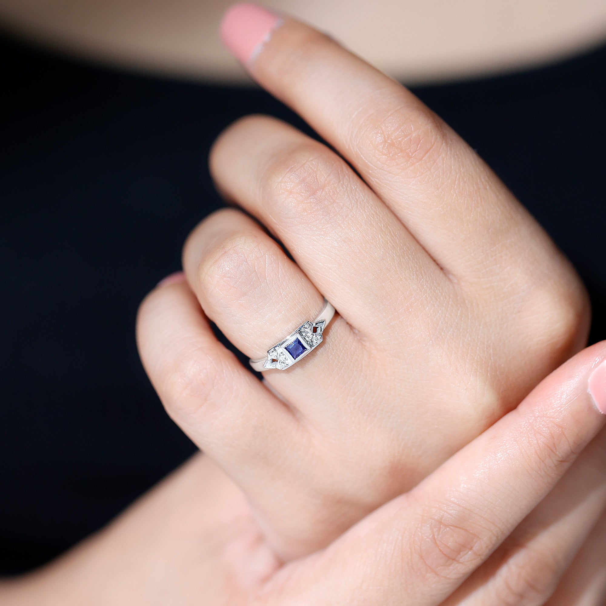 The timeless Unisex Promise Ring showcases a princess cut Lab Created Blue Sapphire, elegantly placed in a bezel setting, flanked by Round Shape Diamond gemstones in a prong setting. This exquisite Lab Grown Blue Sapphire Ring designed for women offers a range of metal options, adding to its versatility and charm.