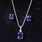 Add a touch of timeless beauty to your look with this stunning Blue Sapphire Necklace and Earrings Set. The Sapphire Jewelry Set includes a necklace and a pair of matching earrings, both crafted with care and attention to detail. The necklace features a beautiful 6X8 MM oval cut lab created blue sapphire as the center stone, topped with a sparkling moissanite. The pendant hangs gracefully from a rabbit ear bail on a classic cable chain, creating a delicate and elegant look. The stud earrings match perfectly with the necklace, each featuring a 4X6 MM oval cut lab created blue sapphire held securely in prong setting. The screw-back closures keep them comfortable and safe for all-day wear. Each stone in this Oval Pendant and Earrings is carefully chosen for its bright color, clarity, and sparkle. This Blue Sapphire and Moissanite Jewelry Set makes a thoughtful gift for birthdays, anniversaries, or any moment you want to make special. Elegant and versatile, it is a piece that will be treasured for years to come, a perfect blend of modern luxury and classic charm.