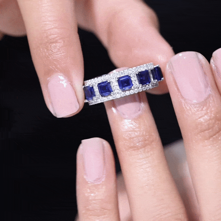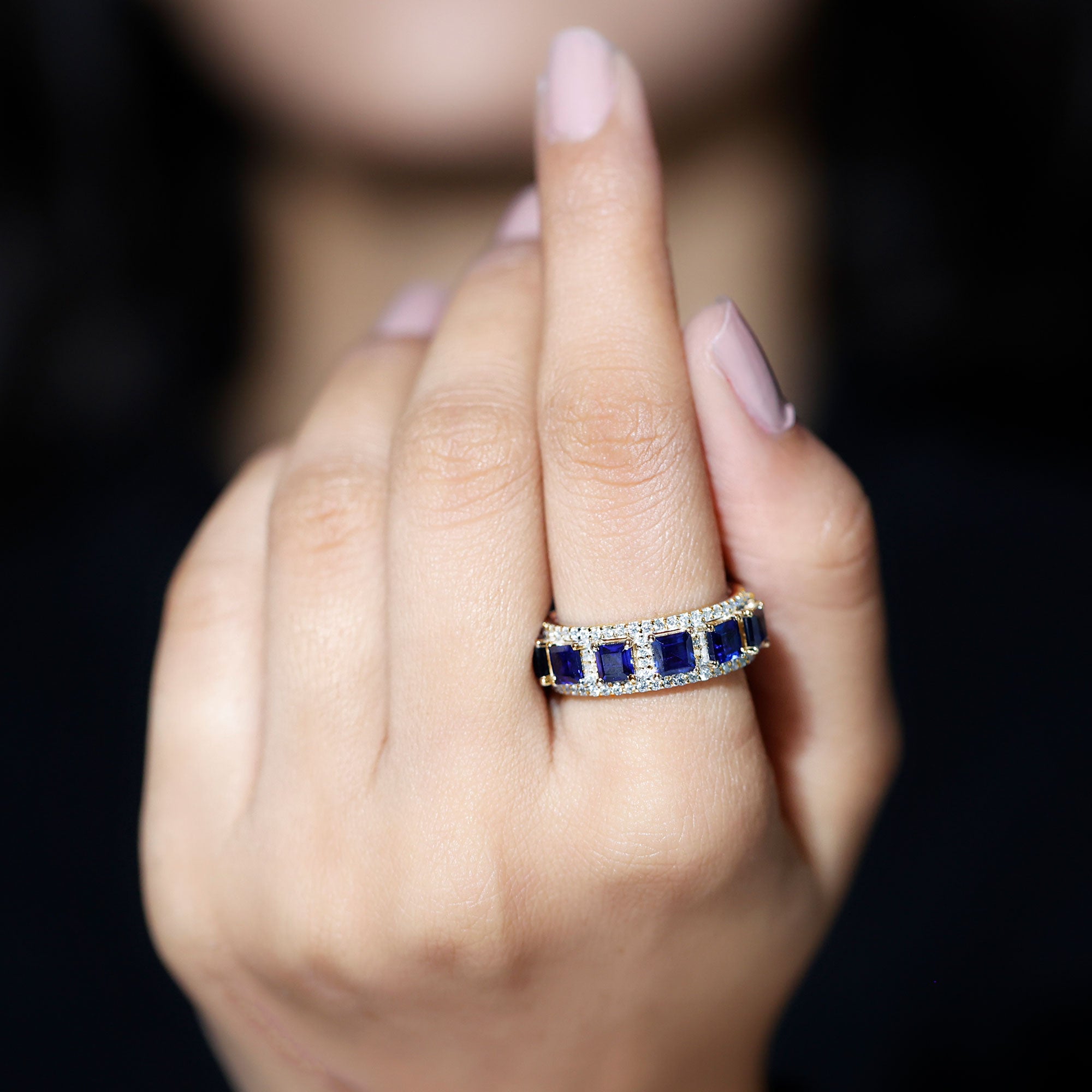 The elegant Classic Wedding Band is a wonderful choice for your partner to be to make her feel special. Embellished with Princess Cut Lab Created Blue Sapphire in Prong Setting along with a Moissanite Accent.