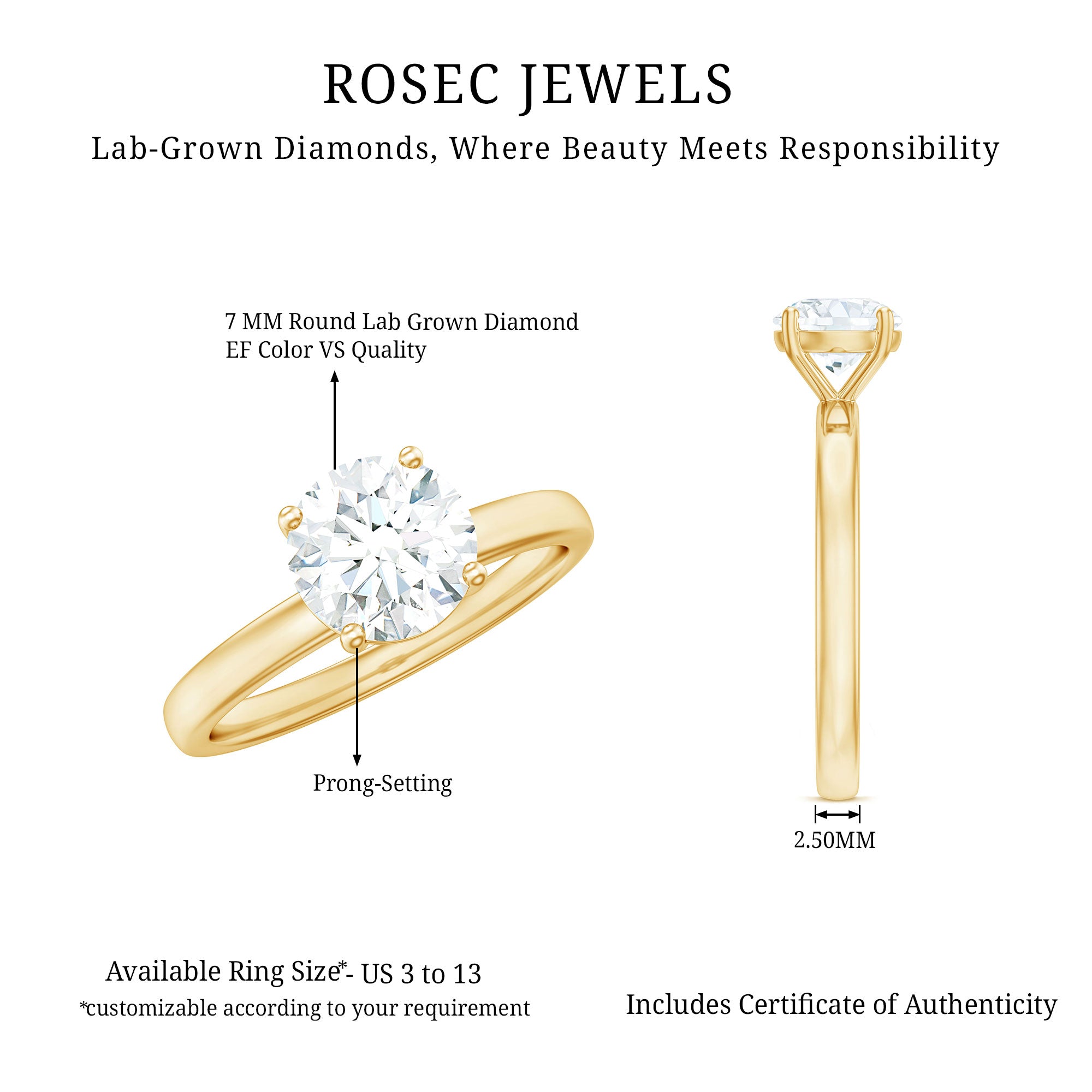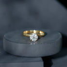 The Solitaire Engagement Ring style is the most classic and timeless way to show off a diamond and is one of the oldest styles of engagement ring. This particular Single Stone Engagement Ring piece is embellished with prong set 7 MM round shaped lab grown diamond of Ef-Vs quality and has a flat edge shank. Handcrafted from high-quality metal, this Round Diamond Ring offers a touch of luxury and sophistication thats sure to capture her heart. As a symbol of your commitment and love, this ring serves as an ideal jewelry piece for any women born in April month, destined to bring boundless joy to your special someone.