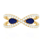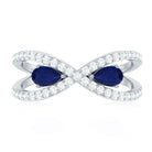 Designed by Rosec Jewels, this Designer Engagement Ring has a toi et moi pattern with a meaningful infinity shank. Embark on a journey of love with this 2 Stone Engagement Ring, a captivating symbol of a shared past and promising future. The exquisite design of this Promise Ring features two 3X5 MM pear shaped blue sapphires of AAA Quality in prong setting. Adorning the infinity shank are the brilliant round cut lab made diamonds, that embrace its beauty. Every curve, every stone, and every detail in this Sapphire and Diamond Ring is a testament to fine craftsmanship, representing two souls with eternity symbolism in a way that feels both timeless and mesmerizing.