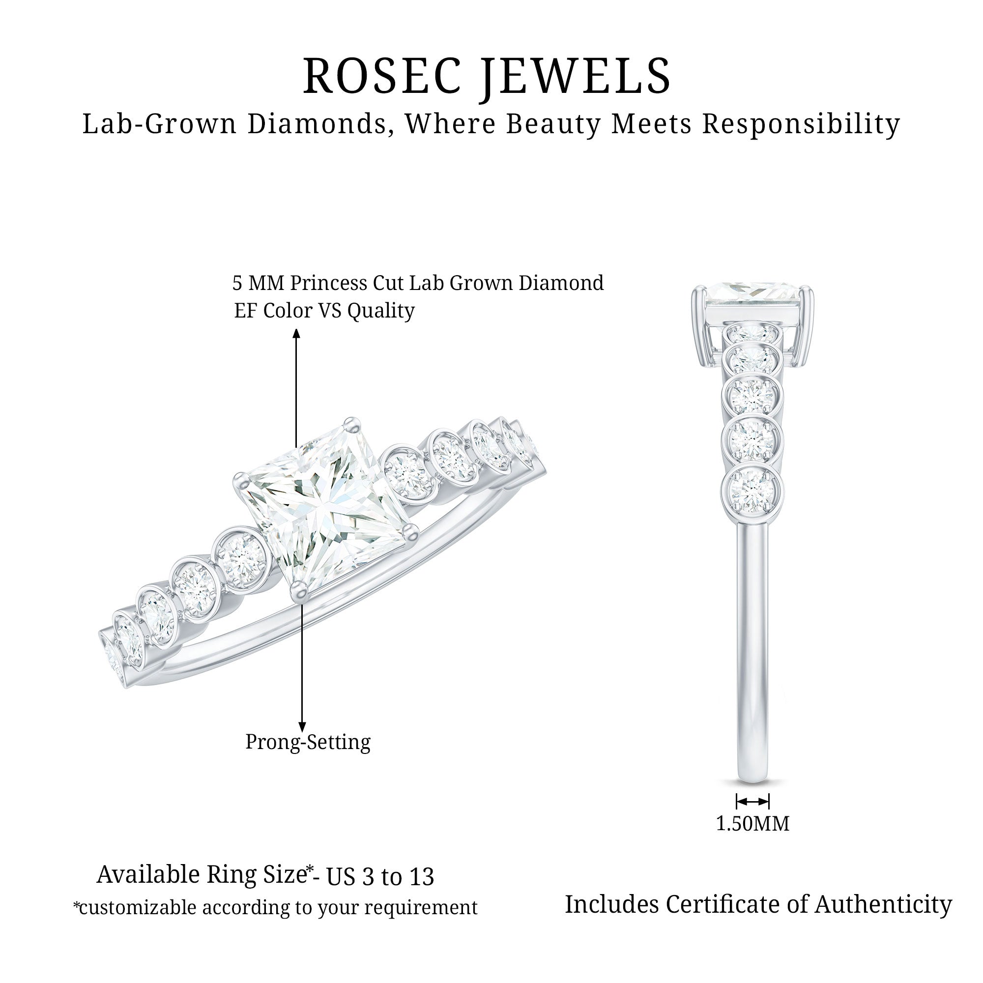 Lab Grown Diamond 5 MM Princess Cut Engagement Ring With Side Stones