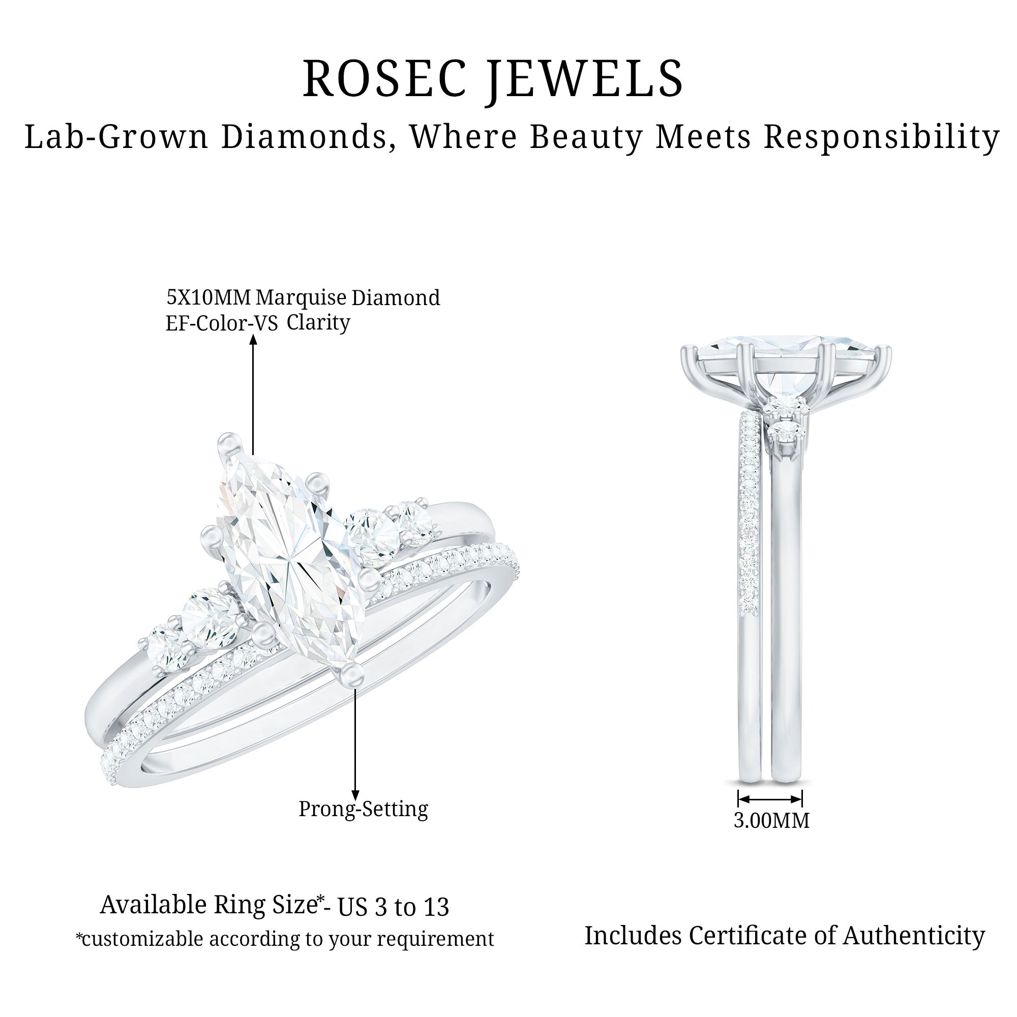 This Lab Grown Diamond Ring Set is an epitome of elegance and sophistication. Symbolizing timeless love and commitment, this Marquise Wedding Band Set shines with ethical integrity. This remarkable Ring Set is adorned with the Engagement Ring, which has 5X10 MM Marquise Shape Lab Grown Diamond in Peg Head Setting, along with Round gemstones that scintillate and enhance the overall look of it. The unique Wedding Band is also decorated with Round Lab Grown Diamond that seamlessly wraps around your finger. This Marquise Wedding Band Set shines with ethical integrity, making it a unique reflection of love and style. Whether it is an engagement or a special occasion, this captivating Bridal Ring Set is a symbol of love that transcends time, a radiant reminder of your unique bond and the beautiful journey ahead. Make your moment unforgettable with this dazzling duo, designed for those who dare to stand out.