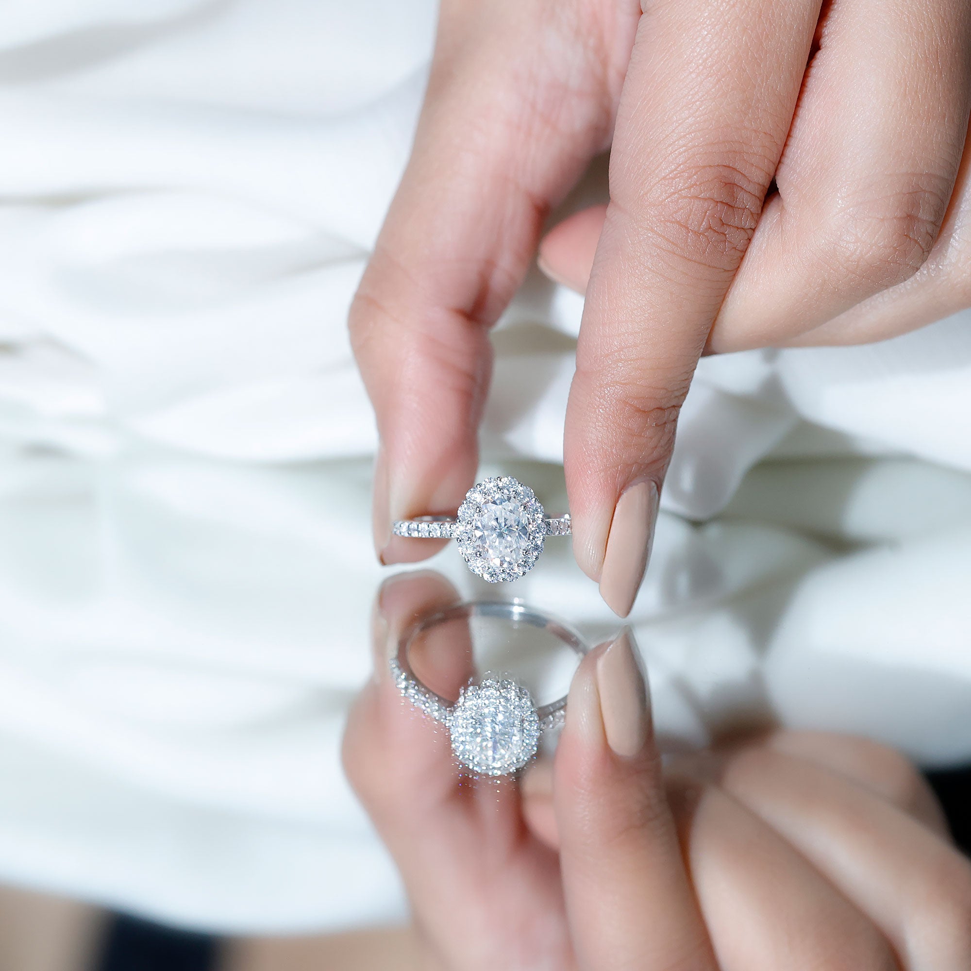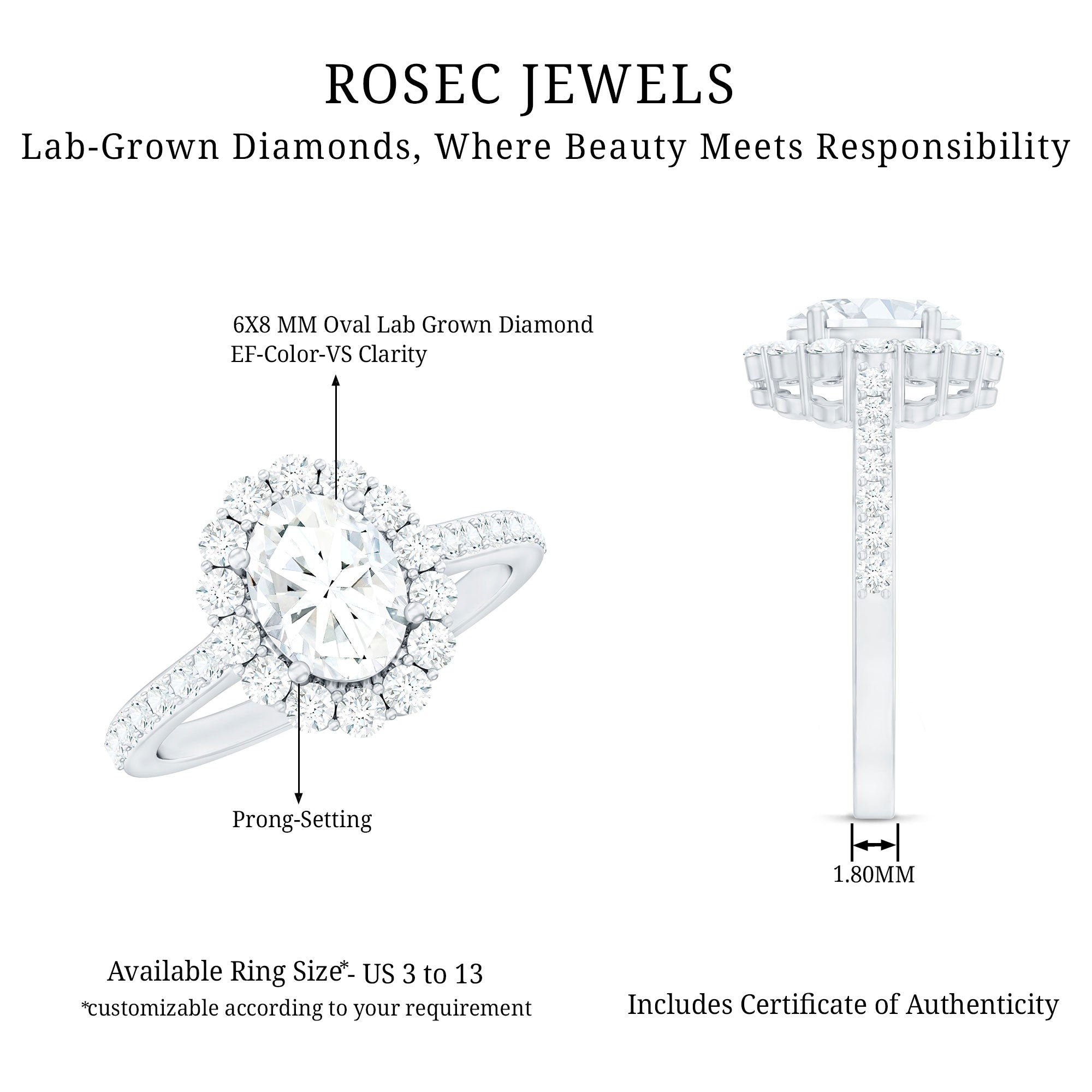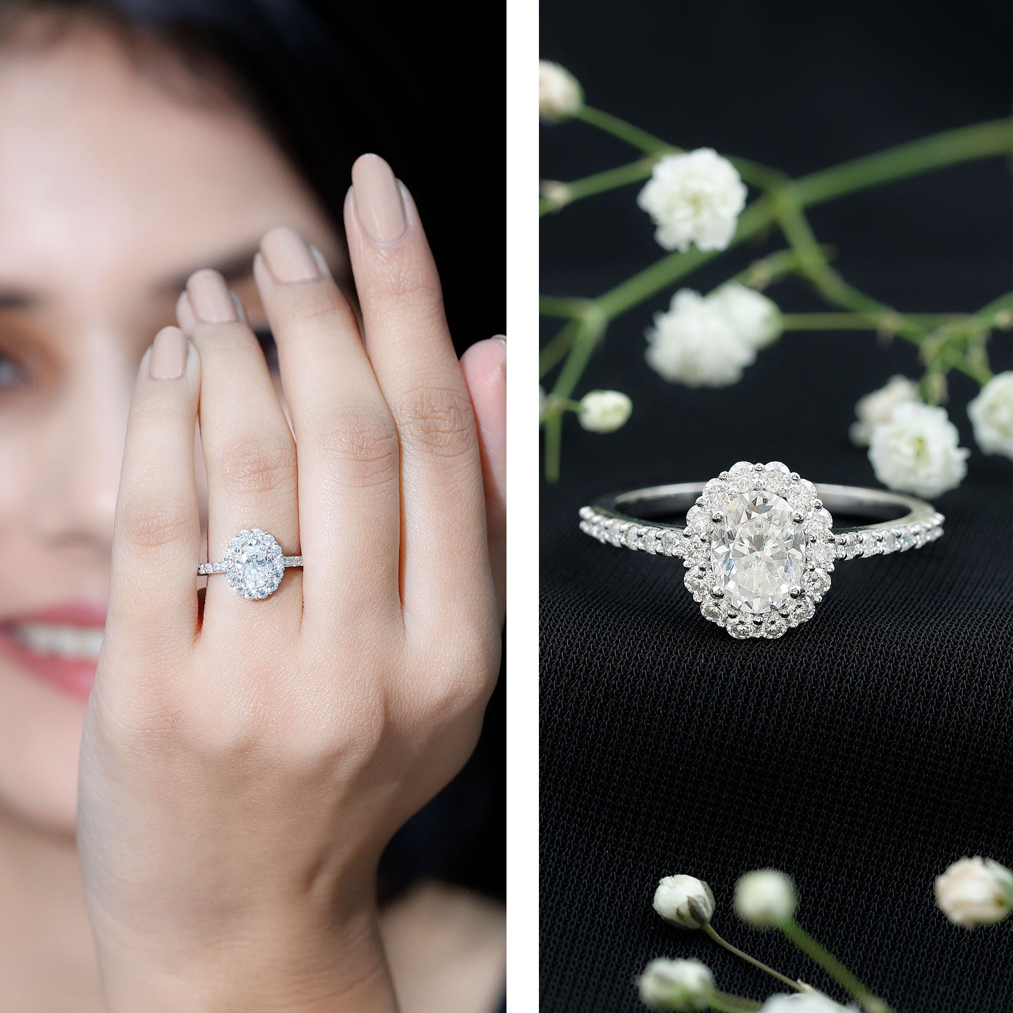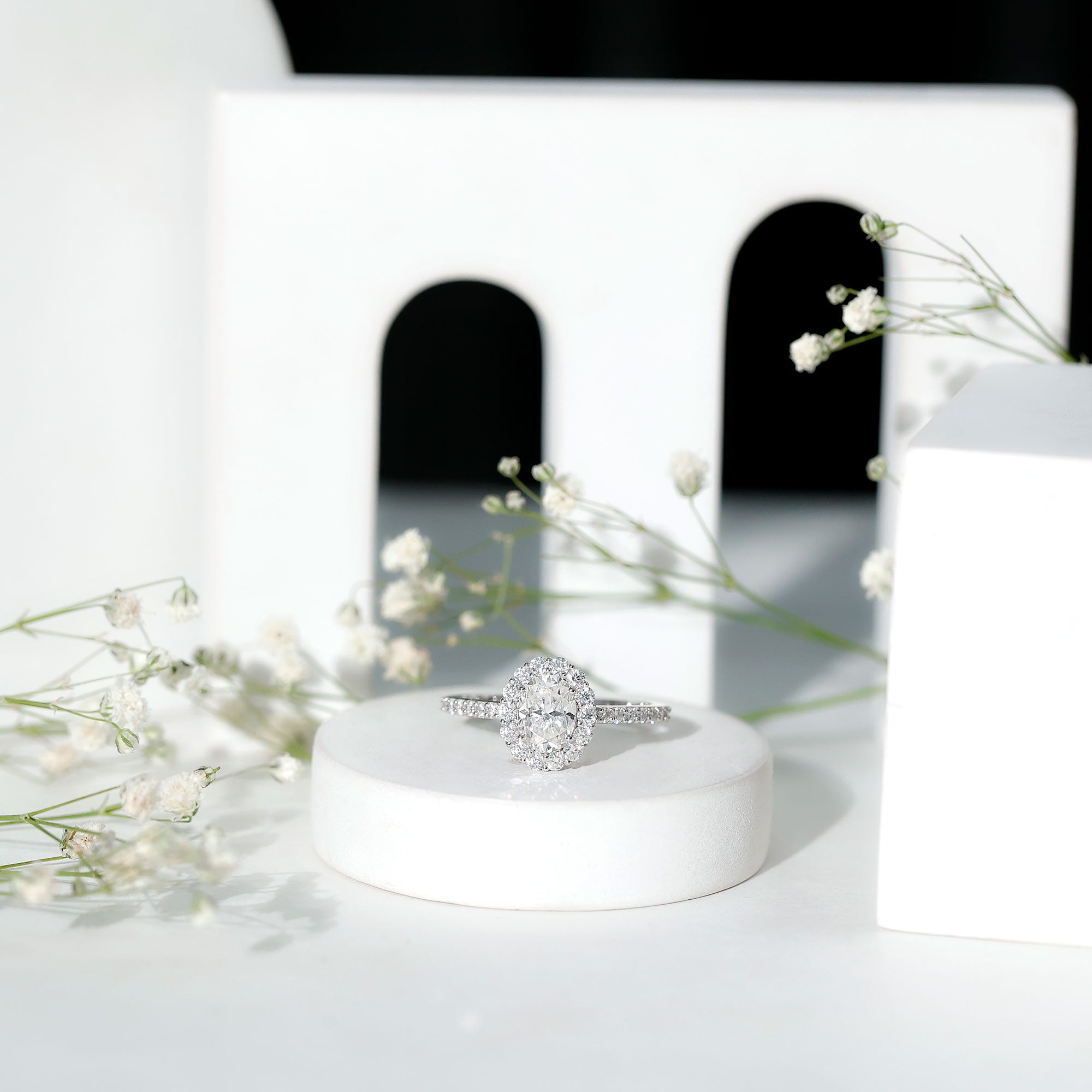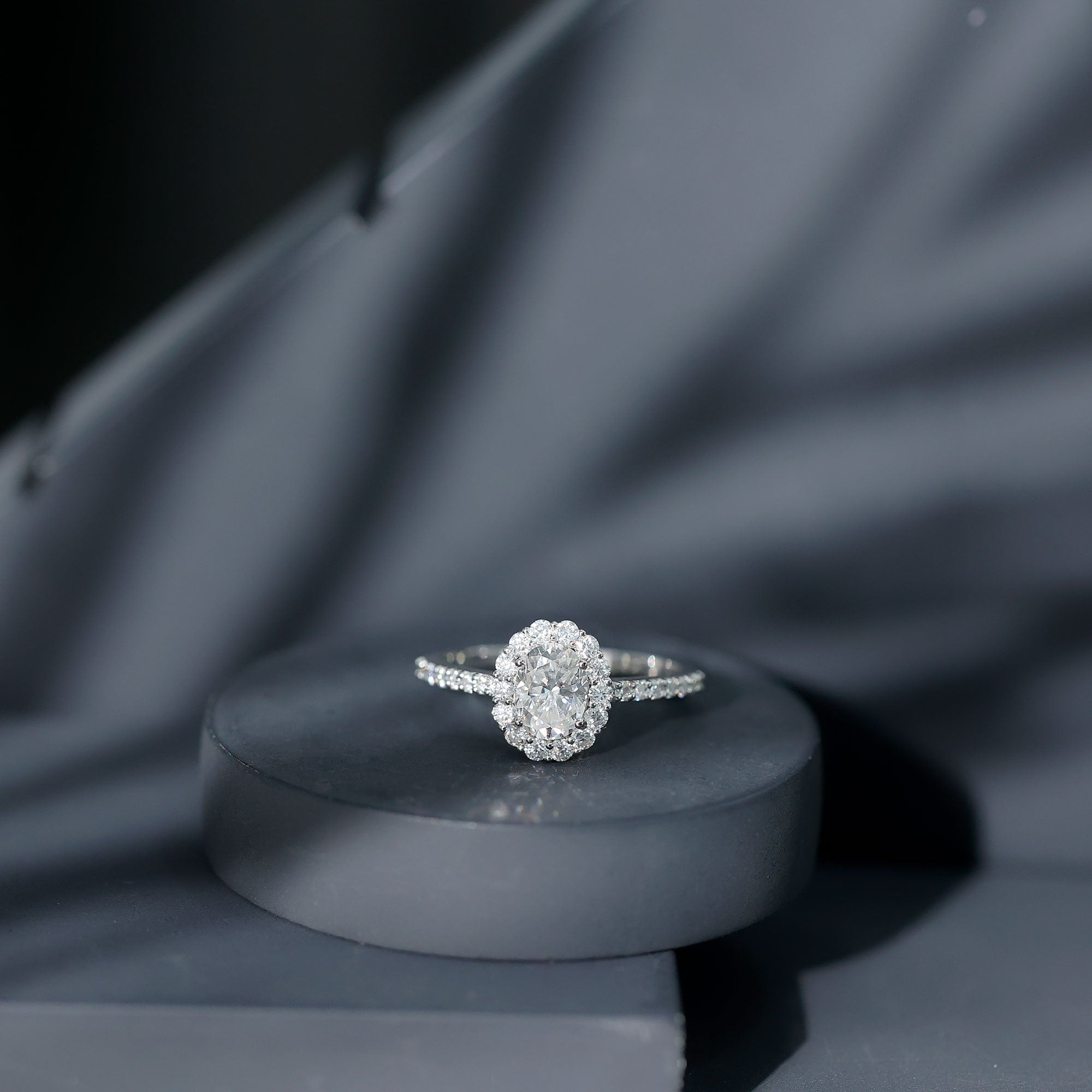 With an impeccable sense of style, this Lab Grown Diamond Ring has royal elegance with a romantic aesthetic, enhancing the overall sparkle while adding an extra layer of brilliance and allure. Embellished with 6X8 MM Oval Shaped Lab Grown Diamond in Prong Setting, surrounded by a Halo of diamond gemstones. With a unique blend of classic and contemporary aesthetics, this Diamond Engagement Ring makes a perfect choice while adding a touch of elegance and sophistication. Holding a simple yet intricate design it has Side Stones with a detailed beauty creating a subtle effect that adds a delicate brilliance to the ring. This Oval Engagement Ring is a versatile choice for creating a stunning engagement ring for your bride-to-be.