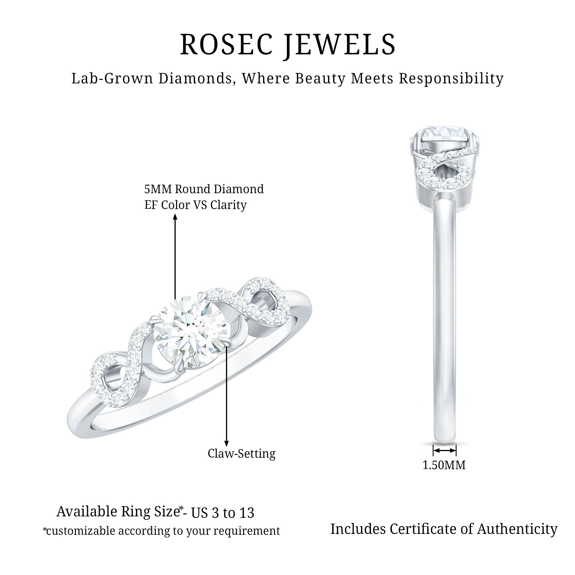 If she fancies everything trendy, you wont come across a better love emblem than our Lab Grown Diamond Promise Ring for her! The Single Stone of 5 MM Round Shape Lab Grown Diamond takes all the center stage here. The Criss Cross Shank lends it a defining designer touch that sets it apart from the rest. Whats more, this Certified Lab Grown Promise Ring is as timeless as your love since it passes all the legitimate quality checks.