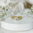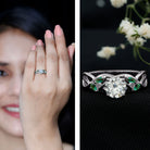 Make the day special with this Diamond Round Engagement Ring. This Engagement ring features 6 mm Round Shape Lab Grown Diamond in the Prong Setting on the Criss Cross Shank adorned with Marquise Shape Lab Grown Emerald. The High Set Ring beholds the shine of Ef-Vs Quality Diamond and Aaaa Quality Emerald. The 1 Carat Diamond Ring depicts love and purity in the relationship perfect to initate the promiss of togetherness. Rosec Jewels Diamond Emerald Ring will mark the day memorable with its giltery apperance.