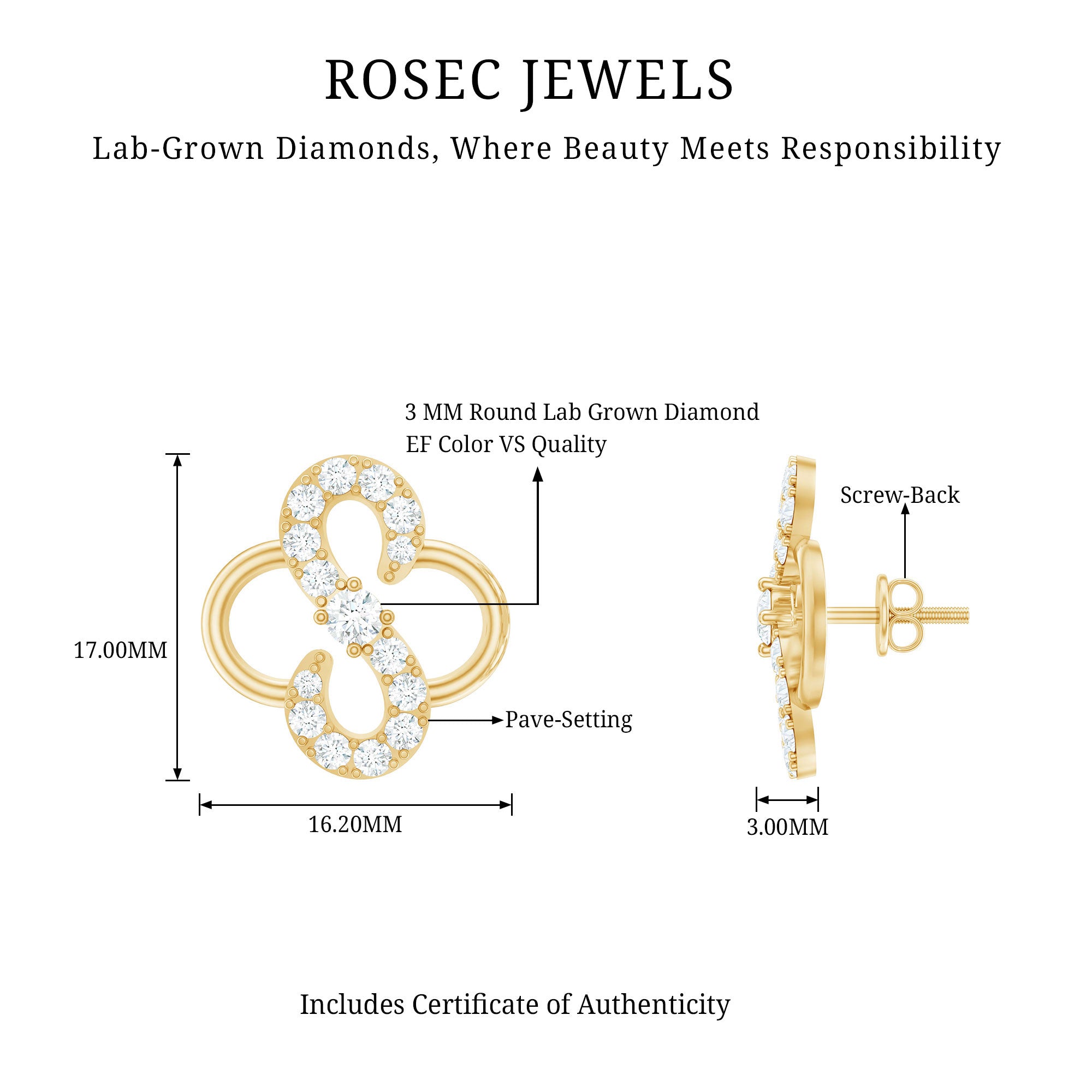 Enchant in elegance with these Floral Stud Earrings featuring sparkling Round Shape Lab Grown Diamond gemstones. The Screw Back Closure ensures a secure fit, allowing you to flaunt these Lab Grown Diamond Earrings with confidence. Imbued with grace, these Diamond Flower Earrings showcase our commitment to sustainable luxury. Whether as a gift for bride, an anniversary gift for her, a birthday gift for mom, or a heartfelt gift for women, these Diamond Studs are the ultimate expression of your love and care, crafted to make every moment memorable. Discover a world where beauty meets responsibility with Rosec Jewels, synonymous with ethical craftsmanship and enduring glamour.