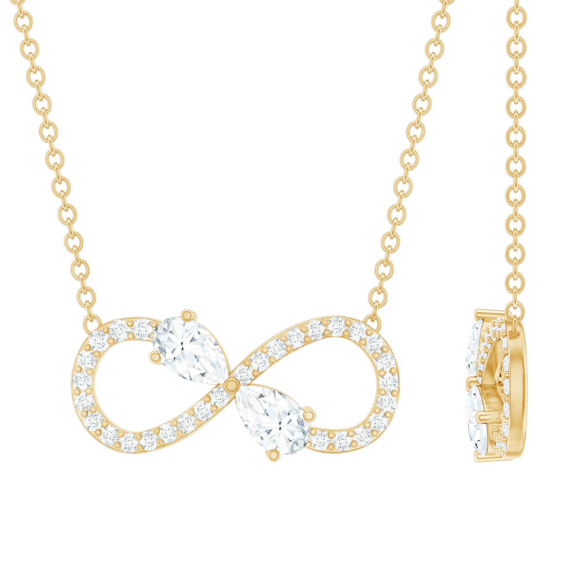 Embrace your inner boss lady at work with a stunning Diamond Infinity Necklace. This piece beautifully reflects your limitless spirit, featuring an Infinity-inspired design adorned with round shape diamonds that shine with exceptional brilliance. To add an extra touch of elegance and sparkle, it showcases two Pear Shape Diamonds (lab-made) at its center making a cute bow. This Certified Diamond Necklace is truly a dream come true for any minimalist diva. Whether you are celebrating an anniversary, a milestone, or simply expressing your love, this Infinity Sign Necklace is the perfect symbol of eternity. Gift her something that shines as brightly as she does, because she deserves the best.
