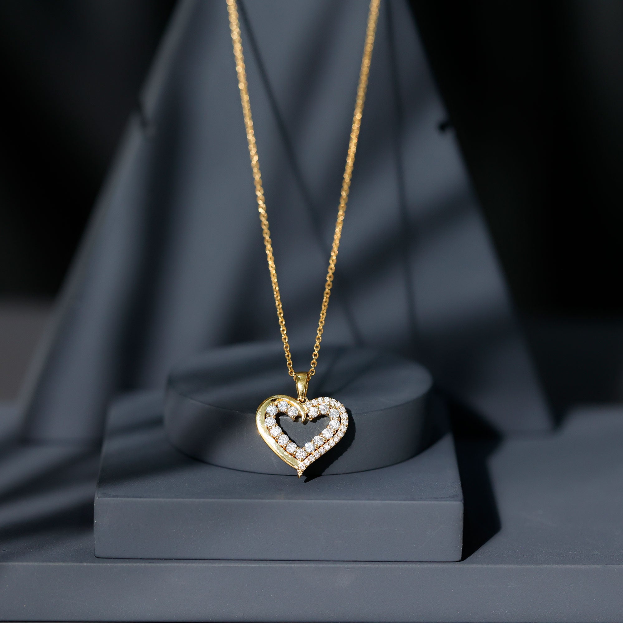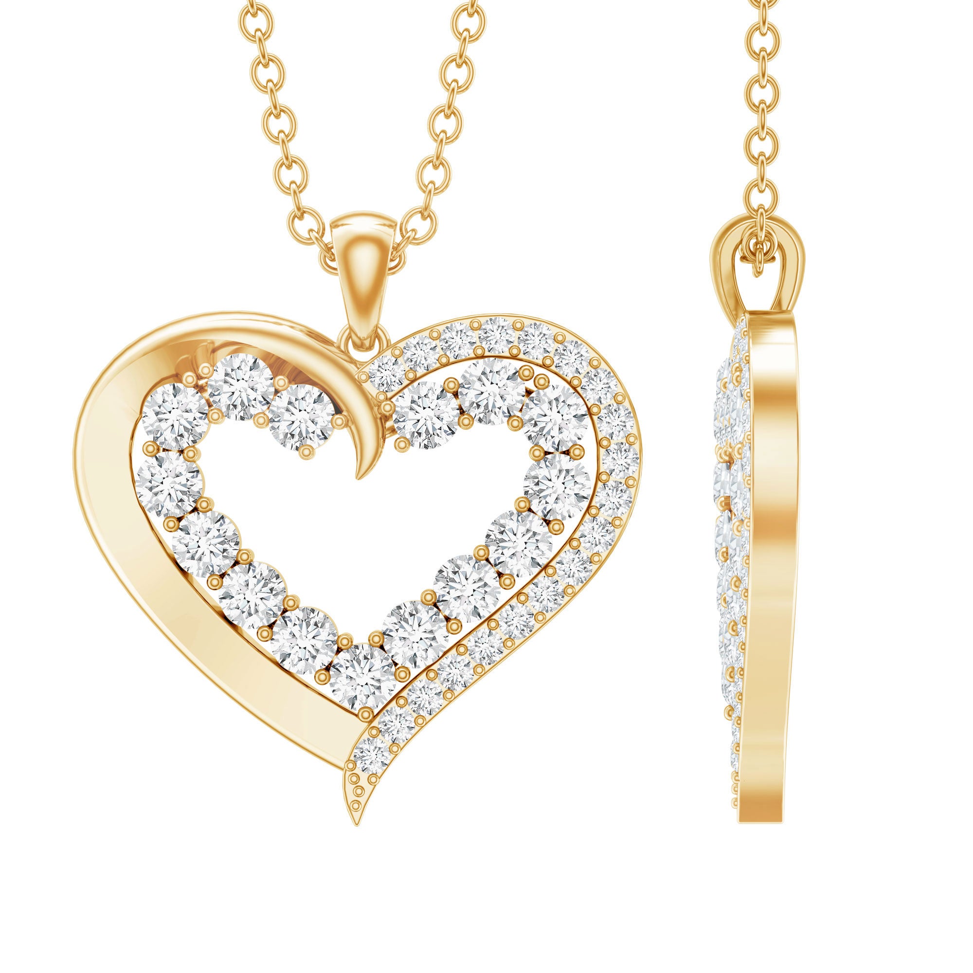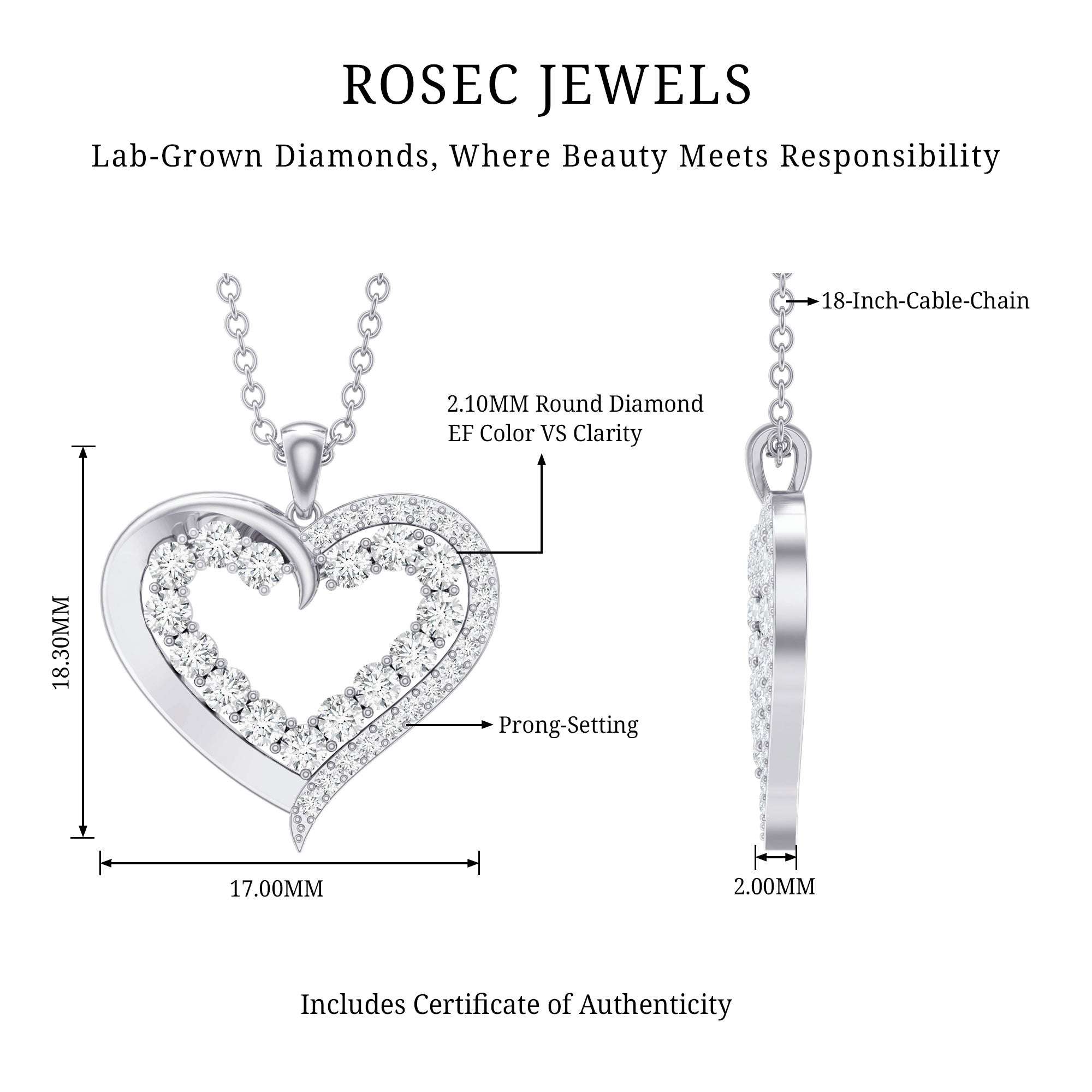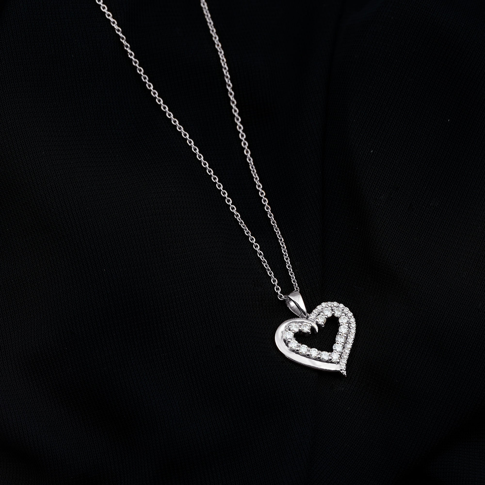 Give your heart to her in the form of Heart Shaped Diamond Pendant. This beautiful necklace from Rosec Jewels is handcrafted with Round Shape EF-VS Quality Lab Grown Diamonds securely placed in the Shared Prong Setting. This Diamond Pendant Necklace is designed with a dual layer out of which one layer is fully decorated with Lab Grown Diamonds. The other layer is partially decorated with diamonds and partially embellished with metal which defines a delicate combination of sleek and perfect craftsmanship. This Open Heart Necklace is perfect to celebrate the Valentines day with her. Rosec Jewels will deliver this pendant in a premium-quality gift box.