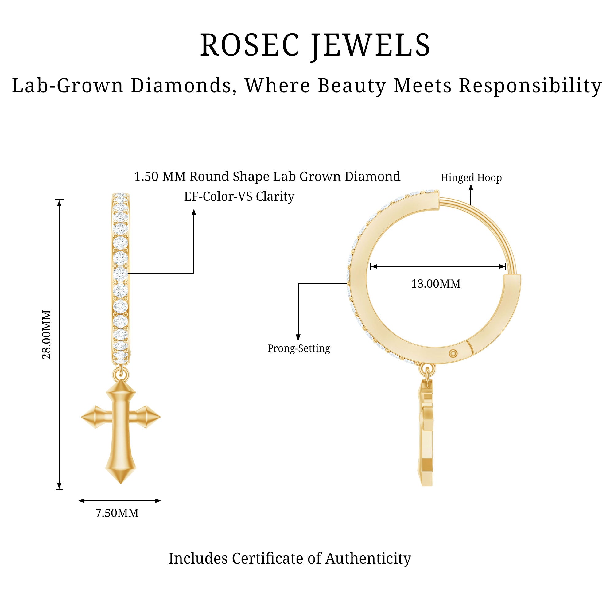 Elevate your fashion while staying true to your beliefs with these exquisitely crafted Lab Grown Diamond Cross Earrings. The standout feature of these Hoop Drop Earrings is a charming dangling cross charm made of simple metal, elegantly hanging from a hoop embellished with round cut lab grown diamonds. The timeless design of these Cross Drop Earrings is enhanced by a hinged hoop closure, guaranteeing a secure and comfortable wear. These Lab Made Diamond Earrings seamlessly combine classic elegance with spiritual meaning, making them a significant addition to your jewelry collection. Whether you are marking a birthday, anniversary, Womens Day, or simply searching for a thoughtful gift for your girlfriend, these Religious Earrings come beautifully packaged in a high-quality jewelry box, ready to delight someone special. Additionally, to ensure their quality, they include a certificate of authenticity, offering you peace of mind.