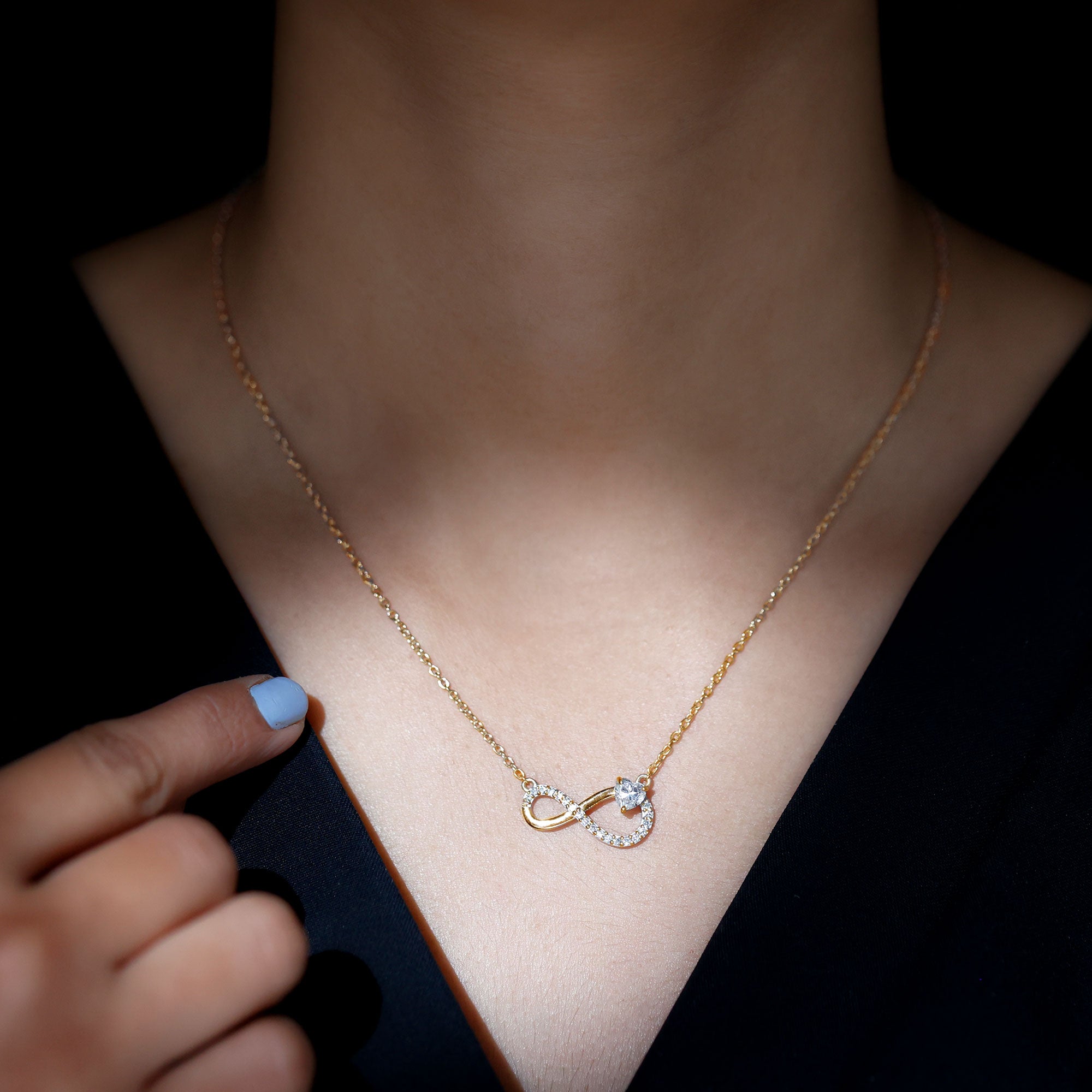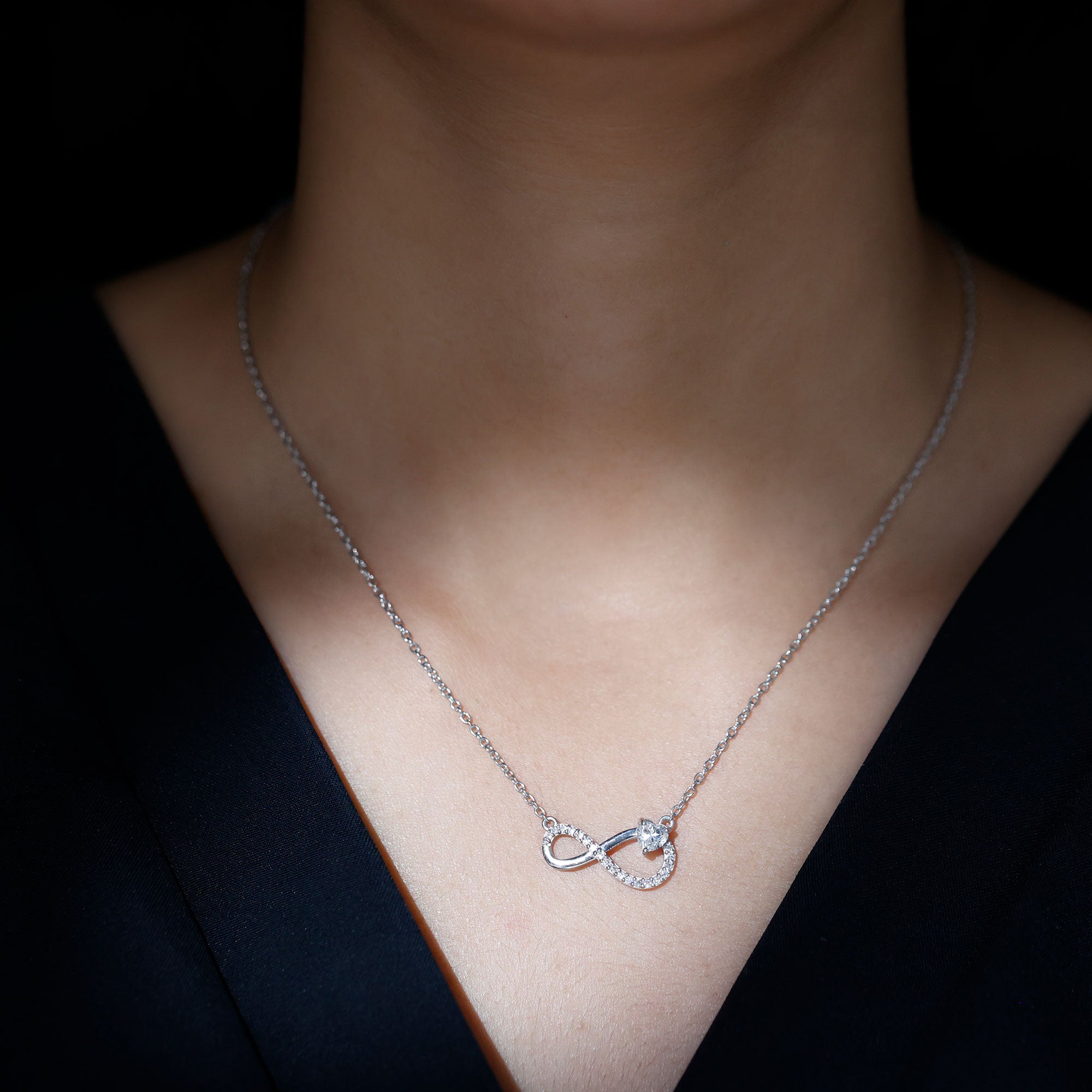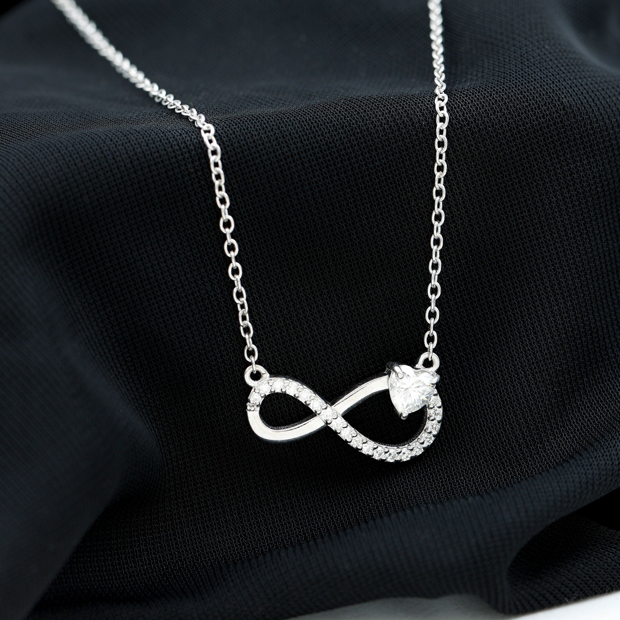Elevate your romantic gesture with a Heart Infinity Necklace. This exquisite piece embodies the spirit of everlasting love, featuring an infinity design adorned with a delicate row of round-cut diamonds that enhance its charm. The main stone is a Heart Shape Diamond (lab-created) which is elegantly set in secure prong setting, adding to its allure and romantic significance. Each diamond in this necklace has passed various quality checks, ensuring it perfectly represents your love story. The Infinity Diamond Necklace is an ideal gift for someone special in your life - a timeless emblem of your deep affection. This Diamond Necklace for Women arrives in a Signature Jewelry Box to keep it secure and make it more presentable.