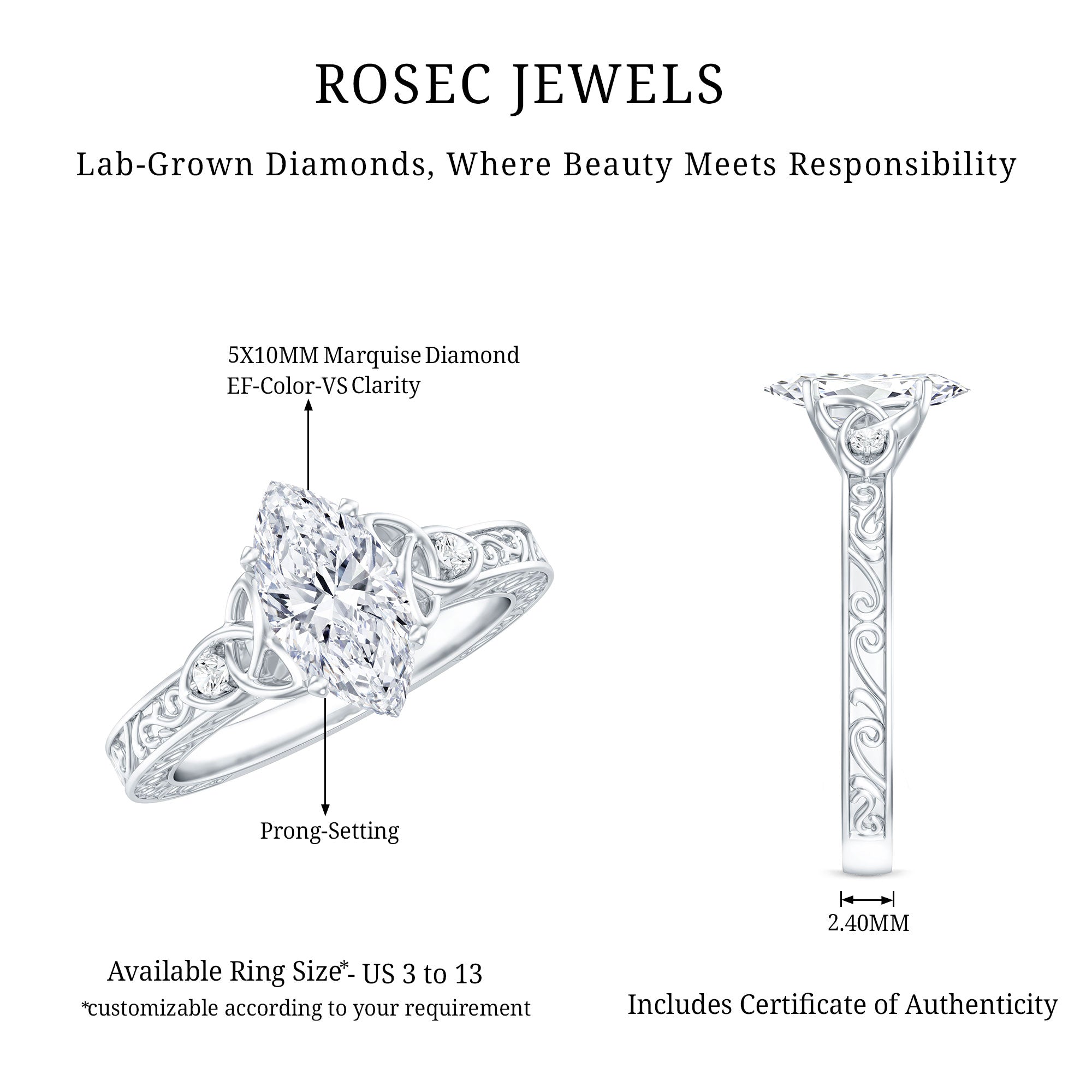 - Marquise-shaped lab grown diamond center