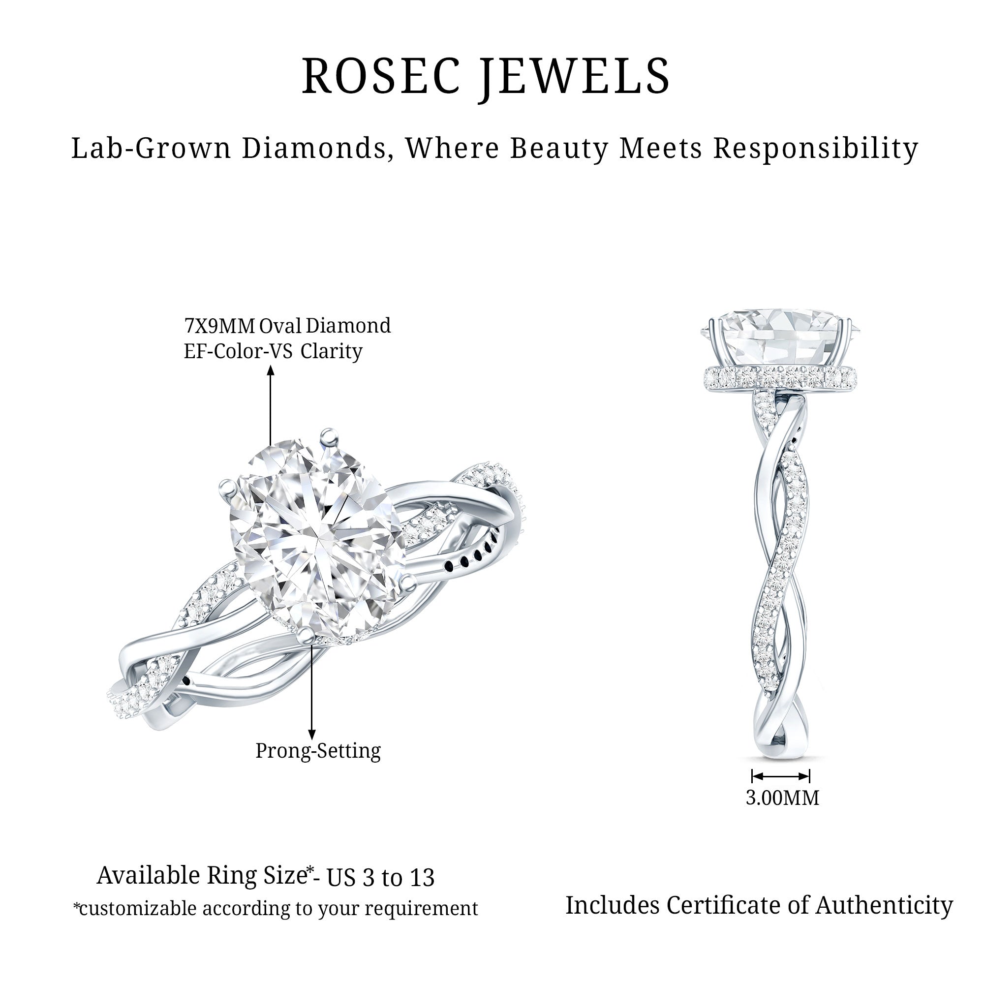 This Lab Grown Diamond Engagement Ring perfectly blends timeless elegance with modern trends, featuring a stunning 7X9 MM Oval Lab Grown Diamond set on a beautifully braided band. It is not just a ring, it is a moment captured in brilliance. Crafted with EF-VS quality diamonds, this Oval Engagement Ring effortlessly draws attention without uttering a word. The one strand of the braided band, embellished with delicate round lab diamond stones and the other one is made of plain metal, adds a contrasting feel that is both contemporary and meaningful. Just like your love story, this Diamond Braided Ring is a unique mix of beauty and strength. The real magic happens when you spot the hidden halo beneath the center stone, bringing a delightful surprise to your special day. Whether youre proposing or treating yourself to something iconic, this Hidden Halo Engagement Ring comes in a signature jewelry box and is available in various sizes, ensuring every hand gets a sparkle that fits perfectly. Elevate the yes moment or gift it as a token of self-love; you truly can not go wrong with a classic designed to shine for a lifetime.