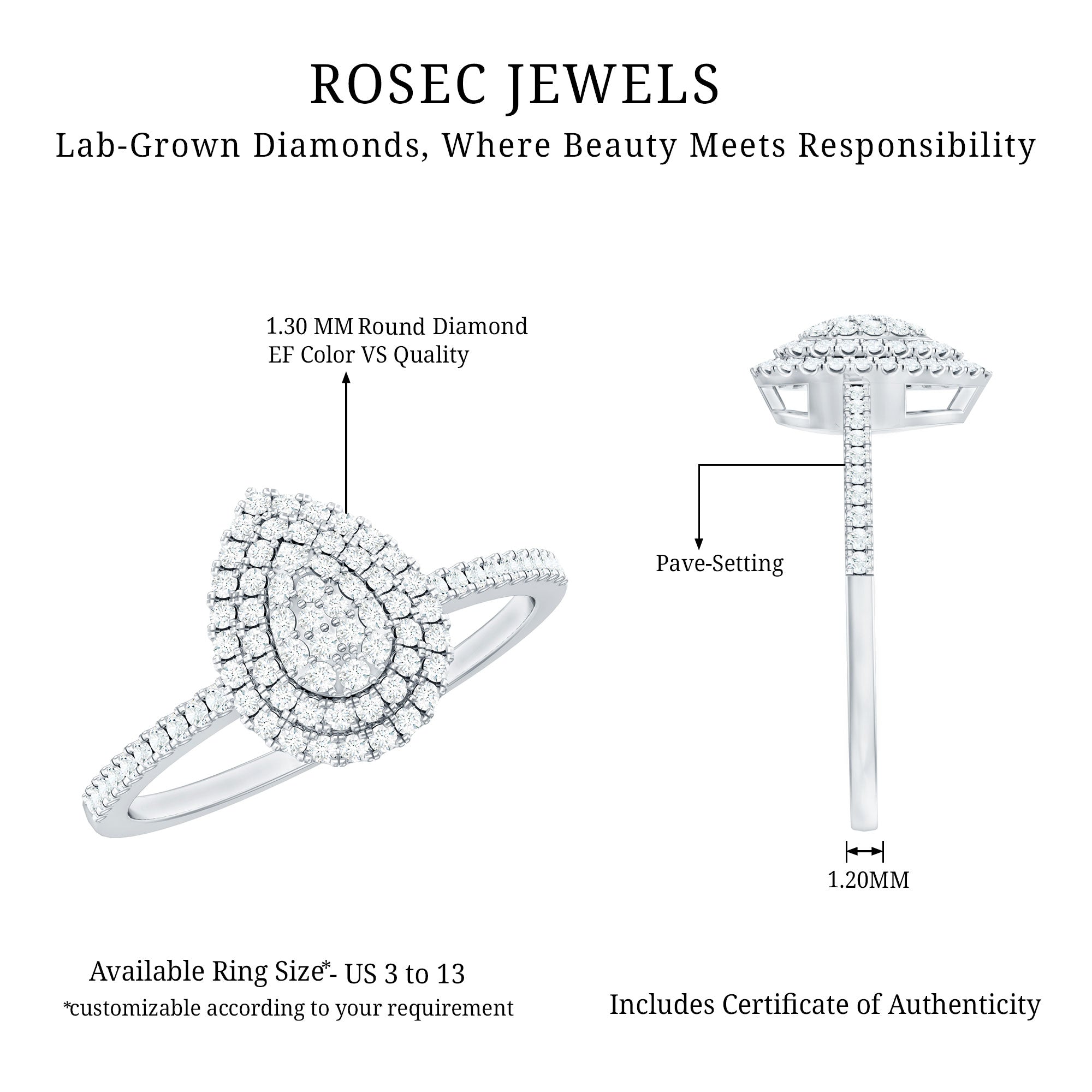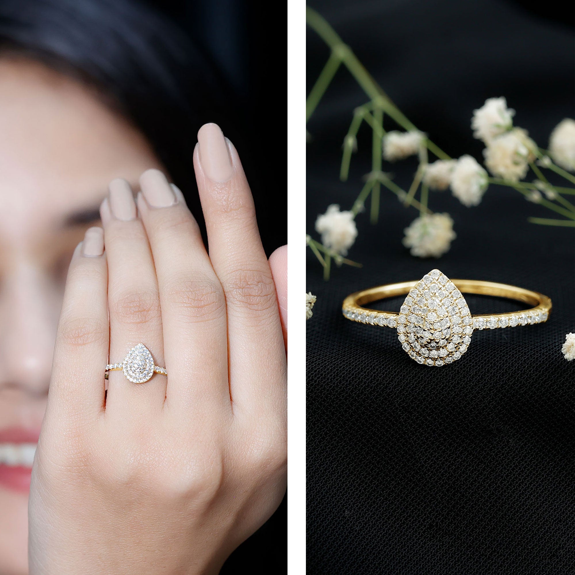 Get ready to say YES to forever with this Lab Grown Diamond Engagement Ring, it is ready to seal the deal in the most stunning way possible. This Teardrop Ring is a stunning mix of modern design and classic elegance. Featuring a distinctive teardrop shape made from tiny round lab grown diamond stones, this Cluster Engagement Ring sparkles with every movement. It is both elegant and charming, making it ideal for anyone who appreciates delicate yet striking jewelry. With certified EF-VS quality, the Lab Grown Diamond shines with unmatched fire and clarity, offering an eco-friendly yet luxurious option for any bride-to-be. The uniquely designed pear shape represents teardrops of joy, while the side stones on the band create a mesmerizing sparkle from every angle. This Timeless Engagement Ring comes beautifully packaged in a jewelry box, making it perfect for surprise proposals or milestone celebrations. Crafted with precision and available in various sizes, this Womans Diamond Ring (Lab Grown) guarantees a perfect fit for every hand and heart.