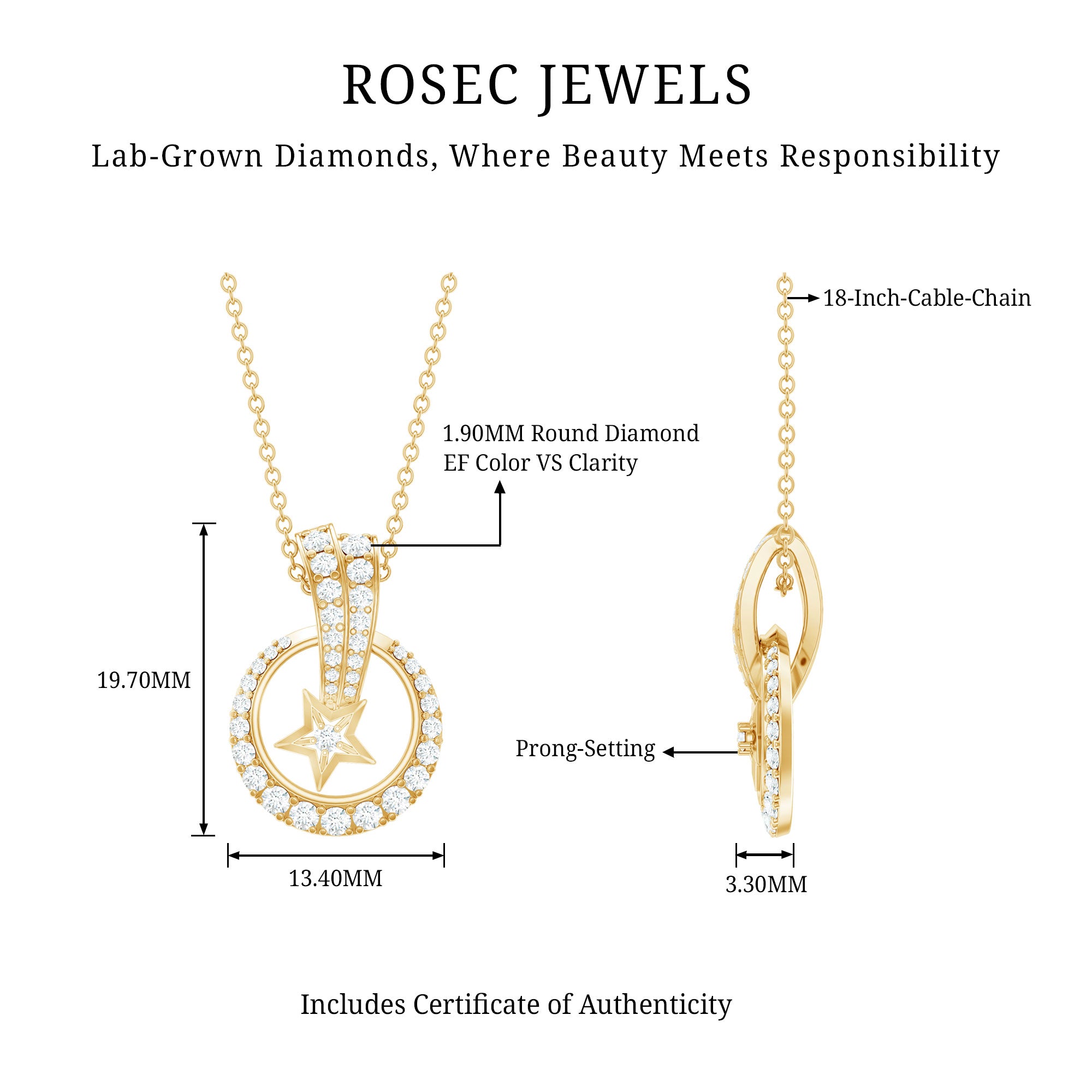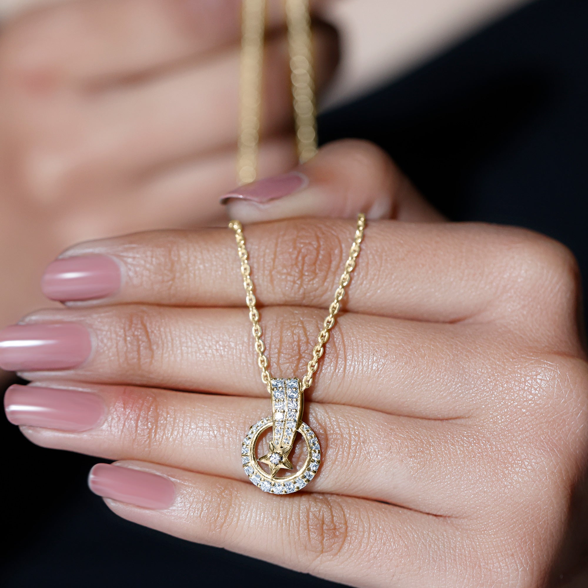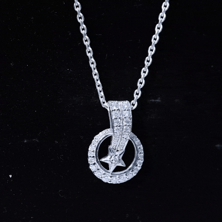 Shine like the star you are with this breathtaking Diamond Celestial Necklace, it is not just a piece of jewelry but a statement of brilliance. This Designer Pendant features an open circle frame and a shooting star motif adorned with sparkling round cut diamonds (lab grown) set in secure prong setting. The unique hidden bail detailing enhances the beauty of this Diamond Star Necklace. Comes with a certificate of authenticity, this Diamond Necklace for Women sits perfectly on the neckline, offering both comfort and elegance. Whether worn as a symbol of aspiration or gifted as a meaningful token, this Star and Moon Necklace is a timeless treasure that speaks of dreams, sparkle, and refined luxury.