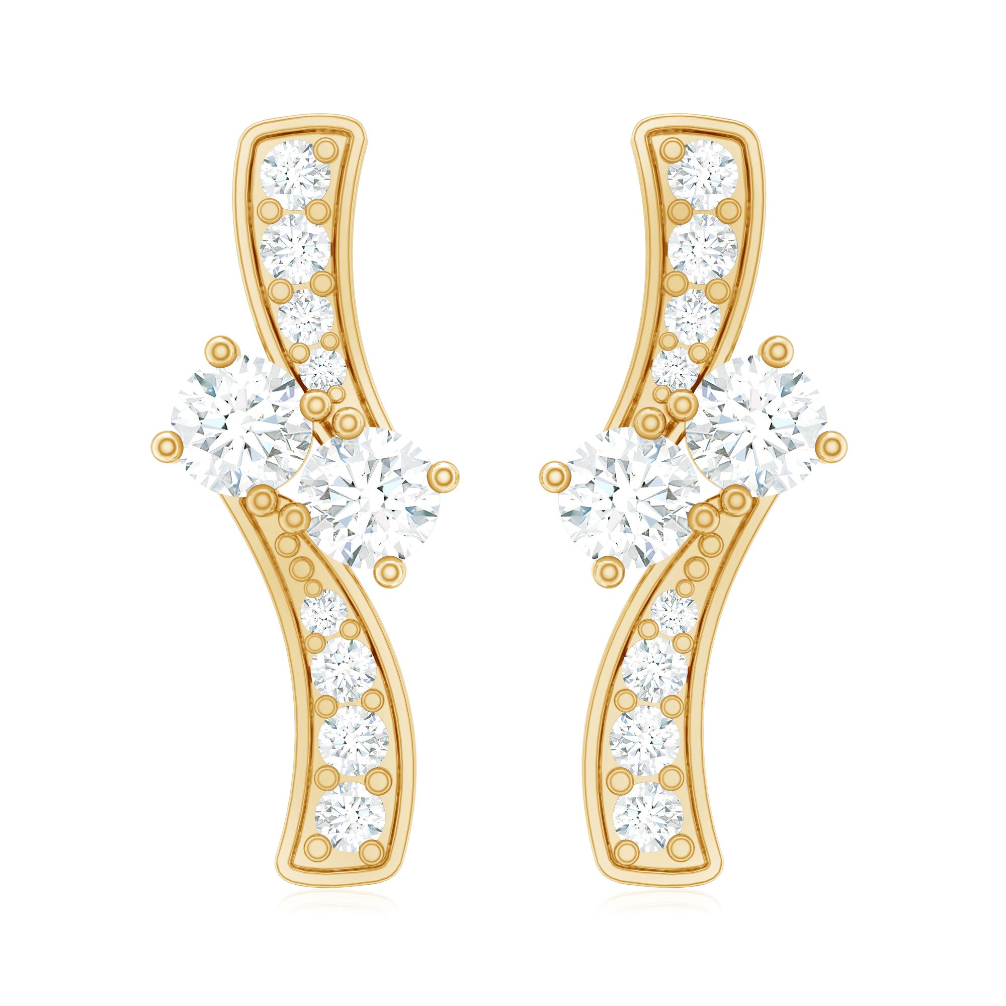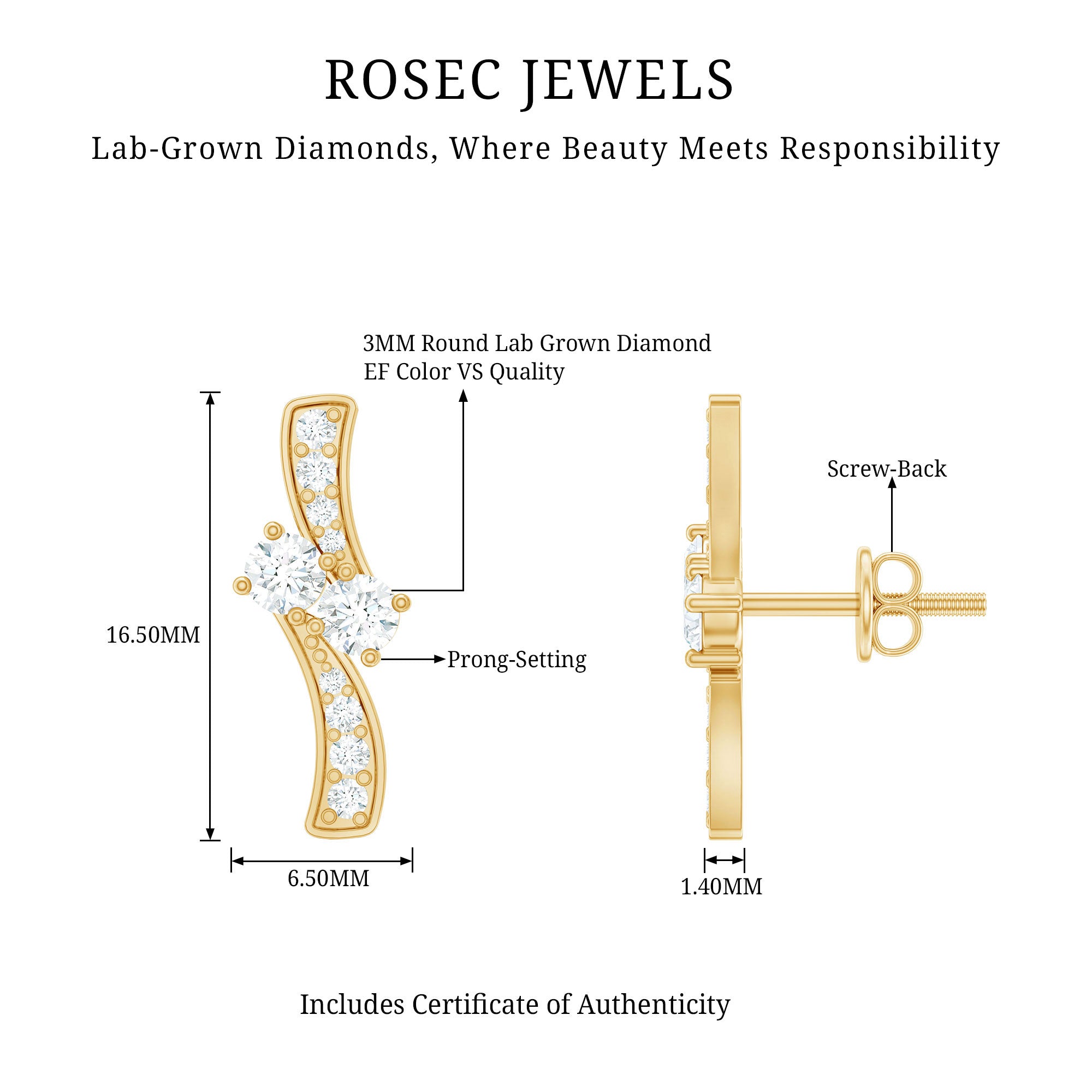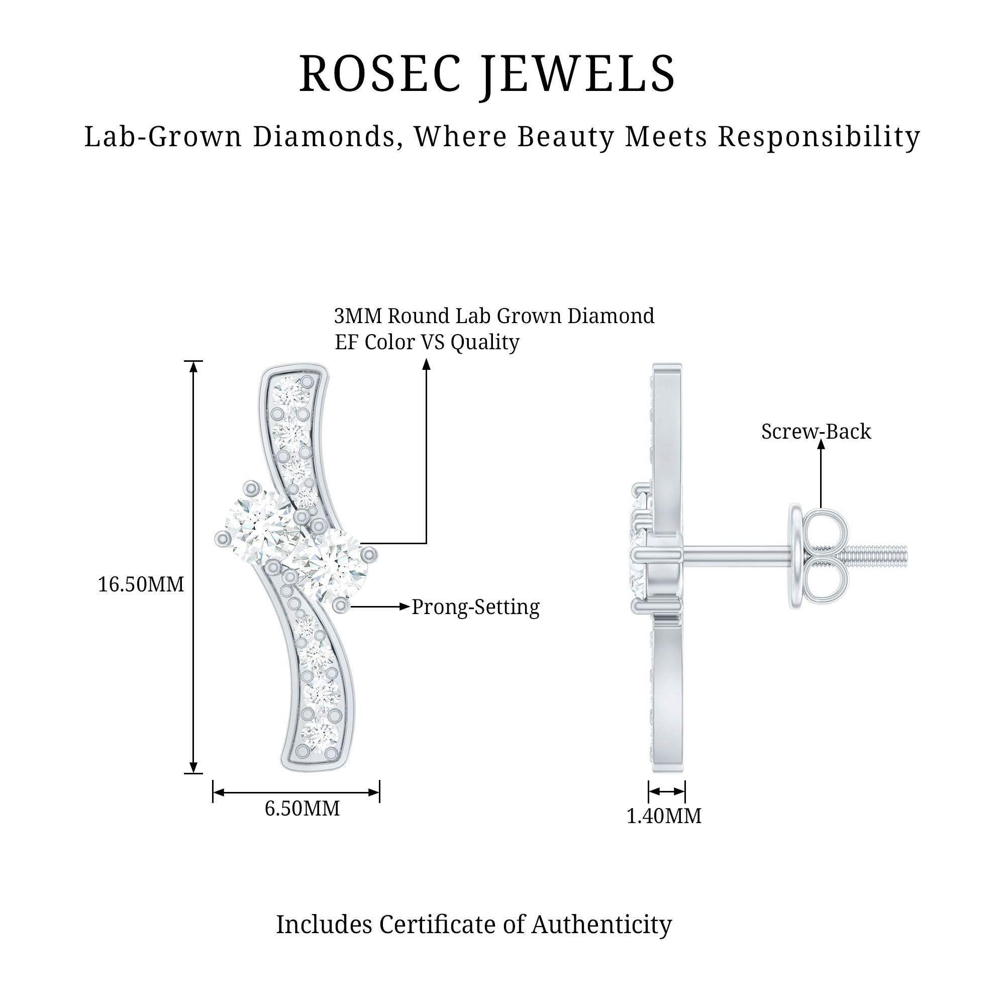 Adorn yourself with understated elegance by wearing these lab grown Diamond Stud Earrings featuring Round Shape Diamonds (Ef-Vs quality) set in a secure prong setting over a bypass design. The Screw Back Closure ensures a secure fit, offering both comfort and style. For those who are in search of April Birthstone Earrings, they offer an affordable yet luxurious option without compromising on quality or style and all of our jewelry comes in the appropriate packaging ensuring they are ready for gifting upon arrival. Crafted with perfection, these Man Made Diamond Earrings showcase Rosec Jewels commitment to quality and sustainability.