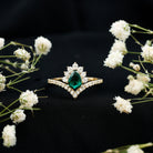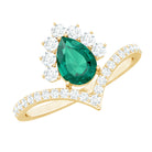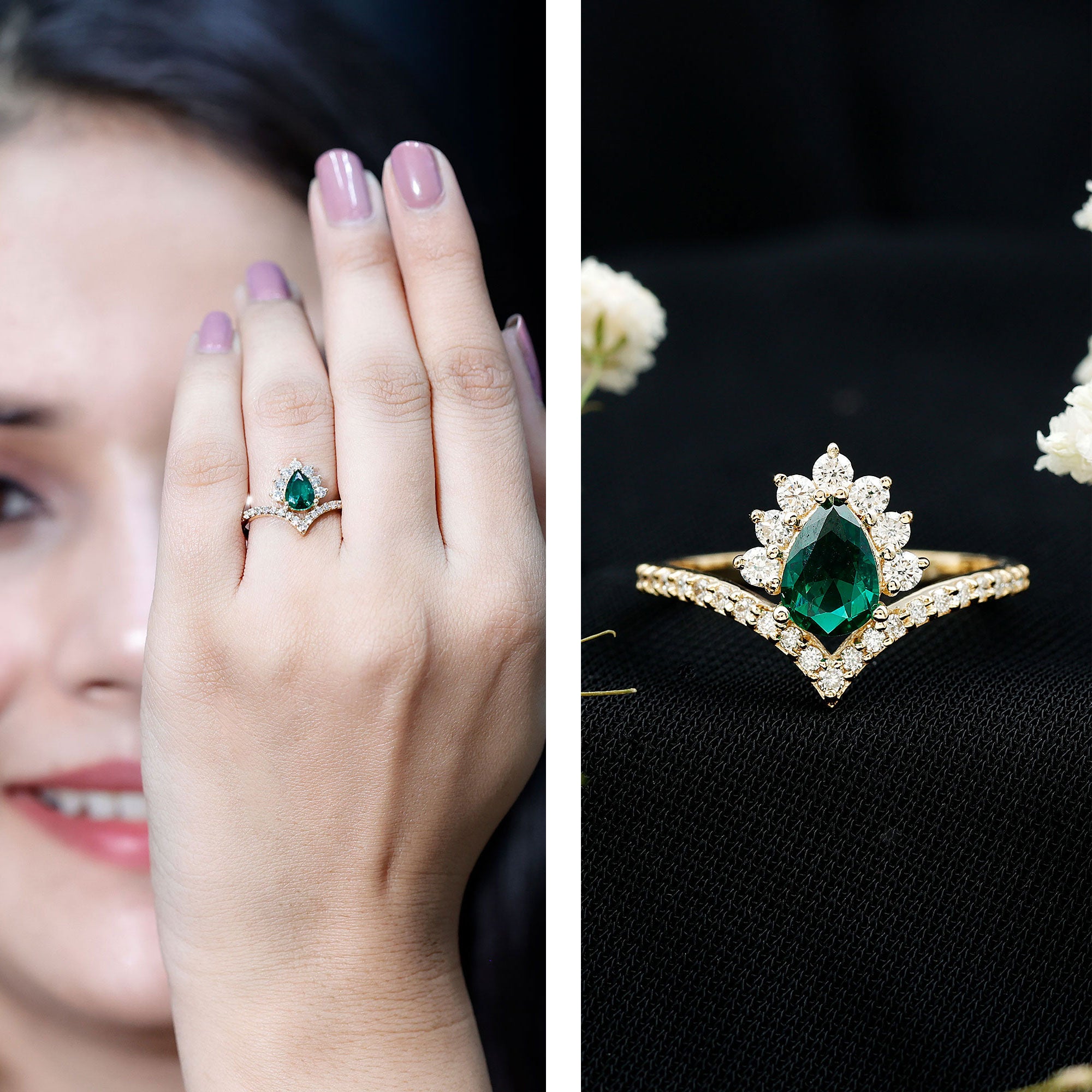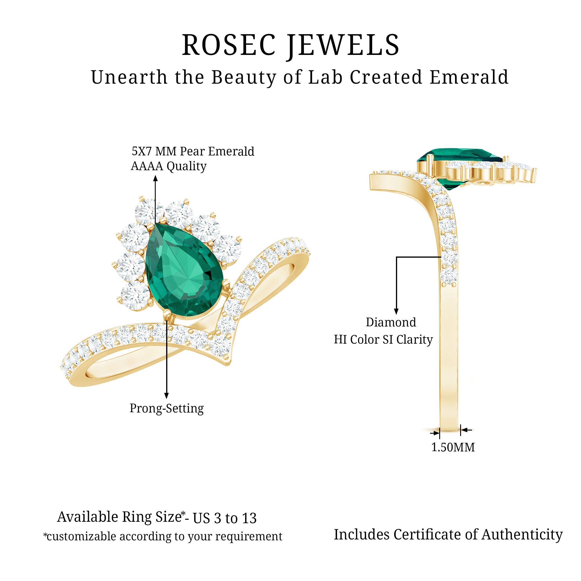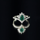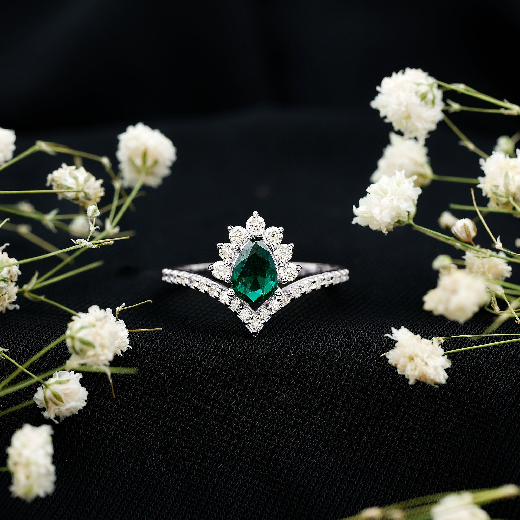 This designer engagement ring features a captivating combination of lab created emerald and Diamond gemstones. The centerpiece is a pear-shaped created emerald, delicately held in a three-prong setting. Surrounding this stunning center stone are precious round-cut Diamond gemstones, carefully placed in an accent setting along a gracefully metal curved shank, creating a crown-like appearance.