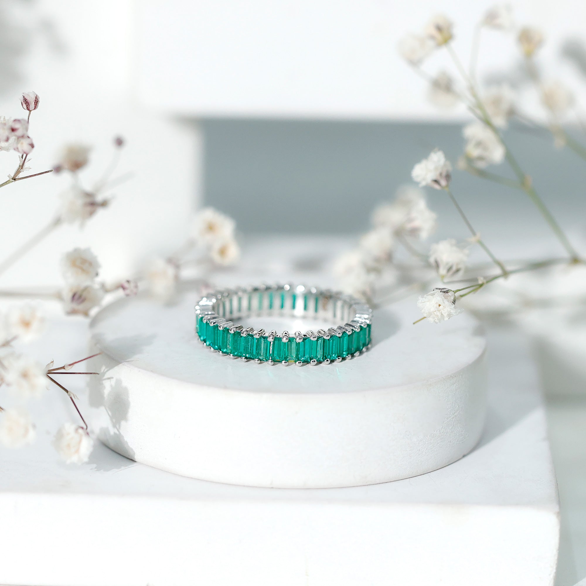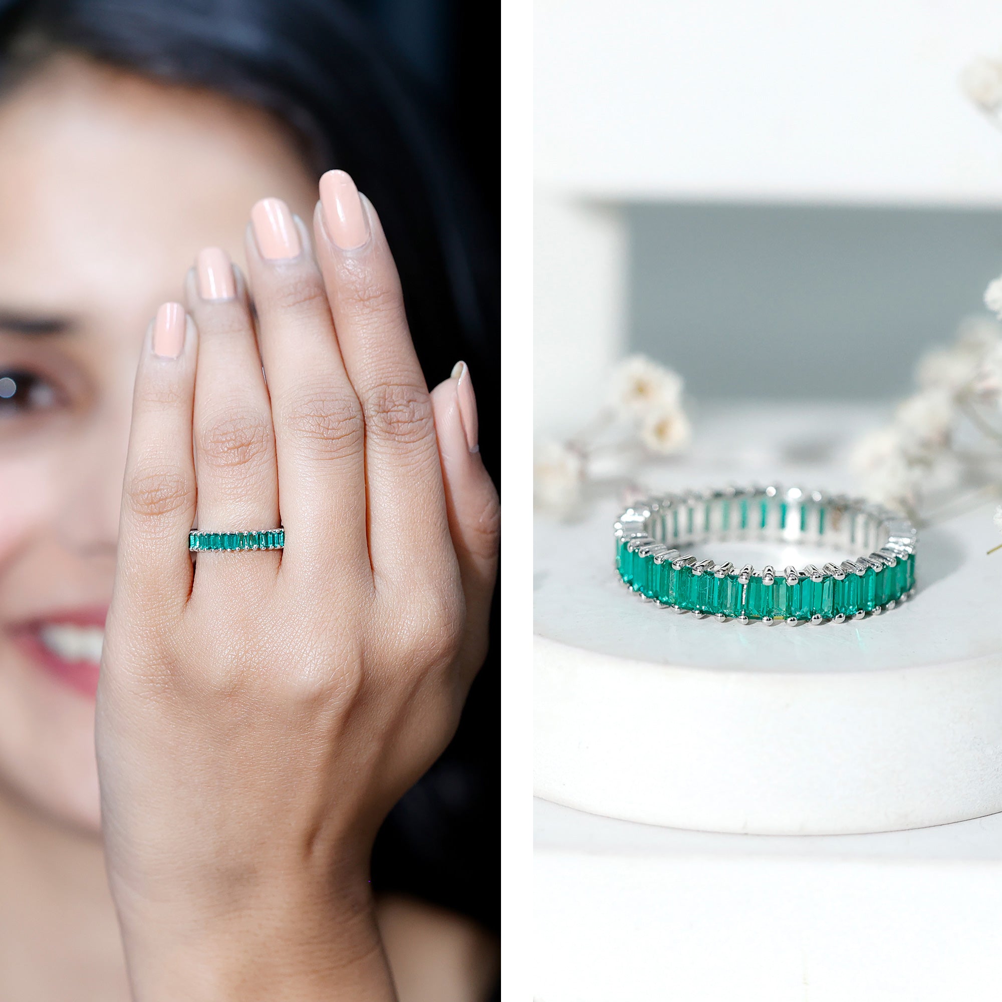Elegantly designed for everyday styling, this Lab Cultured Emerald Wedding Ring is adorned with Baguette Cut Lab Created Emerald in Prong Setting. Complement your outfit with this Stackable Ring for an elegant look. This Emerald Baguette Ring is perfect to make your love bloom which makes it a perfect symbol of timeless devotion along with modern elegance. This Emerald Eternity Band can be worn as a stable band to achieve a classic signature look. This ring beholds the shine of AAAA quality Emerald and will add extra shine to the celebration.