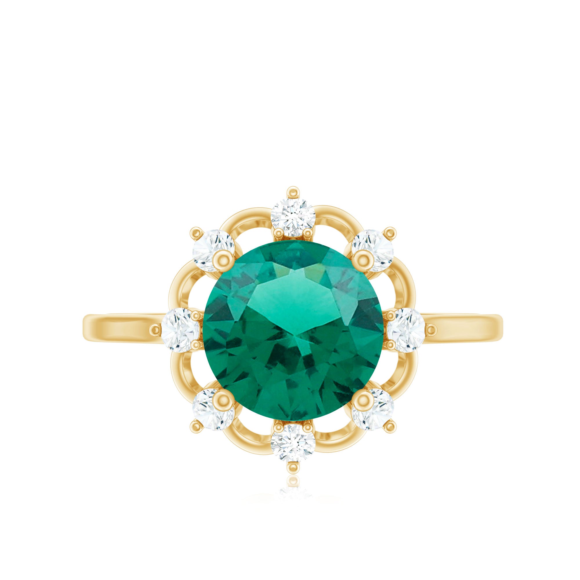Mesmerize onlookers with the Floral Engagement Ring, a stunning embodiment of elegance and sophistication. An 8 mm Round Shape Emerald (lab grown) takes center stage, surrounded by a delicately handcrafted floral motif adorned with sparkling Lab Grown Diamond gemstones that add a touch of glamour. Meticulously crafted by Rosec Jewels, known for their commitment to ethically sourced gems, this Aaaa quality Emerald Engagement Ring is a symbol of love, making it the perfect choice for a memorable and conscious declaration of eternal commitment. This Emerald and Diamond Ring brings the perfect mix of elegance and boldness, ensuring all eyes are on you. Its eye-catching design makes it an ideal accessory for adding a touch of retro luxury to your ensemble.