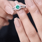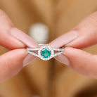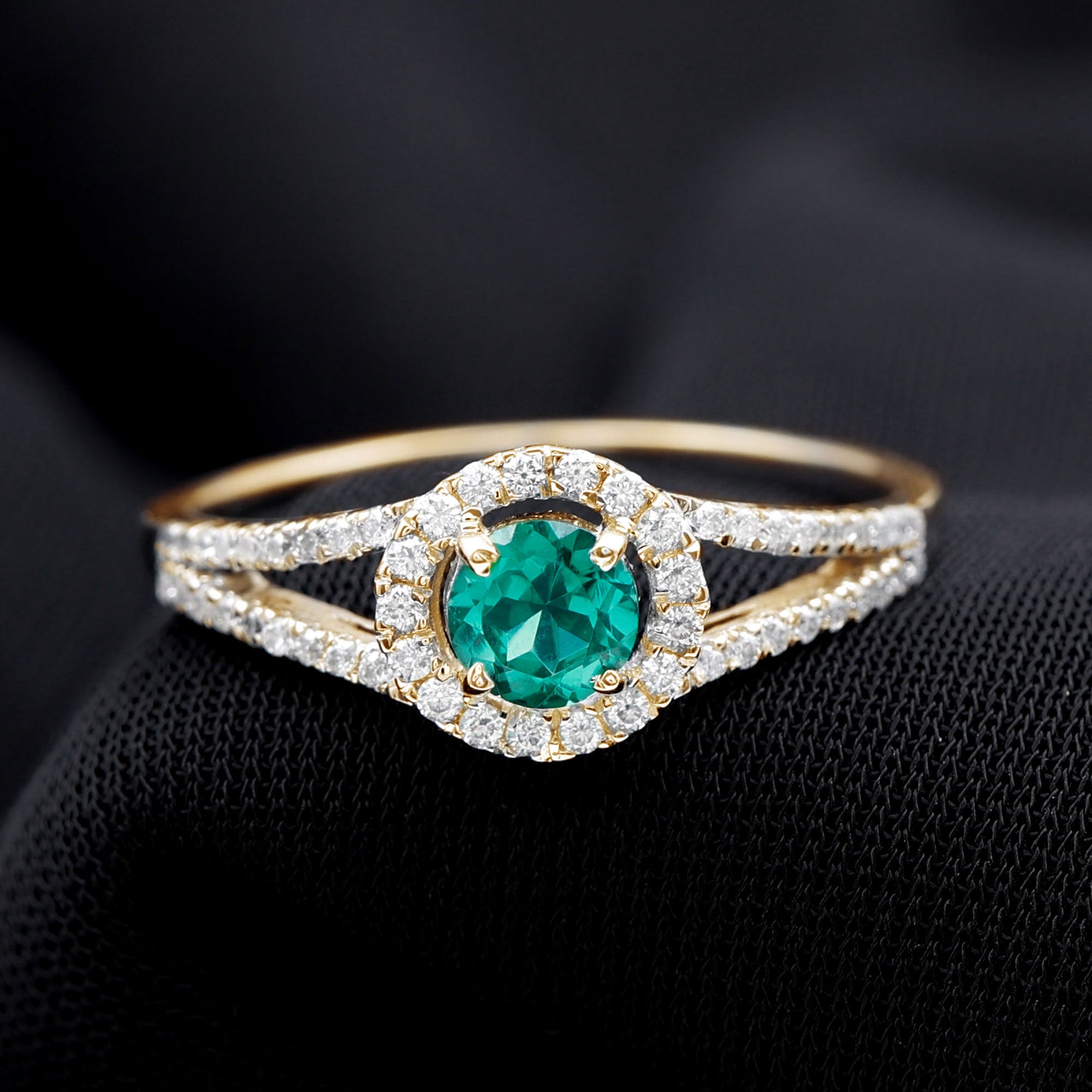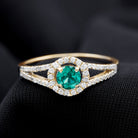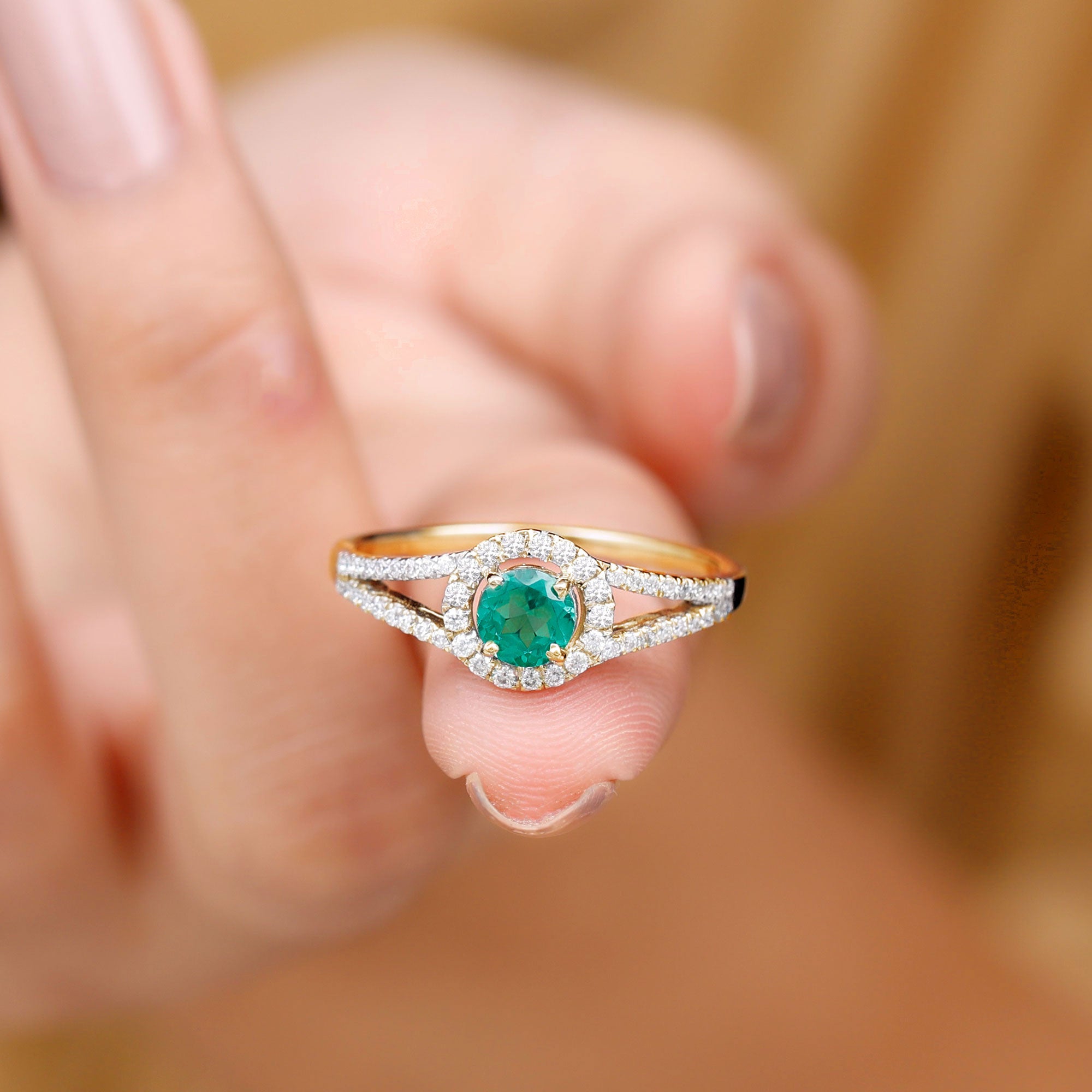 This Lab Grown Emerald Engagement Ring is a masterpiece of elegance, designed to make your proposal moment unforgettable. Captivating hearts, this Split Shank Engagement Ring is adorned with a 6 mm Round Shape Lab Created Emerald of Aaaa Quality set in Prong Setting, its rich green hue full of life and meaning, encircled by a shimmering Halo of Diamond gemstones that enhance its glow and brilliance. The Split Shank band not only adds a modern, stylish touch but also carries symbolism, two paths coming together as one, reflecting the union of two souls in love. The combination of the lush green of Lab Emerald with the sparkling white brilliance of Natural Diamond gemstones creates a striking contrast of color and sparkle. With every glance, this Emerald Diamond Engagement Ring captures the moment, turning heads with its beauty and radiance. A meaningful and thoughtful choice, this Emerald Halo Engagement Ring offers the same timeless allure and elegance as a natural emerald engagement ring but with the ethical and affordable brilliance of a Lab Grown Emerald. Perfectly crafted, this Classic Engagement Ring is a celebration of love, commitment, and the beginning of forever.