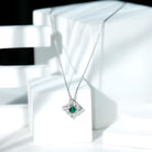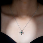 Experience the everlasting allure of our Emerald Flower Pendant, crafted from exquisite 14k white gold plated sterling silver. Adorned with dazzling moissanite stones and a vibrant lab emerald, this Floral Necklace is designed to make a memorable impact and enhance any ensemble. The pendant features an elegant floral motif, showcasing a prong set 6 MM round cut lab-created emerald at its heart, complemented by petite moissanite gems arranged in a distinctive flower-shaped metal frame. With its delicate elegance, this Lab Grown Emerald Necklace perfectly accentuates your personal style. The rich green tone of the AAAA quality emerald exudes sophistication and beauty, making it an ideal accessory for any event. This Unique Nature Inspired Necklace is perfect not just for daily wear but also for cocktail parties as a chic fashion statement, as a meaningful gift for birthdays, anniversaries, or Valentines Day for someone dear, or even worn on your wedding day for a breathtaking contrast.