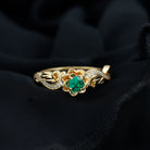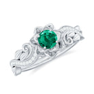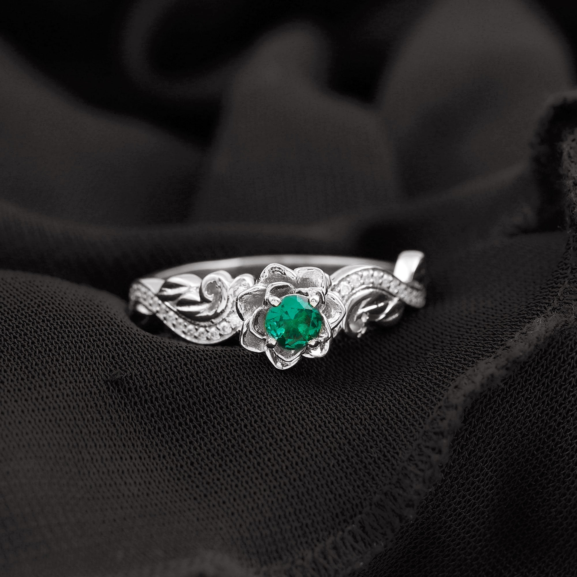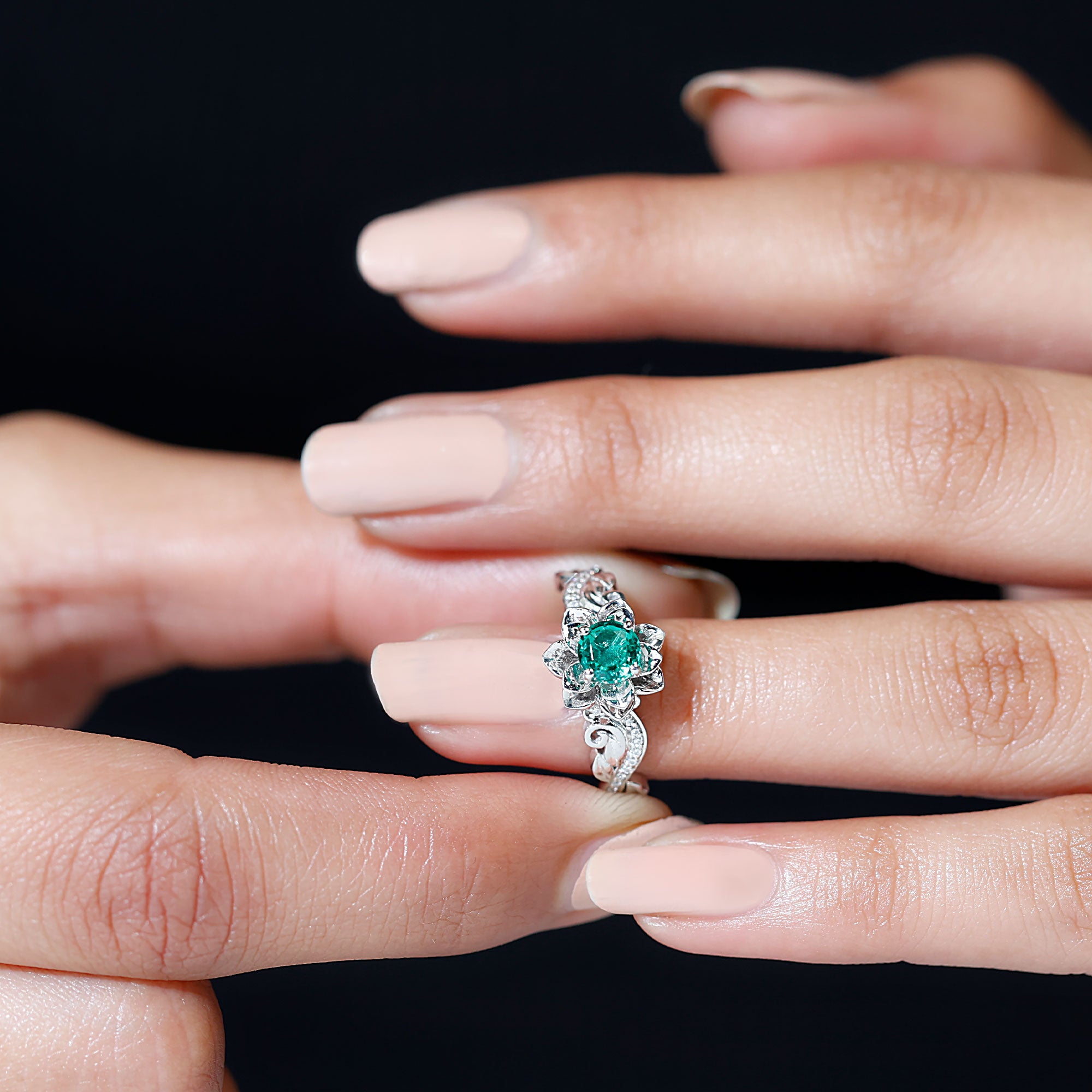 An enchanting piece of jewelry, this Flower Engagement Ring is designed to celebrate love with nature-inspired beauty. At the center of this Nature Inspired Engagement Ring sits a stunning 4 mm Round Shape Lab Created Emerald set in a mesmerizing rose flower motif that symbolizes growth, beauty and new beginnings. The rich green hue of the Lab Emerald adds a vibrant and elegant touch, making the centerpiece stand out beautifully. Surrounding the band are dainty Moissanite stones, carefully studded over with intricate leaf detailing, giving this Lab Grown Emerald Ring a delicate and graceful look. The combination of the sparkling Moissanite and the vivid green AAAA Quality Lab Emerald creates a perfect balance of color and brilliance. Every element of this Lab Emerald Engagement Ring is thoughtfully designed to reflect both timeless elegance and the beauty of nature. The Lab Grown Emerald offers ethical and sustainable brilliance and also serves as a unique symbol of everlasting love. This enchanting Lab Created Emerald Ring is sure to become a treasured piece in her jewelry collection. It is perfect for someone who loves elegant, meaningful designs, destined to be cherished for a lifetime.