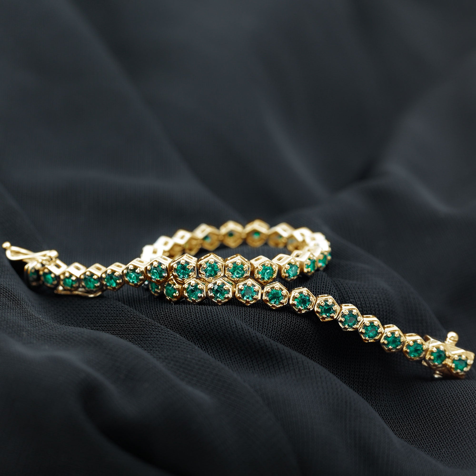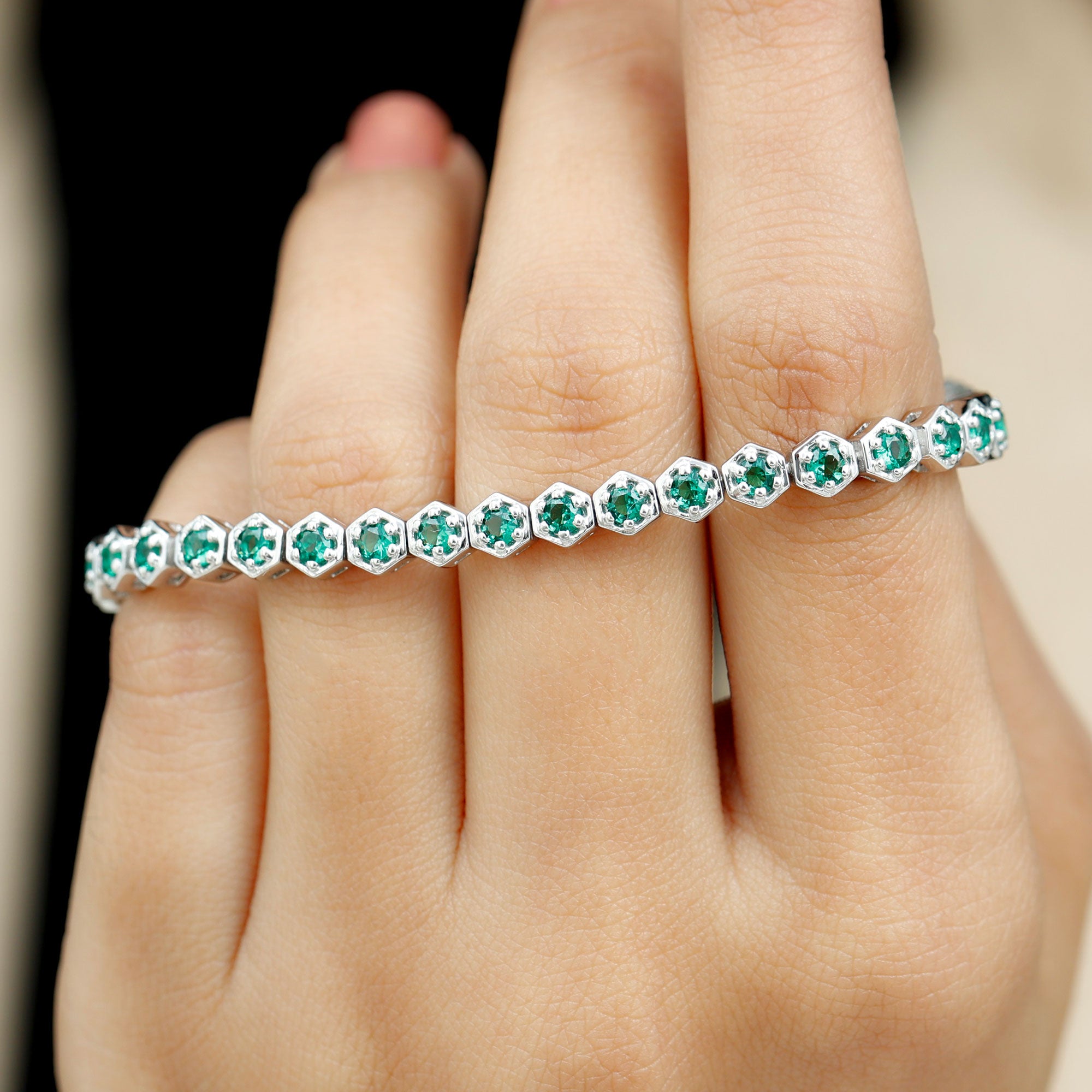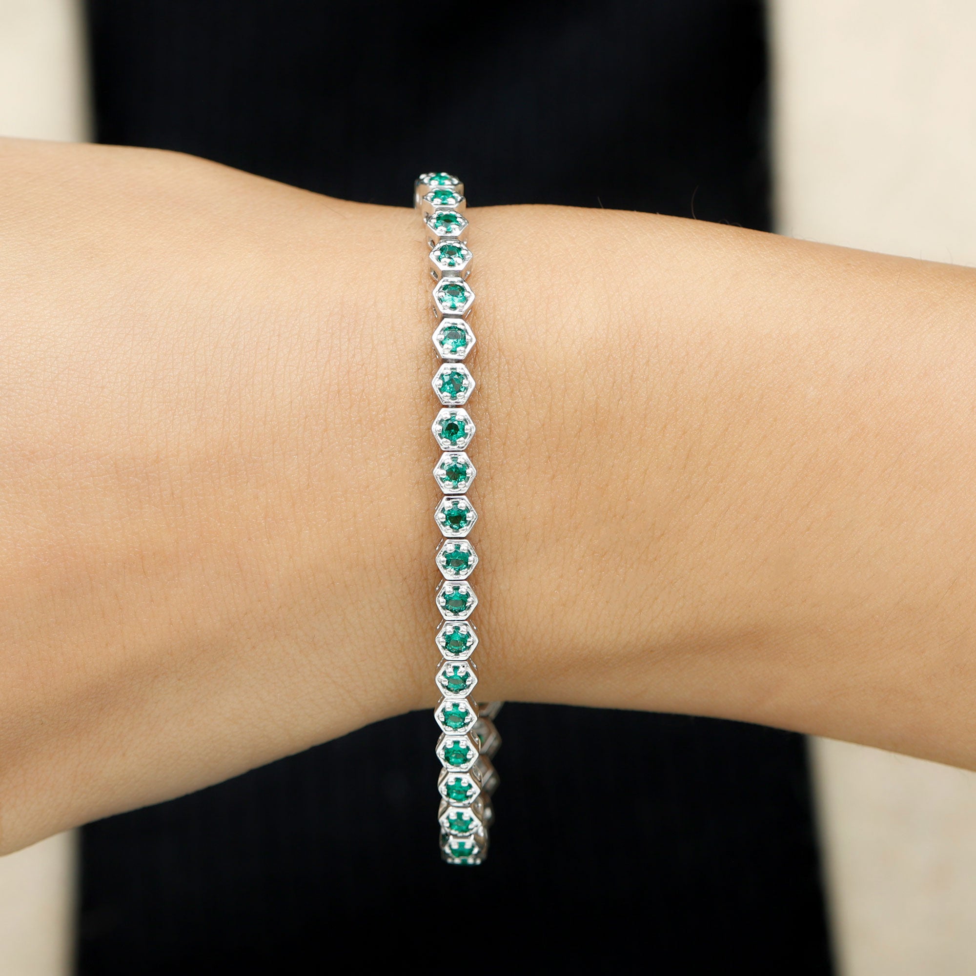 The tennis Bracelet is embellished with the stunning Round Created Emerald in the unique hexagon frame. This gorgeous piece is perfect for Brides, Bridesmaid or Brides Mother. Wedding Bracelet.