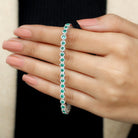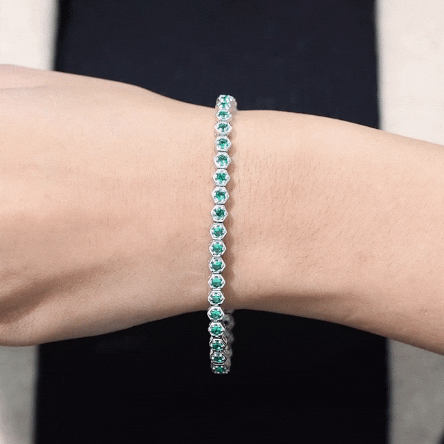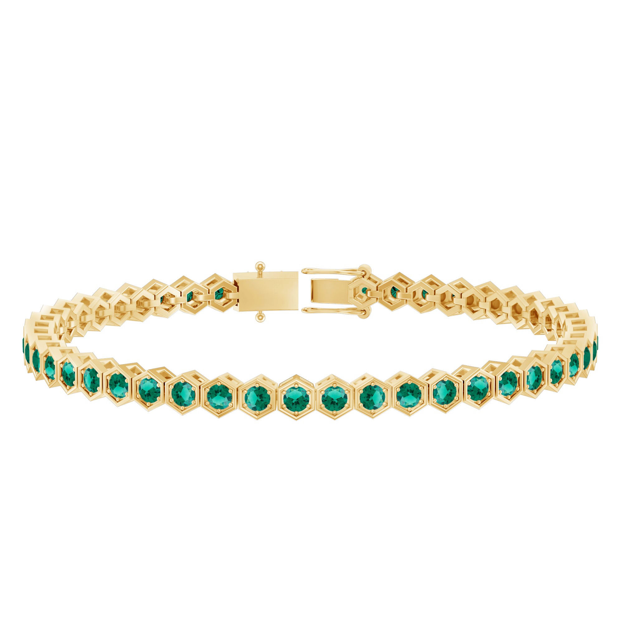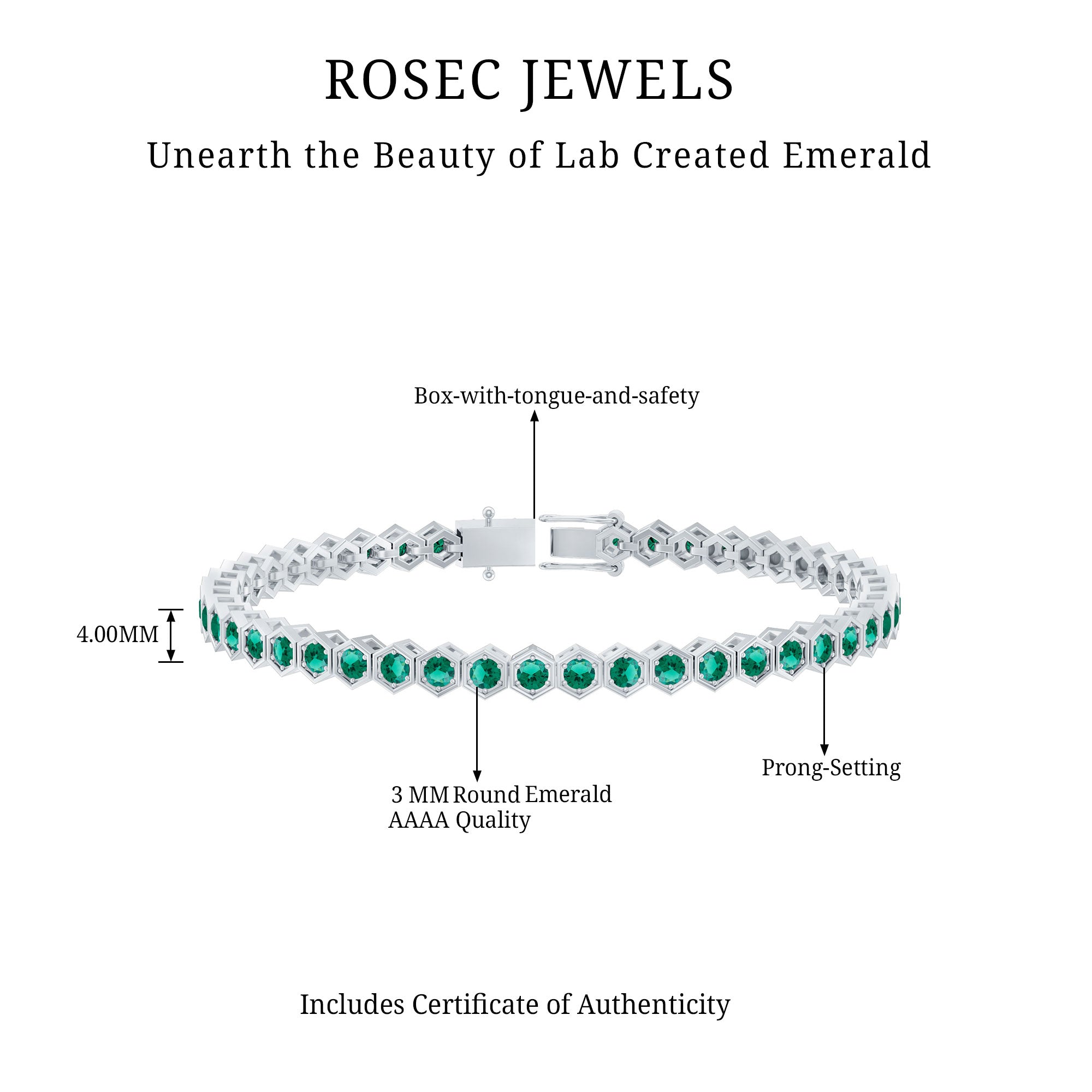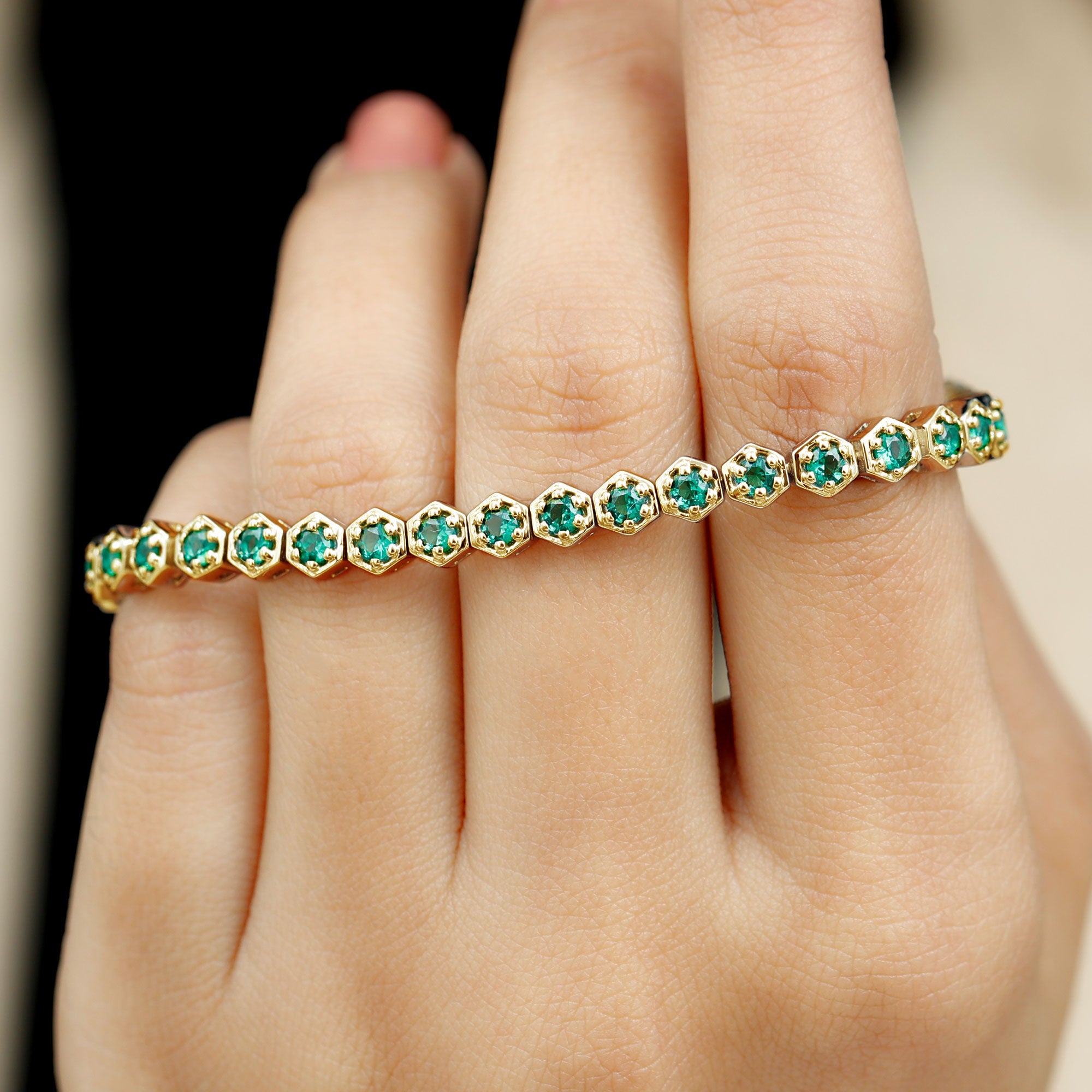 The tennis Bracelet is embellished with the stunning Round Created Emerald in the unique hexagon frame. This gorgeous piece is perfect for Brides, Bridesmaid or Brides Mother. Wedding Bracelet.