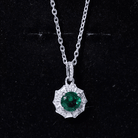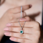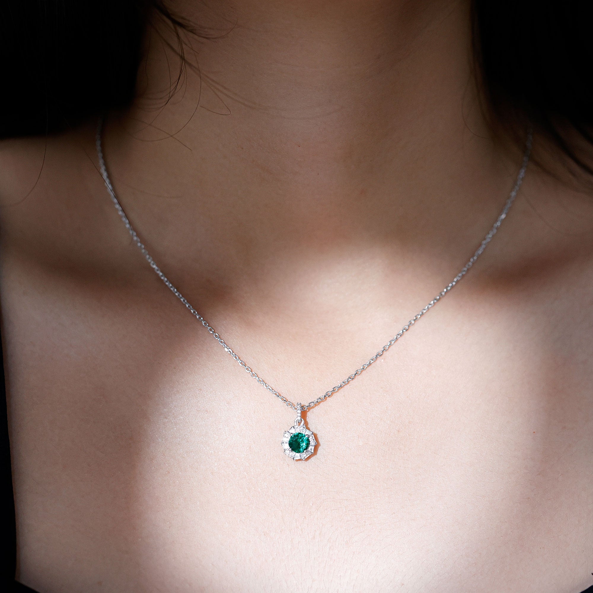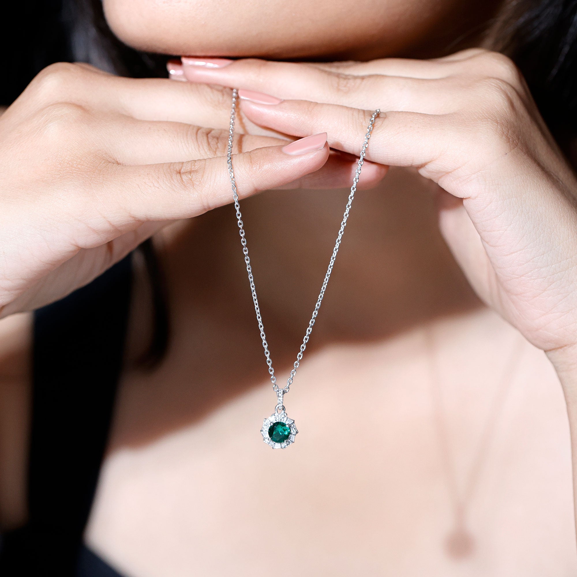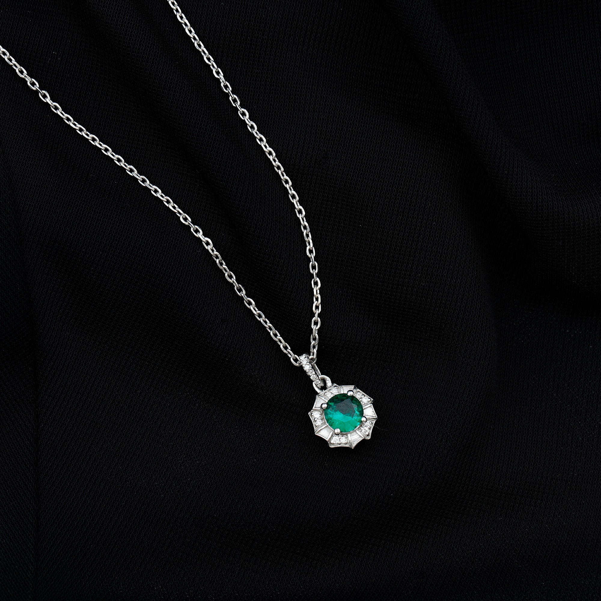 Experience the opulent charm of our Emerald Flower Pendant Necklace, crafted from exquisite 14k white gold plated sterling silver. Adorned with dazzling moissanite stones and rich emeralds, this Floral Necklace is designed to make a bold impression and enhance any ensemble. The pendant features a delicate floral motif, showcasing a prong set 6 MM round cut lab-created emerald at its heart, encircled by petite moissanite gems set in a unique metal frame, also gracing the bail for more sparkle. With its understated floral elegance, this Emerald and Moissanite Necklace complements your unique style beautifully. The rich green tone of the emerald exudes sophistication and allure, making it an ideal accessory for any event. This Emerald Vintage Necklace is not just for daily wear, it can be worn at cocktail parties as a chic fashion statement, gifted for birthdays, anniversaries, or Valentines Day to a cherished person, or even donned on your wedding day for a striking contrast. Elegant, timeless, and unforgettable - this Flower Locket Necklace is crafted for those who wish to shine in their own way. Treat yourself or a loved one to this truly remarkable piece of jewelry.