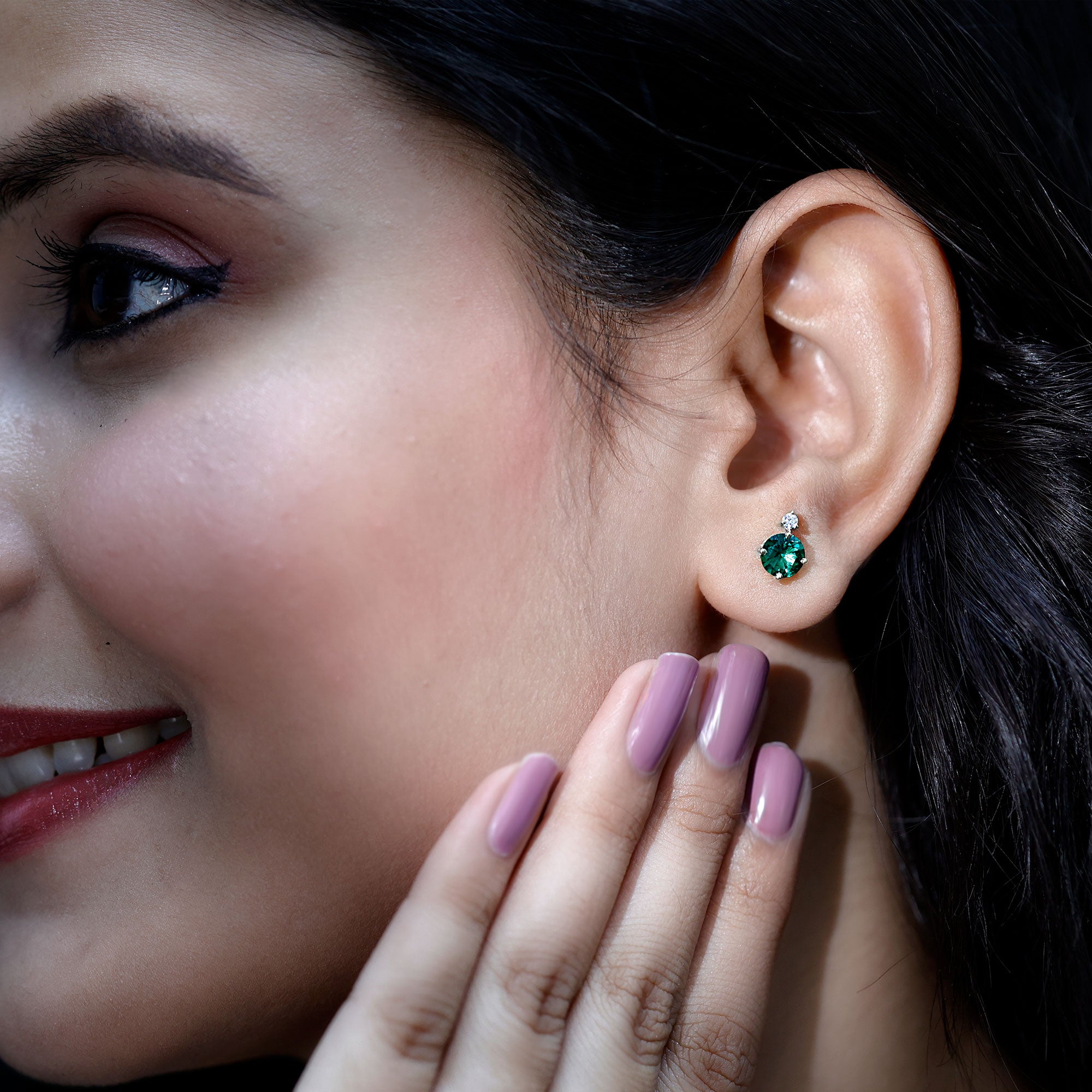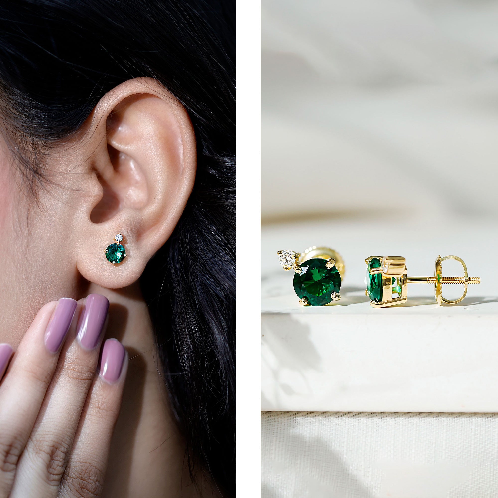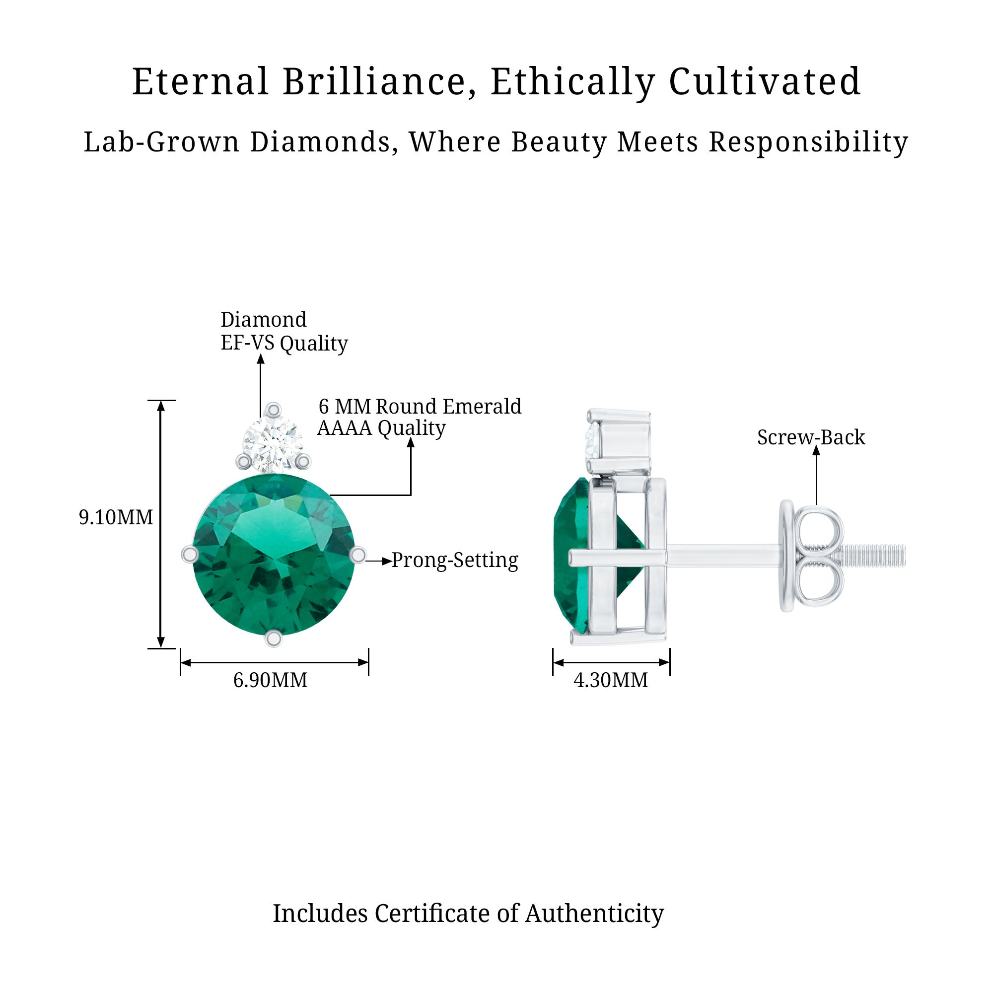 These Lab Created Emerald Stud Earrings are the perfect epitome of elegance and sophistication and come with screw back closure. The 6 mm Round Shaped Emerald of AAAA Quality is securely held in a Prong Setting with a dazzling Lab Grown Diamond sparkling from the top of these beautiful and eye-catching Green Gemstone Earrings. The Unnatural Emerald being richest in its color is similar to gorgeous naturally mined emeralds. The Rosec Jewels lets you shine like a diva and will make your event more special either when worn as Solitaire Studs or are a unique gift for that special person for their special occasion.