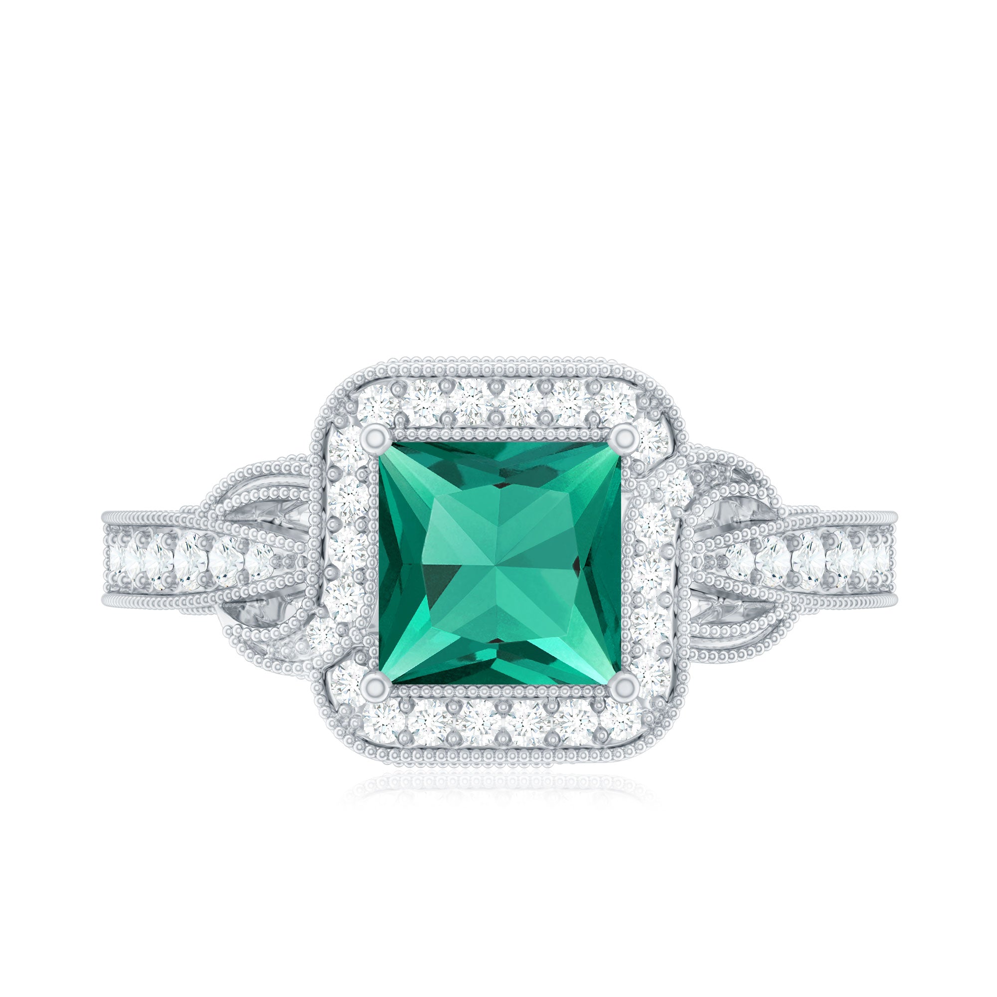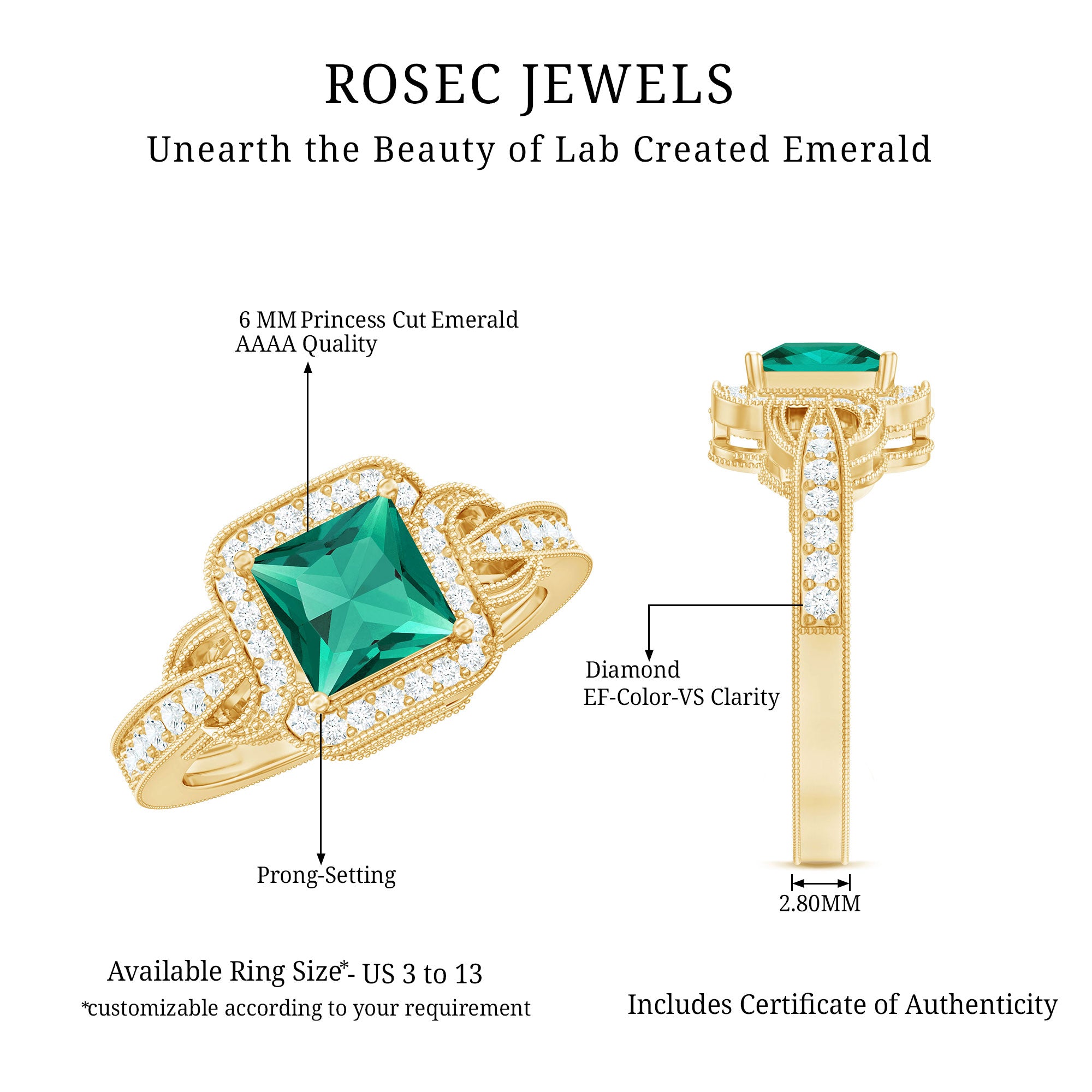 Embark your journey into timeless elegance with this Art Deco Engagement Ring showcasing a stunning 6mm Princess Cut Lab Grown Emerald gemstone set as a centerpiece. Delicate Lab Grown Diamond gemstones and Beaded Detailing enhance the vintage charm, creating a captivating and romantic aesthetic. The Aaaa Quality Emerald and Ef-Vs Quality Diamonds defines sustainability. This enchanting Emerald Diamond Ring (Lab Created) is a testament to our dedication to ethical and eco-friendly practices.