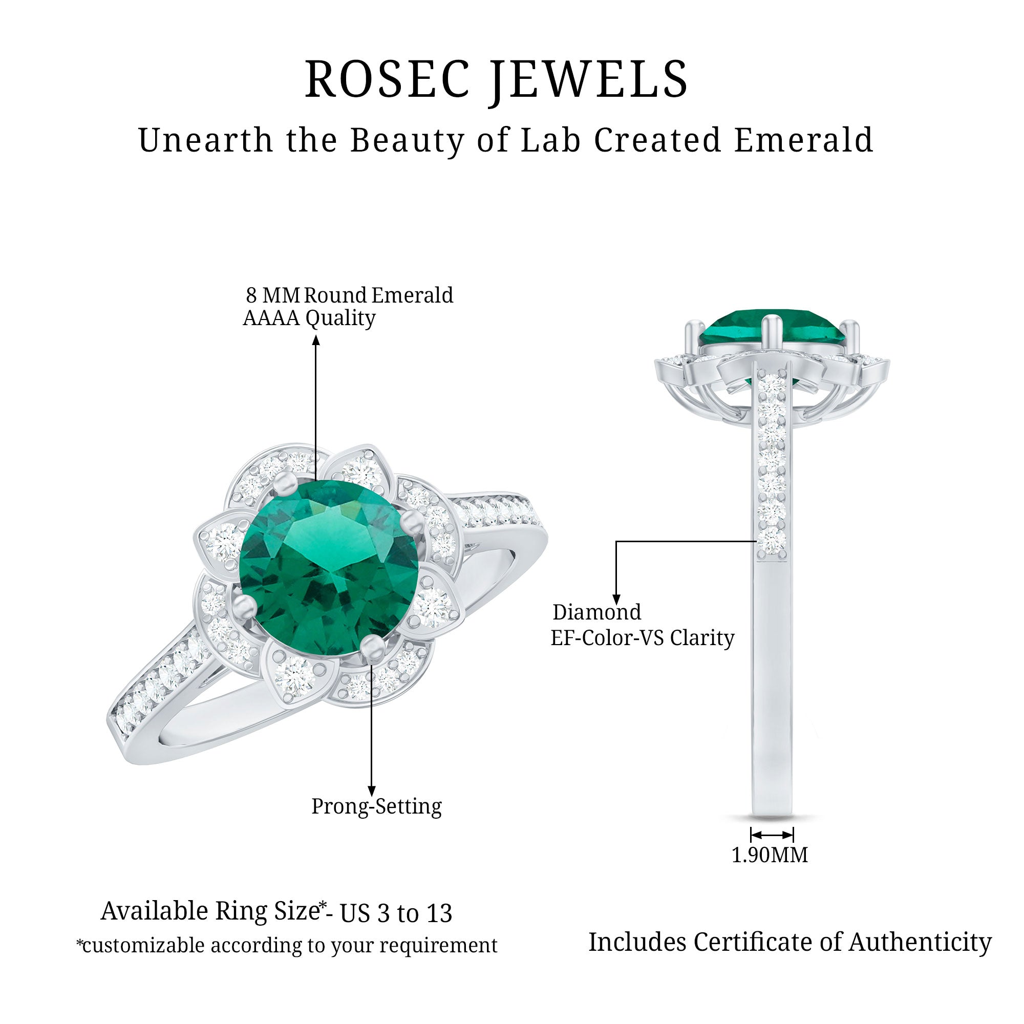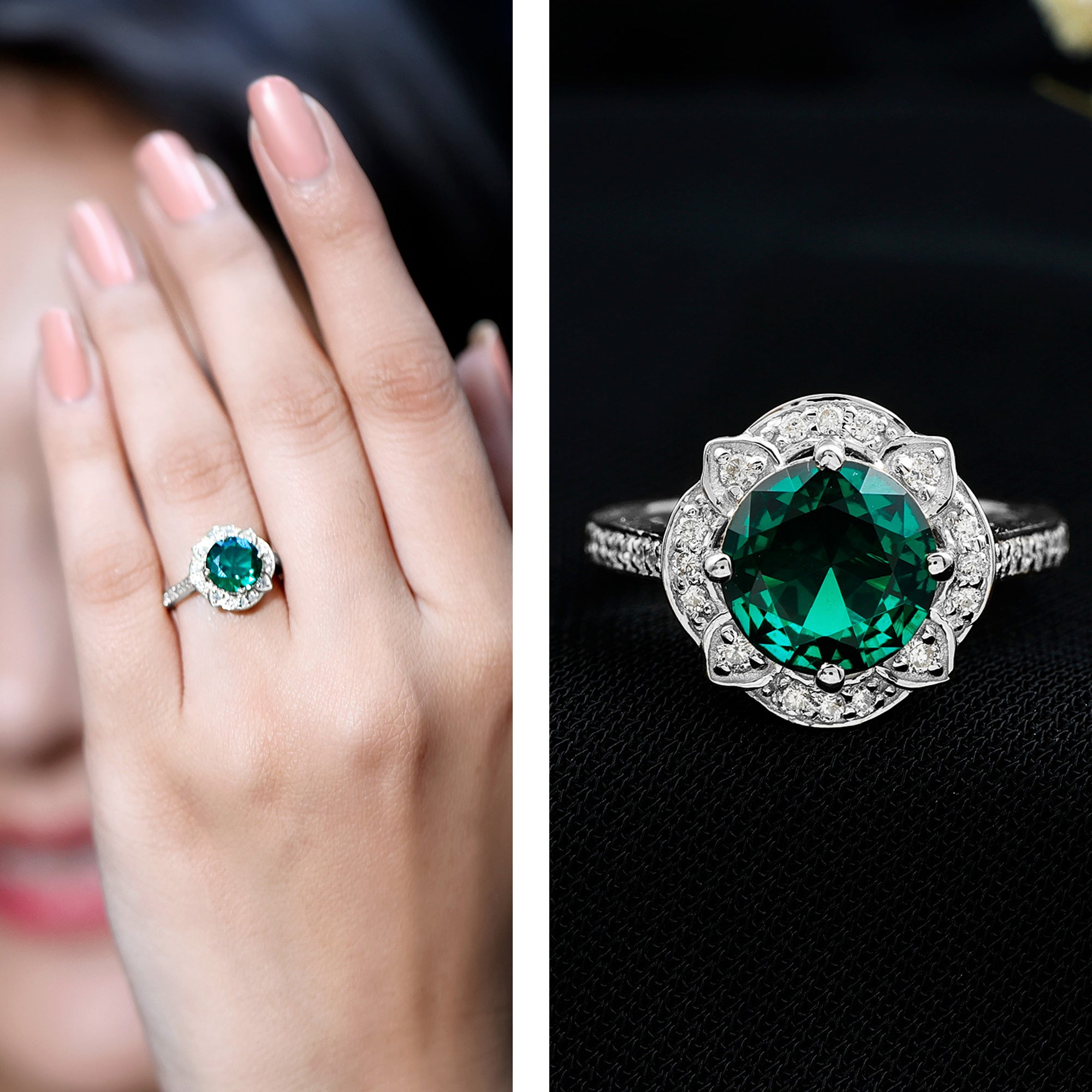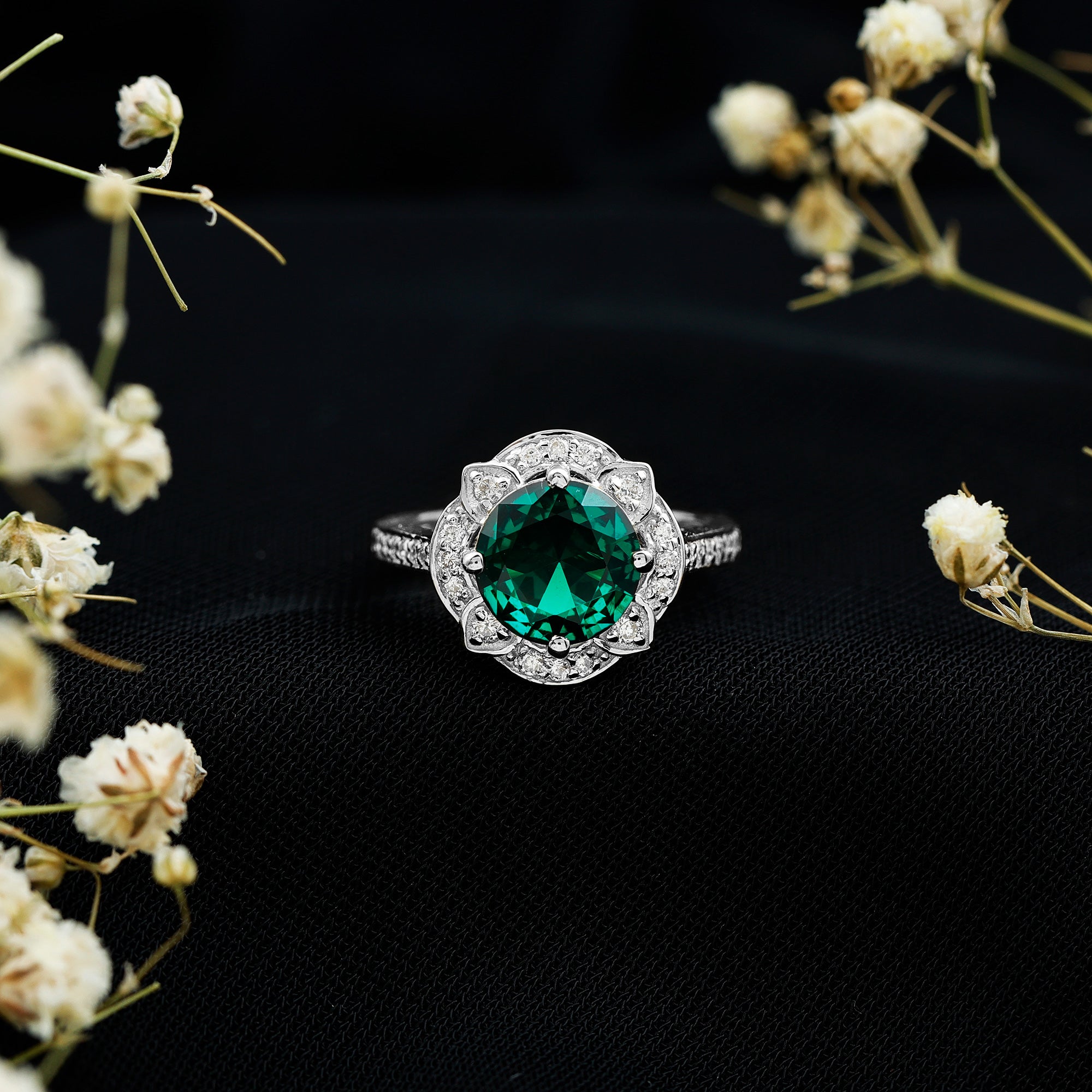 Transport yourself to a bygone era with our Lab Created Emerald Engagement Ring. The centerpiece, a captivating 8 mm Round Created Emerald, is encircled by a halo, exuding vintage charm. The intricately designed shank adds a touch of elegance and character to this timeless piece. This Emerald Diamond Ring not only symbolizes your love but also captures the allure with Aaaa Quality Emerald and Ef-Vs Quality Diamonds, making this Classic Ring a perfect choice for those who appreciate the beauty of vintage aesthetics.