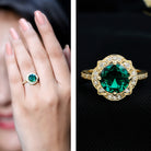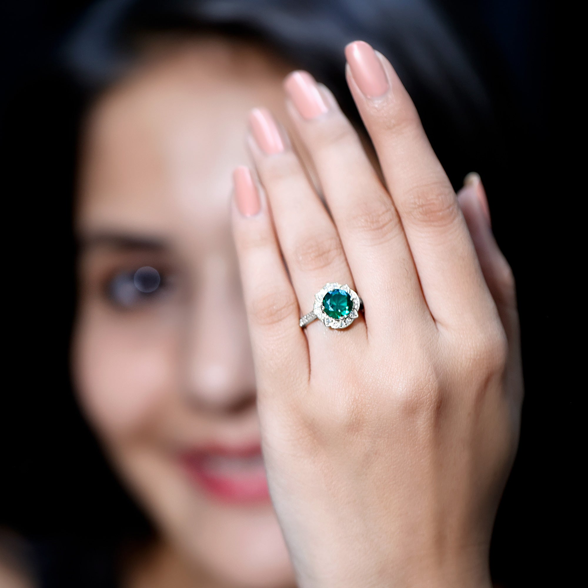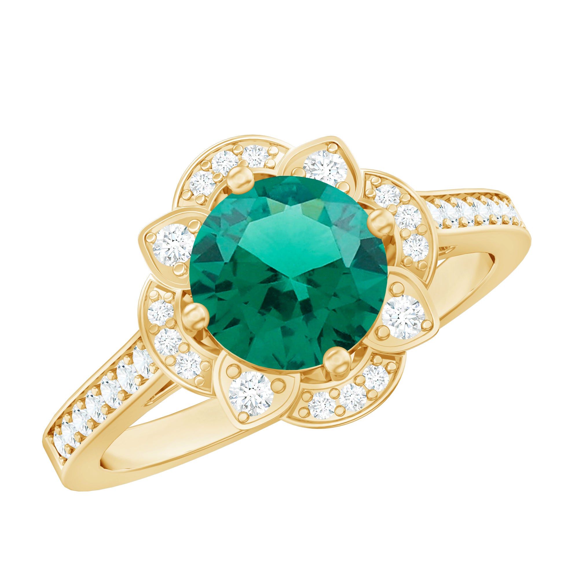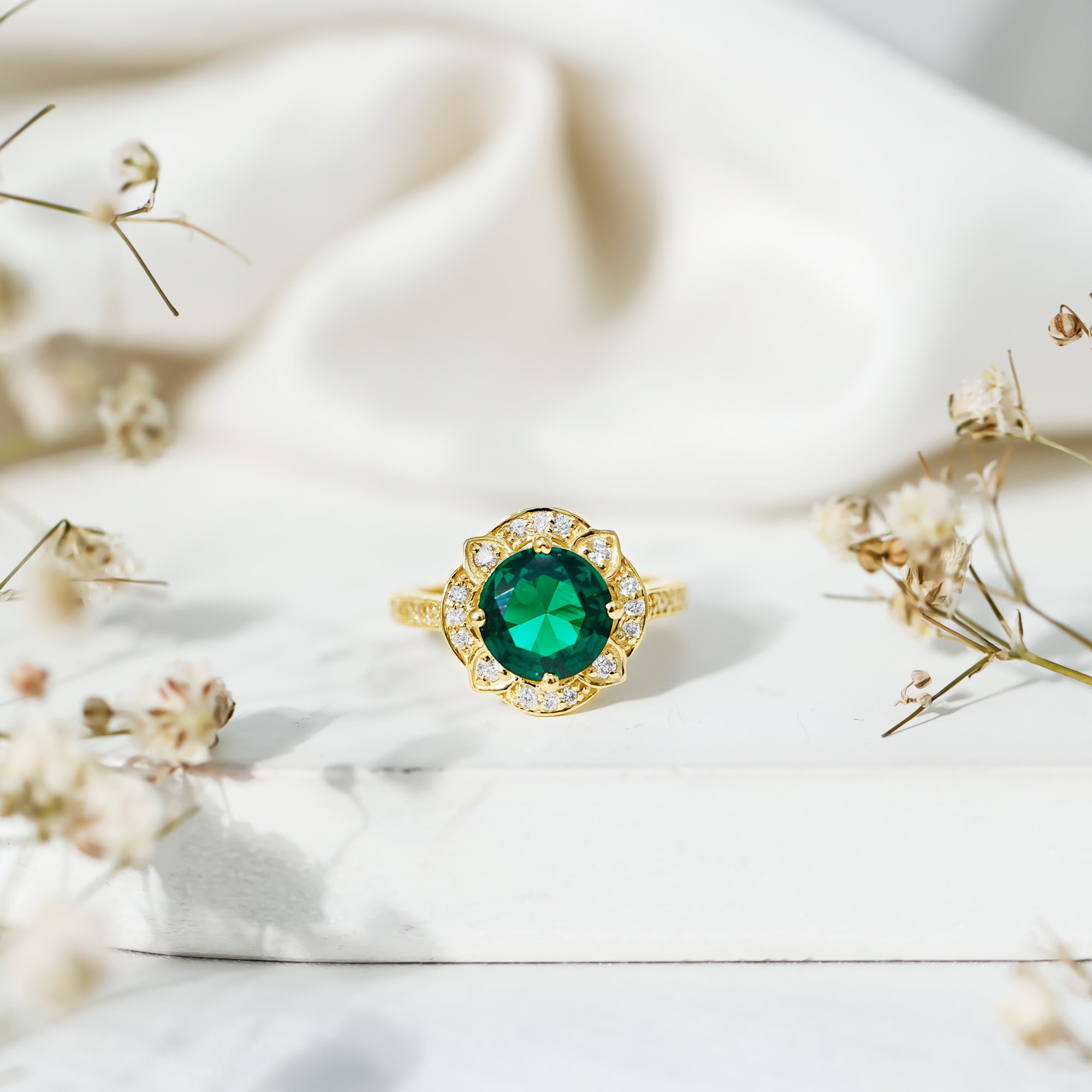 Transport yourself to a bygone era with our Lab Created Emerald Engagement Ring. The centerpiece, a captivating 8 mm Round Created Emerald, is encircled by a halo, exuding vintage charm. The intricately designed shank adds a touch of elegance and character to this timeless piece. This Emerald Diamond Ring not only symbolizes your love but also captures the allure with Aaaa Quality Emerald and Ef-Vs Quality Diamonds, making this Classic Ring a perfect choice for those who appreciate the beauty of vintage aesthetics.